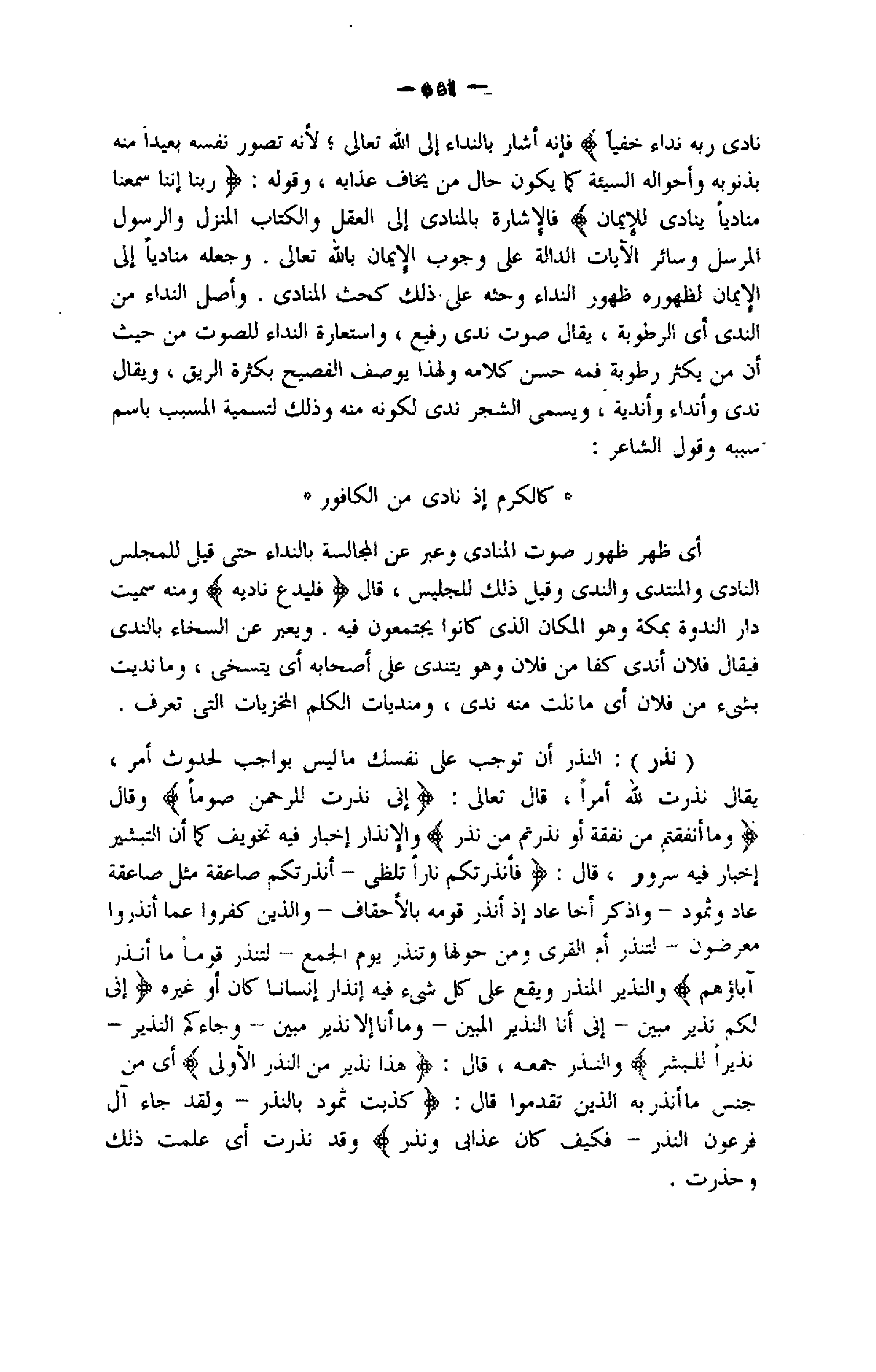 أي ظهر ظهور صوت المنادى وعبر عن المجالسة بالنداء حتى قيل للمجلس النادي والمنتدى والندى وقيل ذلك للجليس، قال فَلْيَدْعُ نادِيَهُ ومنه سميت دار الندوة بمكة وهو المكان الذي كانوا يجتمعون فيه. ويعبر عن السخاء بالندى فيقال فلان أندى كفا من فلان وهو يتندى على أصحابه أي يتسخى، وما نديت بشىء من فلان أي ما نلت منه ندى، ومنديات الكلم المخزيات التي تعرف.