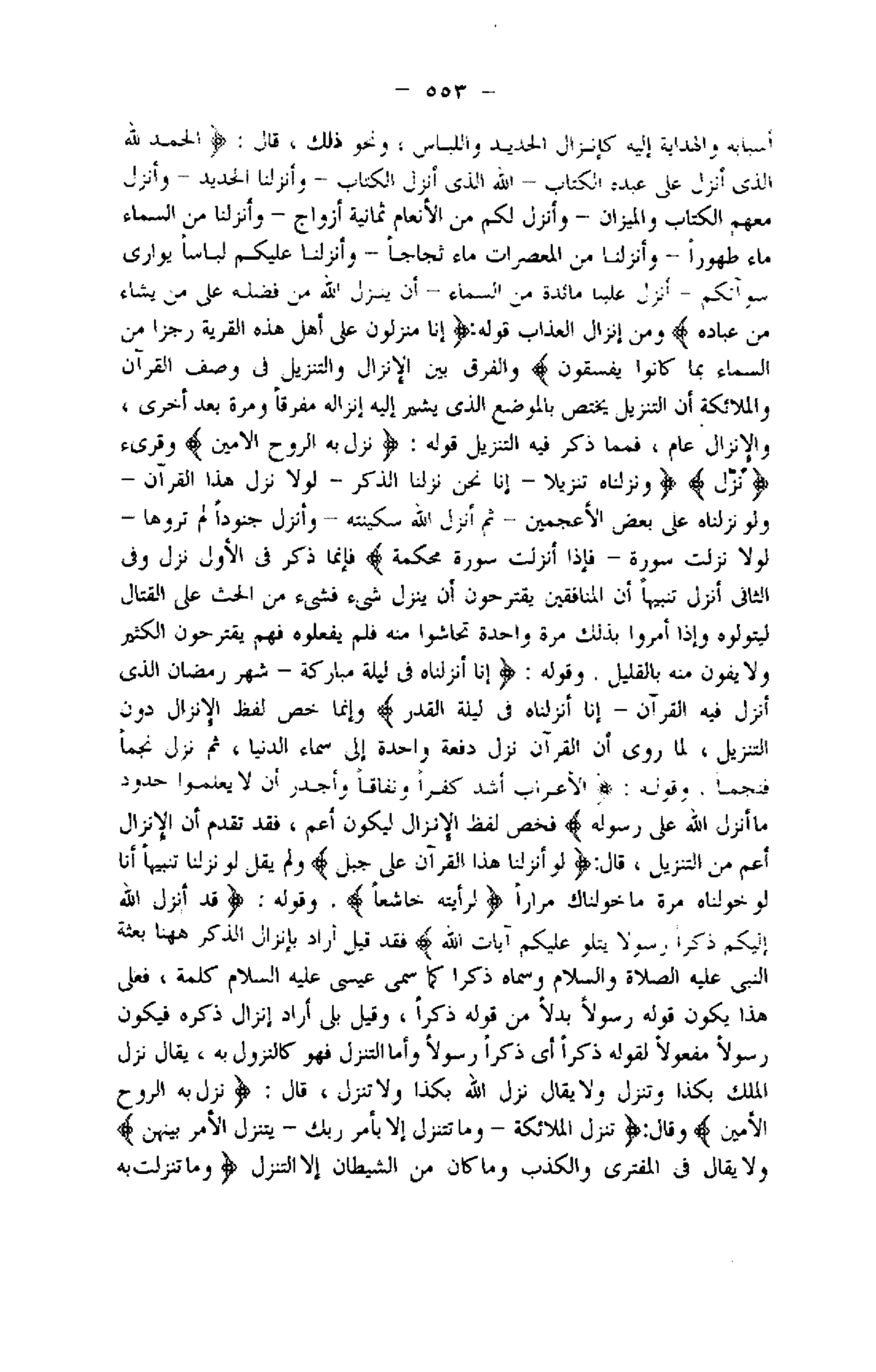 أسبابه والهداية إليه كإنزال الحديد واللباس، ونحو ذلك، قال: الْحَمْدُ لِلَّهِ الَّذِي أَنْزَلَ عَلى عَبْدِهِ الْكِتابَ- اللَّهُ الَّذِي أَنْزَلَ الْكِتابَ- وَأَنْزَلْنَا الْحَدِيدَ- وَأَنْزَلْنا مَعَهُمُ الْكِتابَ وَالْمِيزانَ- وَأَنْزَلَ لَكُمْ مِنَ الْأَنْعامِ ثَمانِيَةَ أَزْواجٍ- وَأَنْزَلْنا مِنَ السَّماءِ ماءً طَهُوراً- وَأَنْزَلْنا مِنَ الْمُعْصِراتِ ماءً ثَجَّاجاً- أَنْزَلْنا عَلَيْكُمْ لِباساً يُوارِي سَوْآتِكُمْ- أَنْزِلْ عَلَيْنا مائِدَةً مِنَ السَّماءِ- أَنْ يُنَزِّلَ اللَّهُ مِنْ فَضْلِهِ عَلى مَنْ يَشاءُ مِنْ عِبادِهِ ومن إنزال العذاب قوله: إِنَّا مُنْزِلُونَ عَلى أَهْلِ هذِهِ الْقَرْيَةِ رِجْزاً مِنَ السَّماءِ بِما كانُوا يَفْسُقُونَ والفرق بين الإنزال والتنزيل فى وصف القرآن والملائكة أن التنزيل يختص بالموضع الذي يشير إليه إنزاله مفرقا ومرة بعد أخرى، والإنزال عام، فمما ذكر فيه التنزيل قوله: نَزَلَ بِهِ الرُّوحُ الْأَمِينُ وقرىء نزل وَنَزَّلْناهُ تَنْزِيلًا- إِنَّا نَحْنُ نَزَّلْنَا الذِّكْرَ- لَوْلا نُزِّلَ هذَا الْقُرْآنُ- وَلَوْ نَزَّلْناهُ عَلى بَعْضِ الْأَعْجَمِينَ- ثُمَّ أَنْزَلَ اللَّهُ سَكِينَتَهُ- وَأَنْزَلَ جُنُوداً لَمْ تَرَوْها- لَوْلا نُزِّلَتْ سُورَةٌ- فَإِذا أُنْزِلَتْ سُورَةٌ مُحْكَمَةٌ- فإنما ذكر فى الأول نزل وفى الثاني أنزل تنبيها أن المنافقين يقترحون أن ينزل شىء فشىء من الحث على القتال ليتولوه وإذا أمروا بذلك مرة واحدة تحاشوا منه فلم يفعلوه فهم يقترحون الكثير ولا يفون منه بالقليل. وقوله: إِنَّا أَنْزَلْناهُ فِي لَيْلَةٍ مُبارَكَةٍ- شَهْرُ رَمَضانَ الَّذِي أُنْزِلَ فِيهِ الْقُرْآنُ- إِنَّا أَنْزَلْناهُ فِي لَيْلَةِ الْقَدْرِ وإنما خص لفظ الإنزال دون التنزيل، لما روى أن القرآن نزل دفعة واحدة إلى سماء الدنيا، ثم نزل نجما فنجما. وقوله: الْأَعْرابُ أَشَدُّ كُفْراً وَنِفاقاً وَأَجْدَرُ أَلَّا يَعْلَمُوا حُدُودَ ما أَنْزَلَ اللَّهُ عَلى رَسُولِهِ فخص لفظ الإنزال ليكون أعم، فقد تقدم أن الإنزال أعم من التنزيل، قال: لَوْ أَنْزَلْنا هذَا الْقُرْآنَ عَلى جَبَلٍ ولم يقل لو نزلنا تنبيها أنا لو خولناه مرة ما خولناك مرارا لَرَأَيْتَهُ خاشِعاً. وقوله: قَدْ أَنْزَلَ اللَّهُ إِلَيْكُمْ ذِكْراً رَسُولًا يَتْلُوا عَلَيْكُمْ آياتِ اللَّهِ فقد قيل أراد بإنزال الذكر هاهنا بعثة النبي عليه الصلاة والسلام وسماه ذكرا كما سمى عيسى عليه السلام كلمة، فعلى هذا يكون قوله رسولا بدلا من قوله ذكرا، وقيل بلى أراد إنزال ذكره فيكون رسولا مفعولا لقوله ذكرا أي ذكرا رسولا وأما التنزل فهو كالنزول به، يقال نزل الملك بكذا وتنزل ولا يقال نزل اللَّه بكذا ولا تنزل، قال: نَزَلَ بِهِ الرُّوحُ الْأَمِينُ وقال: تَنَزَّلُ الْمَلائِكَةُ- وَما نَتَنَزَّلُ إِلَّا بِأَمْرِ رَبِّكَ- يَتَنَزَّلُ الْأَمْرُ بَيْنَهُنَّ ولا يقال فى المفترى والكذب وما كان من الشيطان إلا التنزل وَما تَنَزَّلَتْ بِهِ