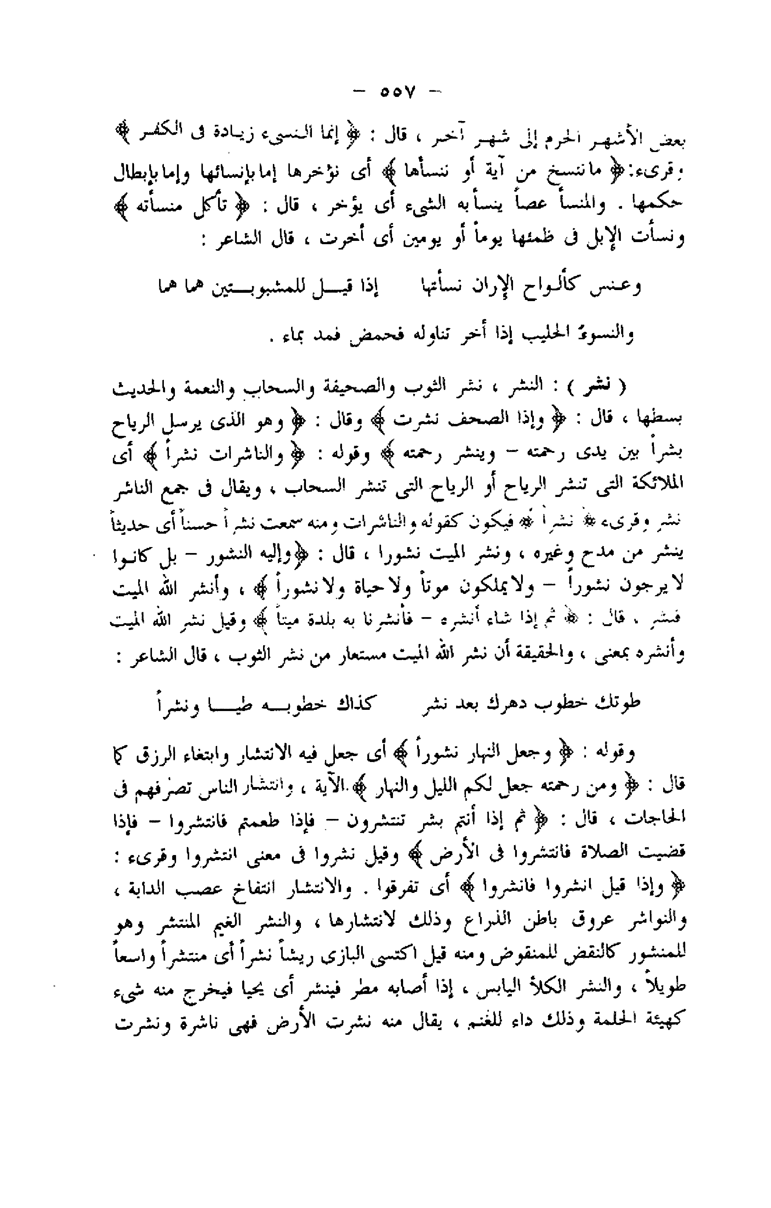 (نشر) : النشر، نشر الثوب والصحيفة والسحاب والنعمة والحديث بسطها، قال: وَإِذَا الصُّحُفُ نُشِرَتْ وقال: وَهُوَ الَّذِي يُرْسِلُ الرِّياحَ بُشْراً بَيْنَ يَدَيْ رَحْمَتِهِ- وَيَنْشُرُ رَحْمَتَهُ وقوله: وَالنَّاشِراتِ نَشْراً أي الملائكة التي تنشر الرياح أو الرياح التي تنشر السحاب، ويقال فى جمع الناشر نشر وقرىء نَشْراً فيكون كقوله والناشرات ومنه سمعت نشرا حسنا أي حديثا ينشر من مدح وغيره، ونشر الميت نشورا، قال: وَإِلَيْهِ النُّشُورُ- بَلْ كانُوا لا يَرْجُونَ نُشُوراً- وَلا يَمْلِكُونَ مَوْتاً وَلا حَياةً وَلا نُشُوراً، وأنشر اللَّه الميت فنشر، قال: ثُمَّ إِذا شاءَ أَنْشَرَهُ- فَأَنْشَرْنا بِهِ بَلْدَةً مَيْتاً وقيل نشر اللَّه الميت وأنشره بمعنى، والحقيقة أن نشر اللَّه الميت مستعار من نشر الثوب، قال الشاعر: