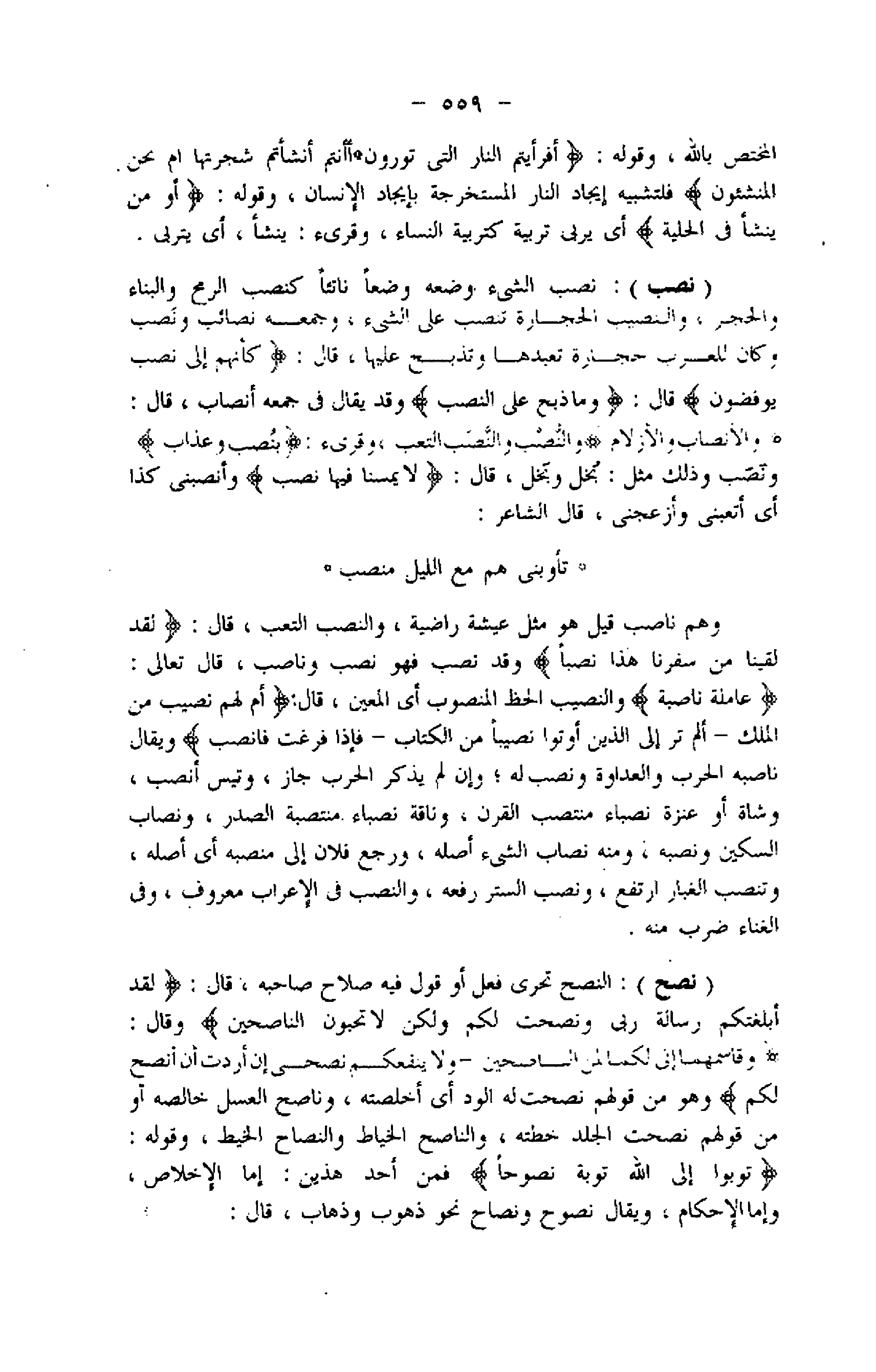 (نصب) : نصب الشيء وضعه وضعا ناتئا كنصب الرمح والبناء والحجر، والنصيب الحجارة تنصب على الشيء، وجمعه نصائب ونصب وكان للعرب حجارة تعبدها وتذبح عليها، قال: كَأَنَّهُمْ إِلى نُصُبٍ يُوفِضُونَ قال: وَما ذُبِحَ عَلَى النُّصُبِ وقد يقال فى جمعه أنصاب، قال: