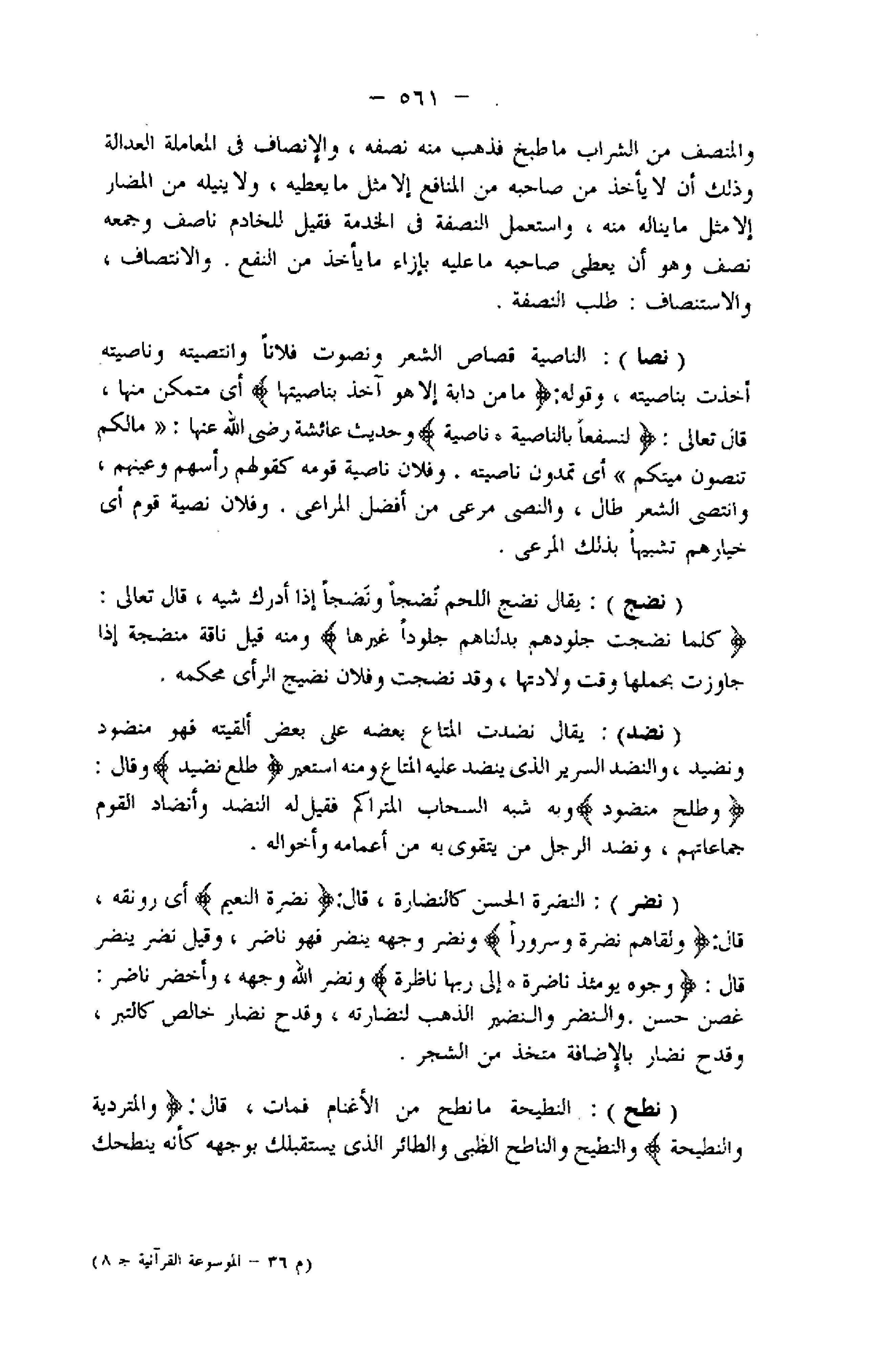 والمنصف من الشراب ما طبخ فذهب منه نصفه، والإنصاف فى المعاملة العدالة وذلك أن لا يأخذ من صاحبه من المنافع إلا مثل ما يعطيه، ولا ينيله من المضار إلا مثل ما يناله منه، واستعمل النصفة فى الخدمة فقيل للخادم ناصف وجمعه نصف وهو أن يعطى صاحبه ما عليه بإزاء ما يأخذ من النفع. والانتصاف، والاستنصاف: طلب النصفة.