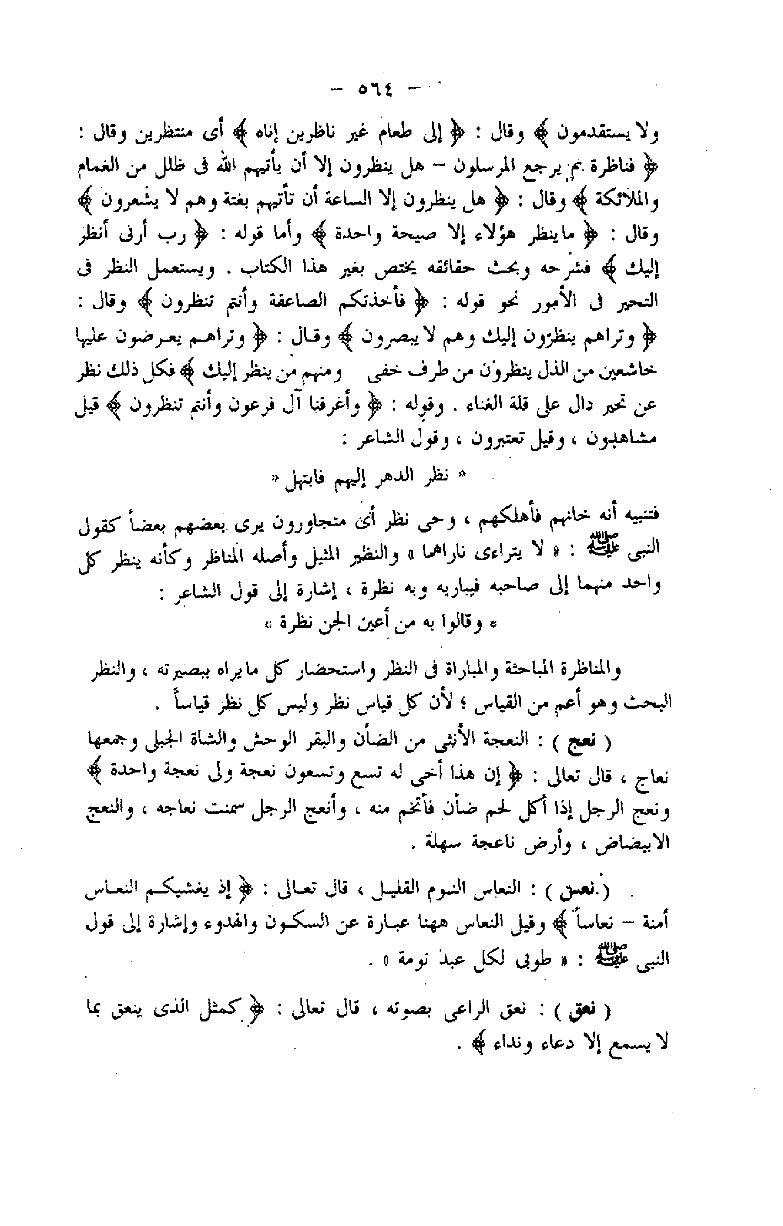 فَناظِرَةٌ بِمَ يَرْجِعُ الْمُرْسَلُونَ- هَلْ يَنْظُرُونَ إِلَّا أَنْ يَأْتِيَهُمُ اللَّهُ فِي ظُلَلٍ مِنَ الْغَمامِ وَالْمَلائِكَةُ وقال: هَلْ يَنْظُرُونَ إِلَّا السَّاعَةَ أَنْ تَأْتِيَهُمْ بَغْتَةً وَهُمْ لا يَشْعُرُونَ وقال: ما يَنْظُرُ هؤُلاءِ إِلَّا صَيْحَةً واحِدَةً وأما قوله: رَبِّ أَرِنِي أَنْظُرْ إِلَيْكَ فشرحه وبحث حقائقه يختص بغير هذا الكتاب. ويستعمل النظر فى التحير فى الأمور نحو قوله: فَأَخَذَتْكُمُ الصَّاعِقَةُ وَأَنْتُمْ تَنْظُرُونَ وقال: