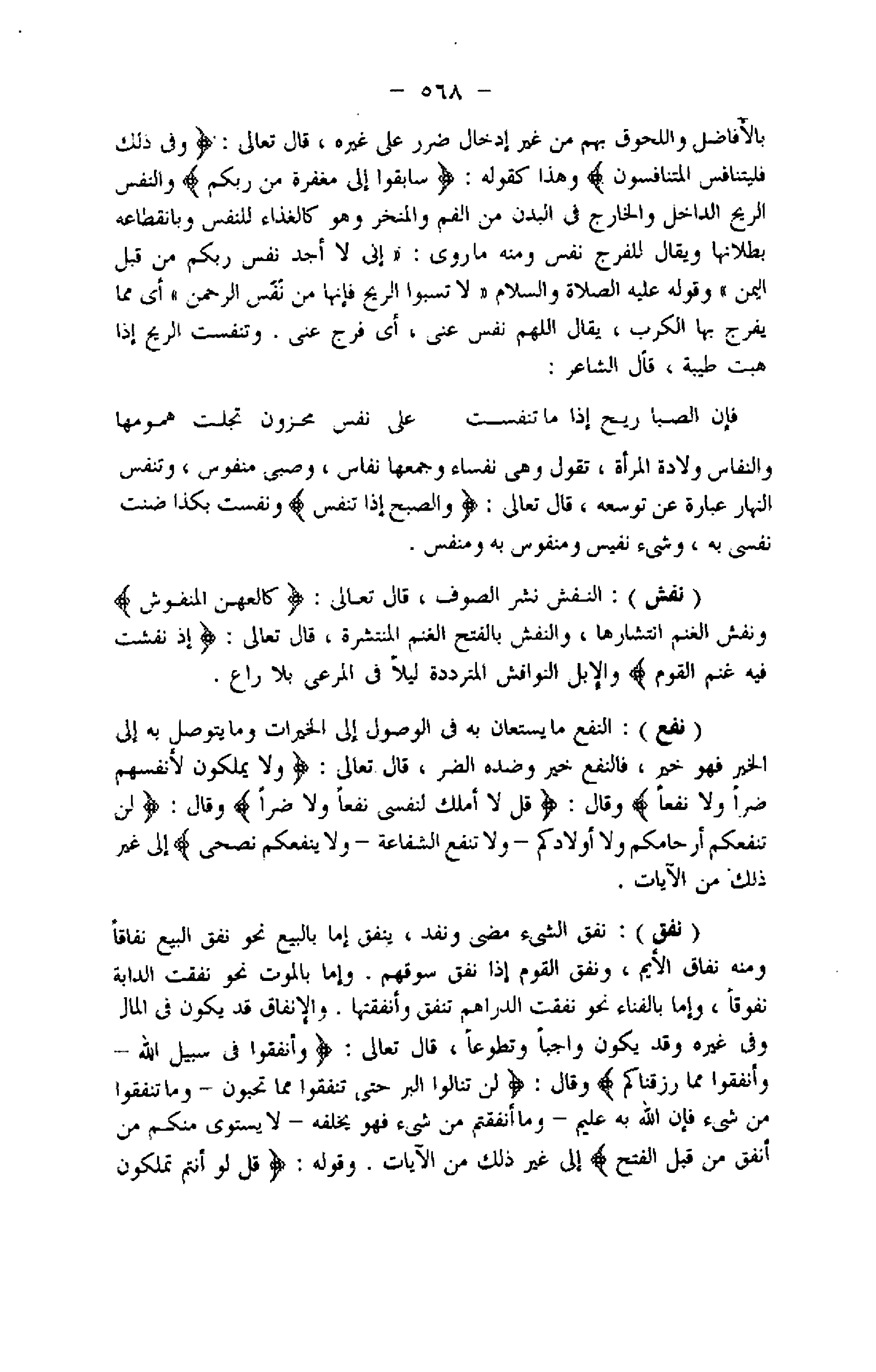 (نفق) : نفق الشيء مضى ونفد، ينفق إما بالبيع نحو نفق البيع نفاقا ومنه نفاق الأيم، ونفق القوم إذا نفق سوقهم. وإما بالموت نحو نفقت الدابة نفوقا، وإما بالفناء نحو نفقت الدراهم تنفق وأنفقتها. والإنفاق قد يكون فى المال وفى غيره وقد يكون واجبا وتطوعا، قال تعالى: وَأَنْفِقُوا فِي سَبِيلِ اللَّهِ- وَأَنْفِقُوا مِنْ ما رَزَقْناكُمْ وقال: لَنْ تَنالُوا الْبِرَّ حَتَّى تُنْفِقُوا مِمَّا تُحِبُّونَ- وَما تُنْفِقُوا مِنْ شَيْءٍ فَإِنَّ اللَّهَ بِهِ عَلِيمٌ- وَما أَنْفَقْتُمْ مِنْ شَيْءٍ فَهُوَ يُخْلِفُهُ- لا يَسْتَوِي مِنْكُمْ مَنْ أَنْفَقَ مِنْ قَبْلِ الْفَتْحِ إلى غير ذلك من الآيات. وقوله: قُلْ لَوْ أَنْتُمْ تَمْلِكُونَ