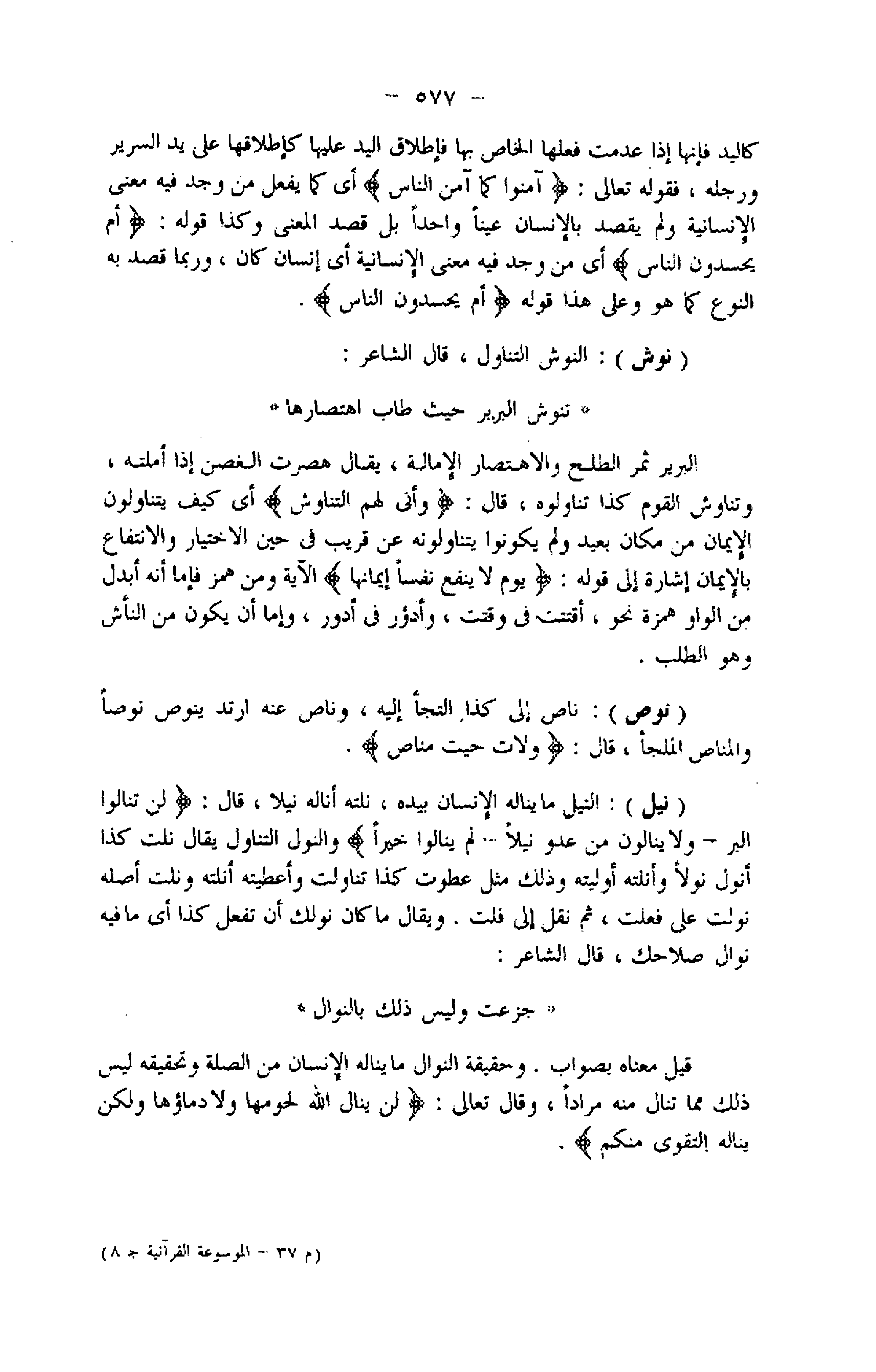(نيل) : النيل ما يناله الإنسان بيده، نلته أناله نيلا، قال: لَنْ تَنالُوا الْبِرَّ- وَلا يَنالُونَ مِنْ عَدُوٍّ نَيْلًا- لَمْ يَنالُوا خَيْراً والنول التناول يقال نلت كذا أنول نولا وأنلته أوليته وذلك مثل عطوت كذا تناولت وأعطيته أنلته ونلت أصله نولت على فعلت، ثم نقل إلى فلت. ويقال ما كان نولك أن تفعل كذا أي ما فيه نوال صلاحك، قال الشاعر: