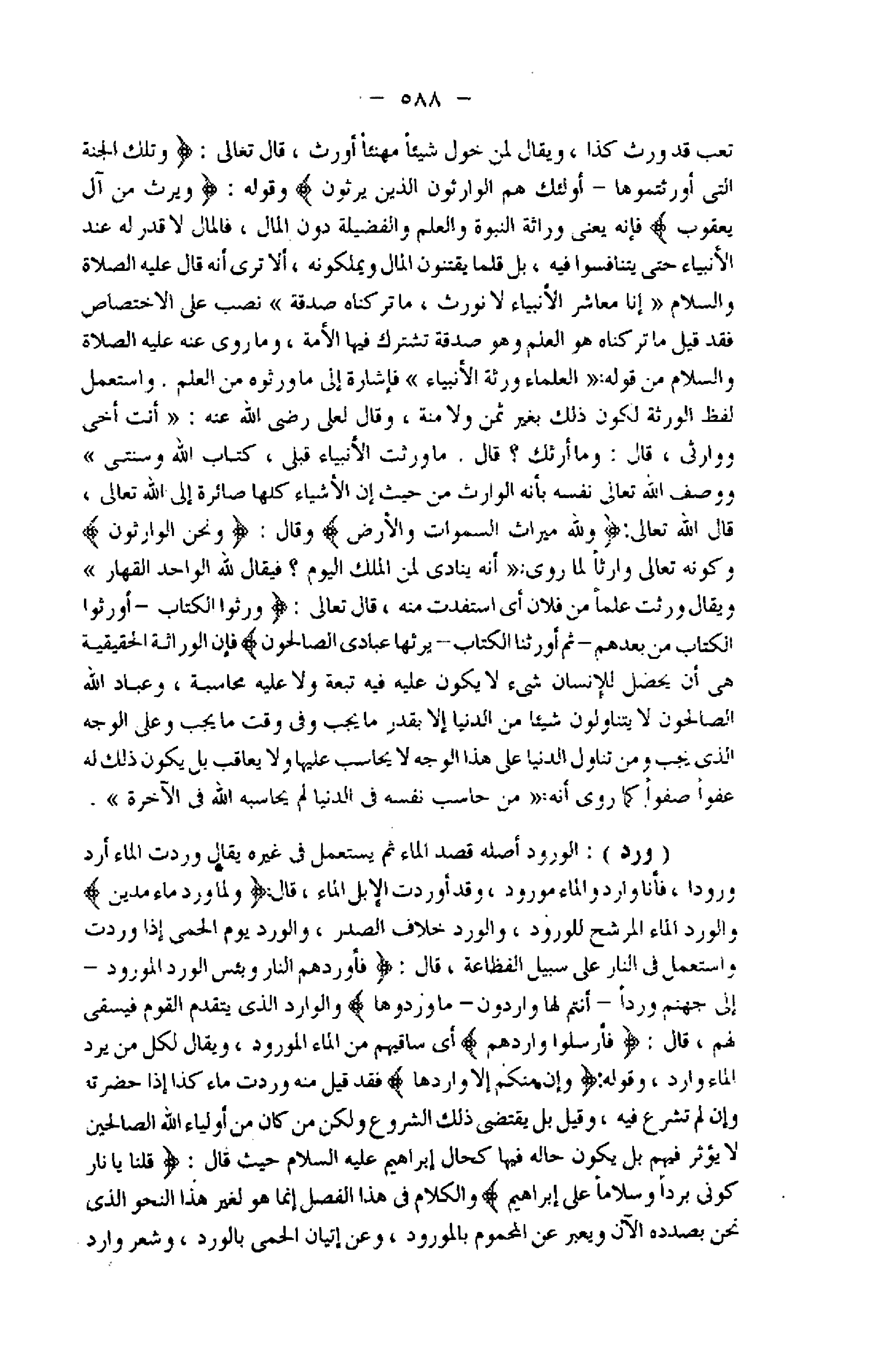 ويقال ورثت علما من فلان أي استفدت منه، قال تعالى: وَرِثُوا الْكِتابَ- أُورِثُوا الْكِتابَ مِنْ بَعْدِهِمْ- ثُمَّ أَوْرَثْنَا الْكِتابَ- يَرِثُها عِبادِيَ الصَّالِحُونَ فإن الوراثة الحقيقية هى أن يحصل للإنسان شىء لا يكون عليه فيه تبعة ولا عليه محاسبة، وعباد اللَّه الصالحون لا يتناولون شيئا من الدنيا إلا بقدر ما يجب وفى وقت ما يجب وعلى الوجه الذي يجب ومن تناول الدنيا على هذا الوجه لا يحاسب عليها ولا يعاقب بل يكون ذلك له عفوا صفوا كما