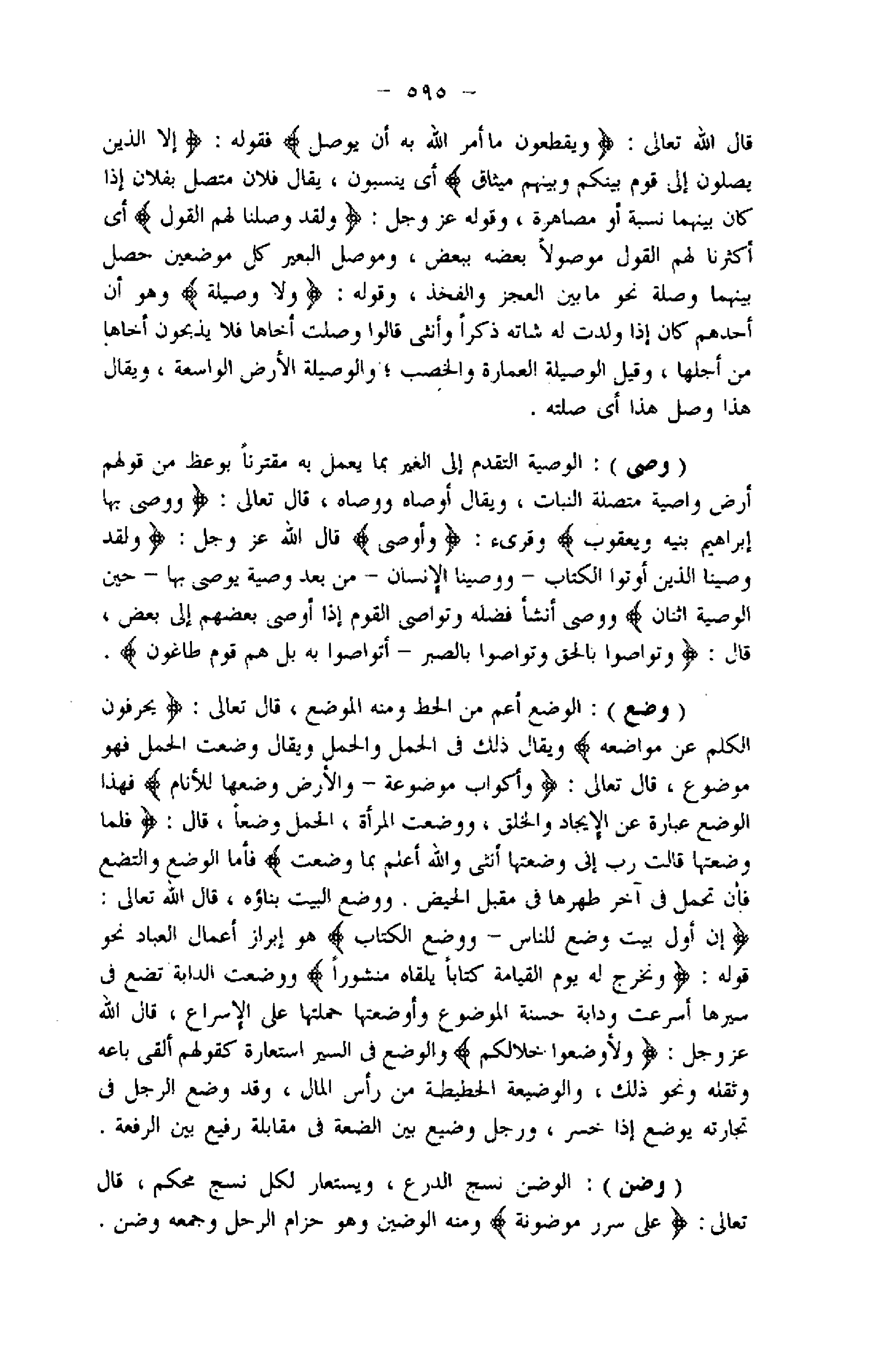 قال اللَّه تعالى: وَيَقْطَعُونَ ما أَمَرَ اللَّهُ بِهِ أَنْ يُوصَلَ فقوله: إِلَّا الَّذِينَ يَصِلُونَ إِلى قَوْمٍ بَيْنَكُمْ وَبَيْنَهُمْ مِيثاقٌ أي ينسبون، يقال فلان متصل بفلان إذا كان بينهما نسبة أو مصاهرة، وقوله عز وجل: وَلَقَدْ وَصَّلْنا لَهُمُ الْقَوْلَ أي أكثرنا لهم القول موصولا بعضه ببعض، وموصل البعير كل موضعين حصل بينهما وصلة نحو ما بين العجز والفخذ، وقوله: وَلا وَصِيلَةٍ