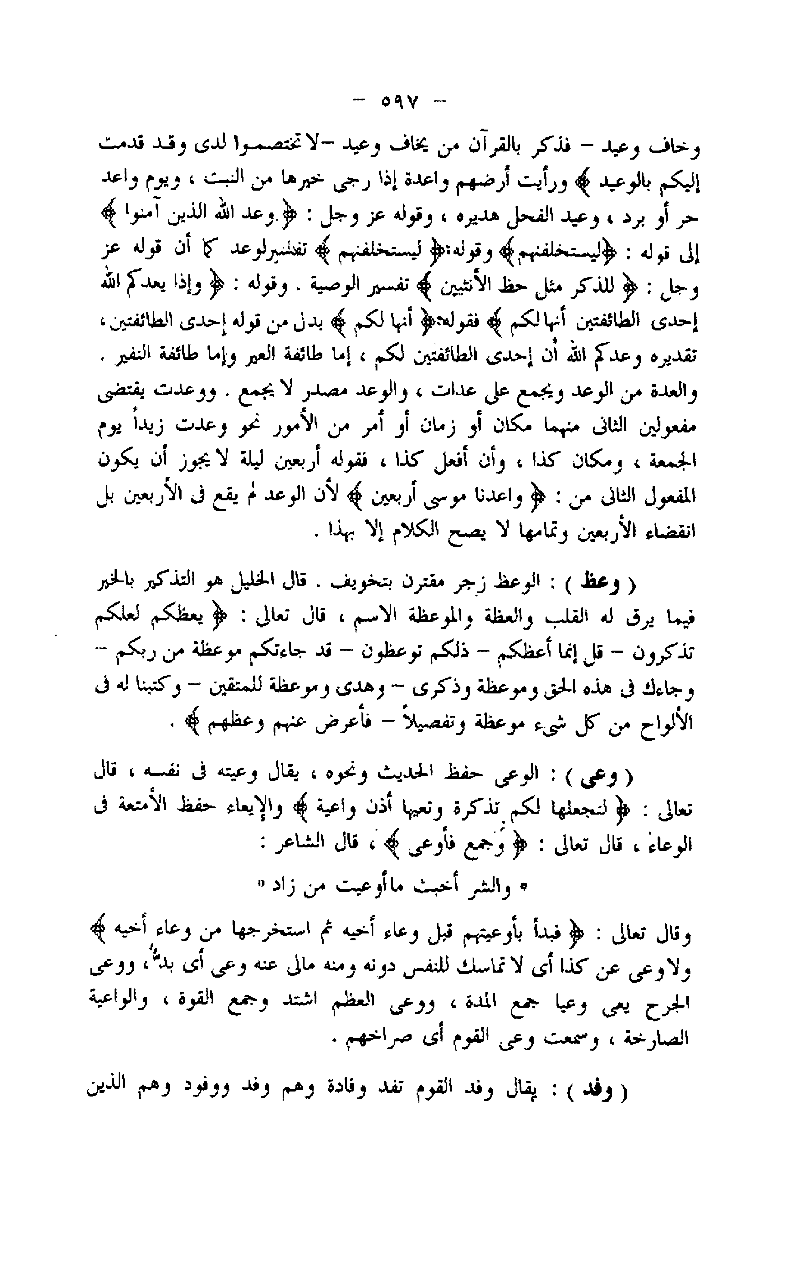 - فَذَكِّرْ بِالْقُرْآنِ مَنْ يَخافُ وَعِيدِ- لا تَخْتَصِمُوا لَدَيَّ وَقَدْ قَدَّمْتُ إِلَيْكُمْ بِالْوَعِيدِ ورأيت أرضهم واعدة إذا رجى خيرها من النبت، ويوم واعد حر أو برد، وعيد الفحل هديره، وقوله عز وجل: وَعَدَ اللَّهُ الَّذِينَ آمَنُوا إلى قوله: لَيَسْتَخْلِفَنَّهُمْ وقوله: لَيَسْتَخْلِفَنَّهُمْ تفسير لوعد كما أن قوله عزّ وجلّ: لِلذَّكَرِ مِثْلُ حَظِّ الْأُنْثَيَيْنِ تفسير الوصية. وقوله: وَإِذْ يَعِدُكُمُ اللَّهُ إِحْدَى الطَّائِفَتَيْنِ أَنَّها لَكُمْ فقوله: أَنَّها لَكُمْ بدل من قوله إحدى الطائفتين، تقديره وعدكم اللَّه أن إحدى الطائفتين لكم، إما طائفة العير وإما طائفة النفير.