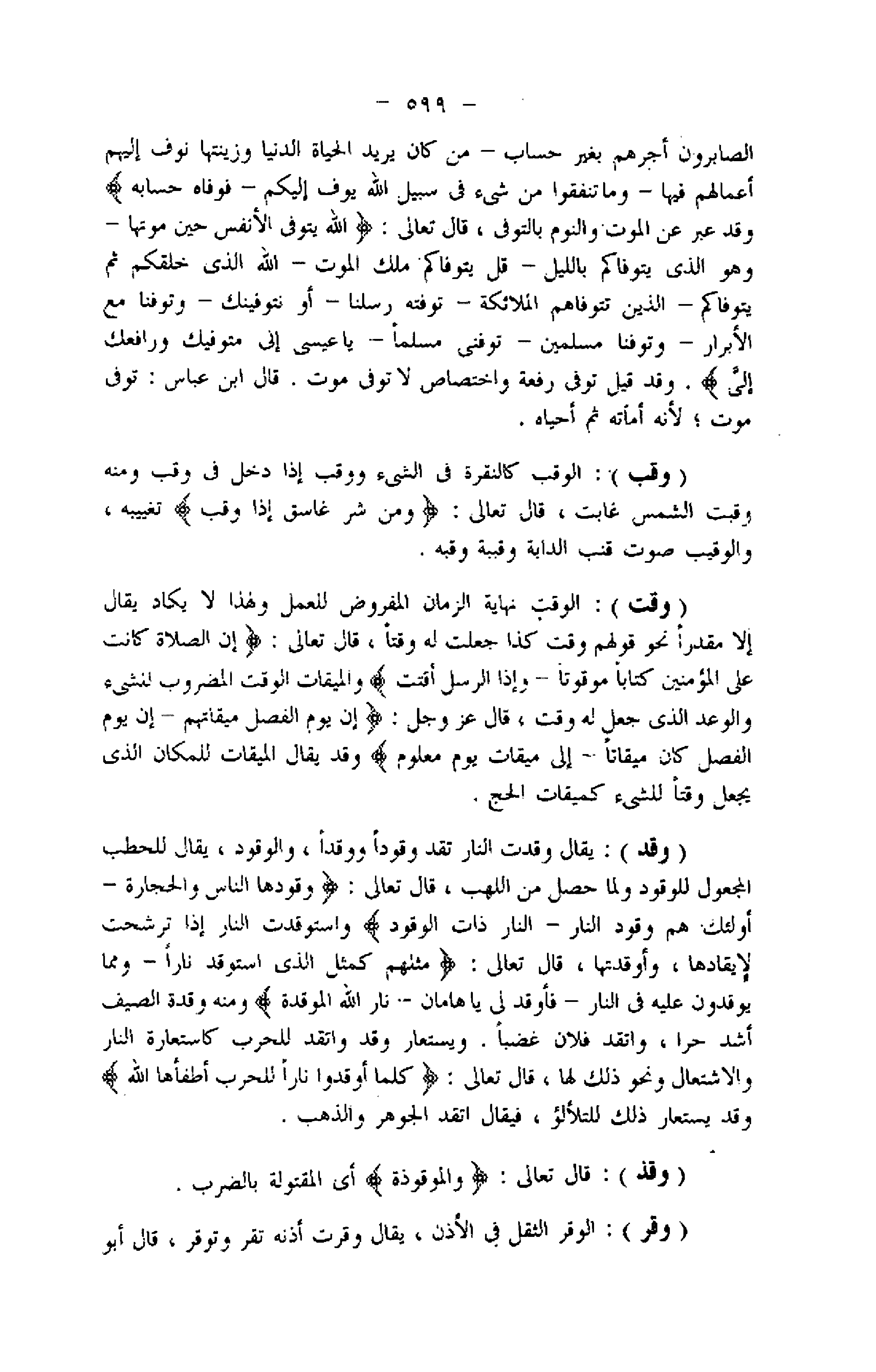 (وقد) : يقال وقدت النار تقد وقودا ووقدا، والوقود، يقال للحطب المجعول للوقود ولما حصل من اللهب، قال تعالى: وَقُودُهَا النَّاسُ وَالْحِجارَةُ- أُولئِكَ هُمْ وَقُودُ النَّارِ- النَّارِ ذاتِ الْوَقُودِ واستوقدت النار إذا ترشحت لإيقادها، وأوقدتها، قال تعالى: مَثَلُهُمْ كَمَثَلِ الَّذِي اسْتَوْقَدَ ناراً- وَمِمَّا يُوقِدُونَ عَلَيْهِ فِي النَّارِ- فَأَوْقِدْ لِي يا هامانُ- نارُ اللَّهِ الْمُوقَدَةُ ومنه وقدة الصيف أشد حرا، واتقد فلان غضبا. ويستعار وقد واتقد للحرب كاستعارة النار والاشتغال ونحو ذلك لها، قال تعالى: كُلَّما أَوْقَدُوا ناراً لِلْحَرْبِ أَطْفَأَهَا اللَّهُ وقد يستعار ذلك للتلألؤ، فيقال اتقد الجوهر والذهب.