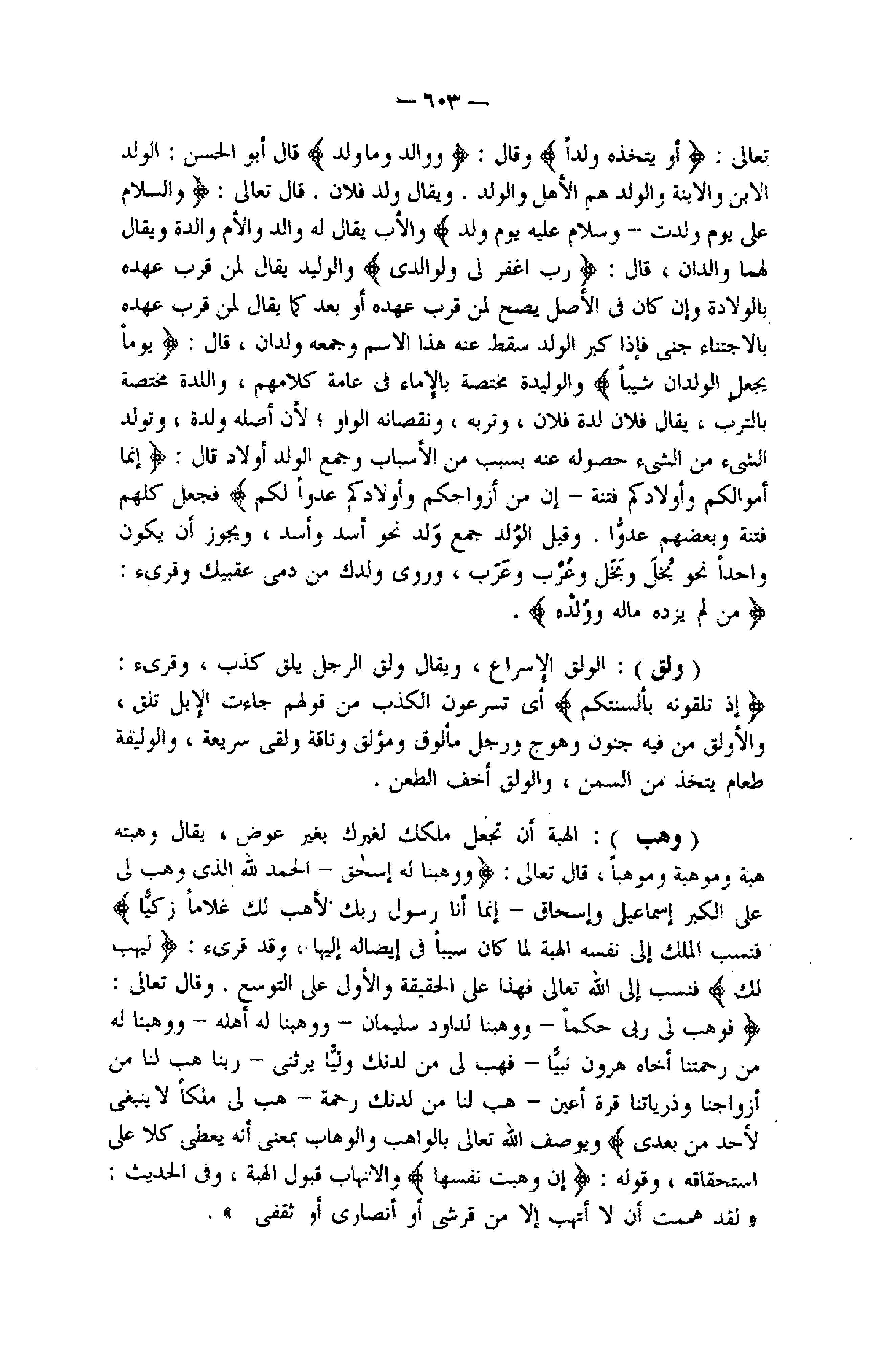 فَوَهَبَ لِي رَبِّي حُكْماً- وَوَهَبْنا لِداوُدَ سُلَيْمانَ- وَوَهَبْنا لَهُ أَهْلَهُ- وَوَهَبْنا لَهُ مِنْ رَحْمَتِنا أَخاهُ هارُونَ نَبِيًّا- فَهَبْ لِي مِنْ لَدُنْكَ وَلِيًّا يَرِثُنِي- رَبَّنا هَبْ لَنا مِنْ أَزْواجِنا وَذُرِّيَّاتِنا قُرَّةَ أَعْيُنٍ- هَبْ لَنا مِنْ لَدُنْكَ رَحْمَةً- هَبْ لِي مُلْكاً لا يَنْبَغِي لِأَحَدٍ مِنْ بَعْدِي ويوصف اللَّه تعالى بالواهب والوهاب بمعنى أنه يعطى كلا على استحقاقه، وقوله: إِنْ وَهَبَتْ نَفْسَها والاتهاب قبول الهبة،