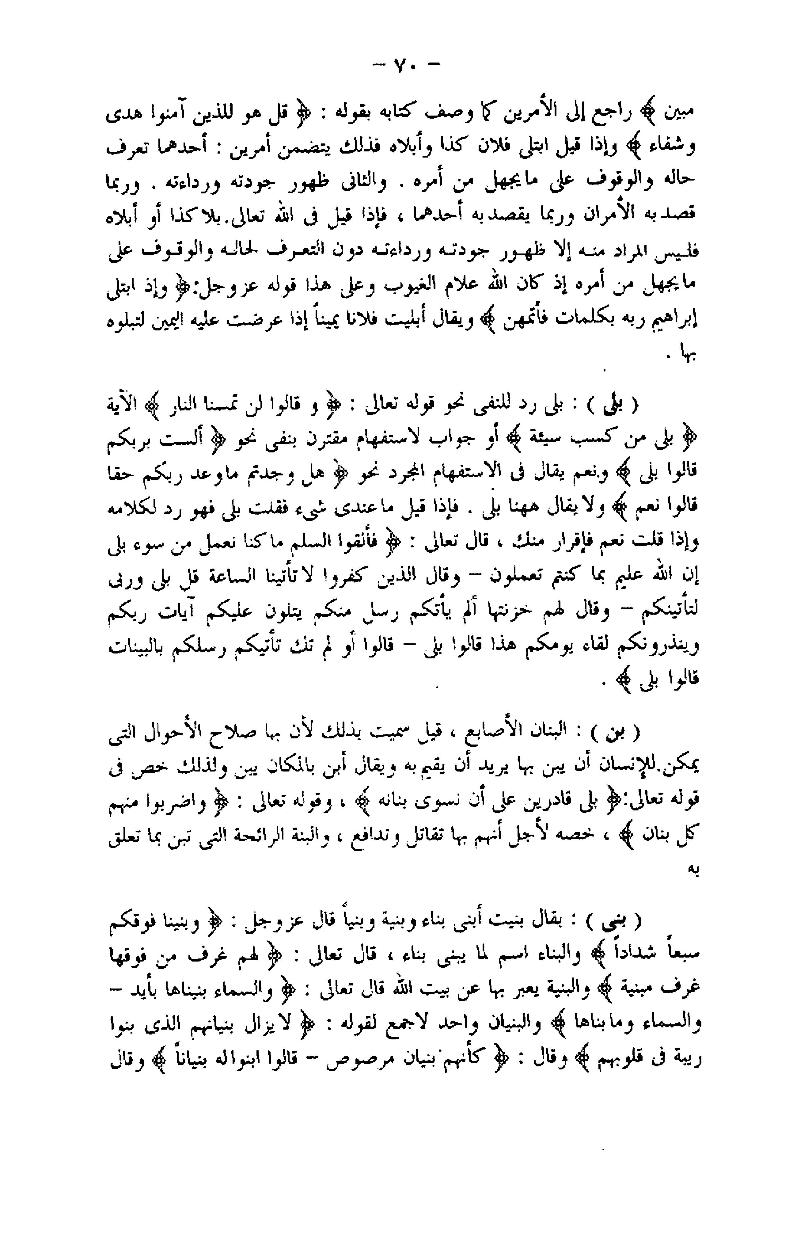 (بلى) : بلى رد للنفى نحو قوله تعالى: وَقالُوا لَنْ تَمَسَّنَا النَّارُ الآية بَلى مَنْ كَسَبَ سَيِّئَةً أو جواب لاستفهام مقترن بنفي نحو أَلَسْتُ بِرَبِّكُمْ قالُوا بَلى ونعم يقال فى الاستفهام المجرد نحو فَهَلْ وَجَدْتُمْ ما وَعَدَ رَبُّكُمْ حَقًّا قالُوا نَعَمْ ولا يقال هاهنا بلى. فإذا قيل ما عندى شىء فقلت بلى فهو رد لكلامه وإذا قلت نعم فإقرار منك، قال تعالى: فَأَلْقَوُا السَّلَمَ ما كُنَّا نَعْمَلُ مِنْ سُوءٍ بَلى إِنَّ اللَّهَ عَلِيمٌ بِما كُنْتُمْ تَعْمَلُونَ- وَقالَ الَّذِينَ كَفَرُوا لا تَأْتِينَا السَّاعَةُ قُلْ بَلى وَرَبِّي لَتَأْتِيَنَّكُمْ- وَقالَ لَهُمْ خَزَنَتُها أَلَمْ يَأْتِكُمْ رُسُلٌ مِنْكُمْ يَتْلُونَ عَلَيْكُمْ آياتِ رَبِّكُمْ وَيُنْذِرُونَكُمْ لِقاءَ يَوْمِكُمْ هذا قالُوا بَلى - قالُوا أَوَلَمْ تَكُ تَأْتِيكُمْ رُسُلُكُمْ بِالْبَيِّناتِ قالُوا بَلى.