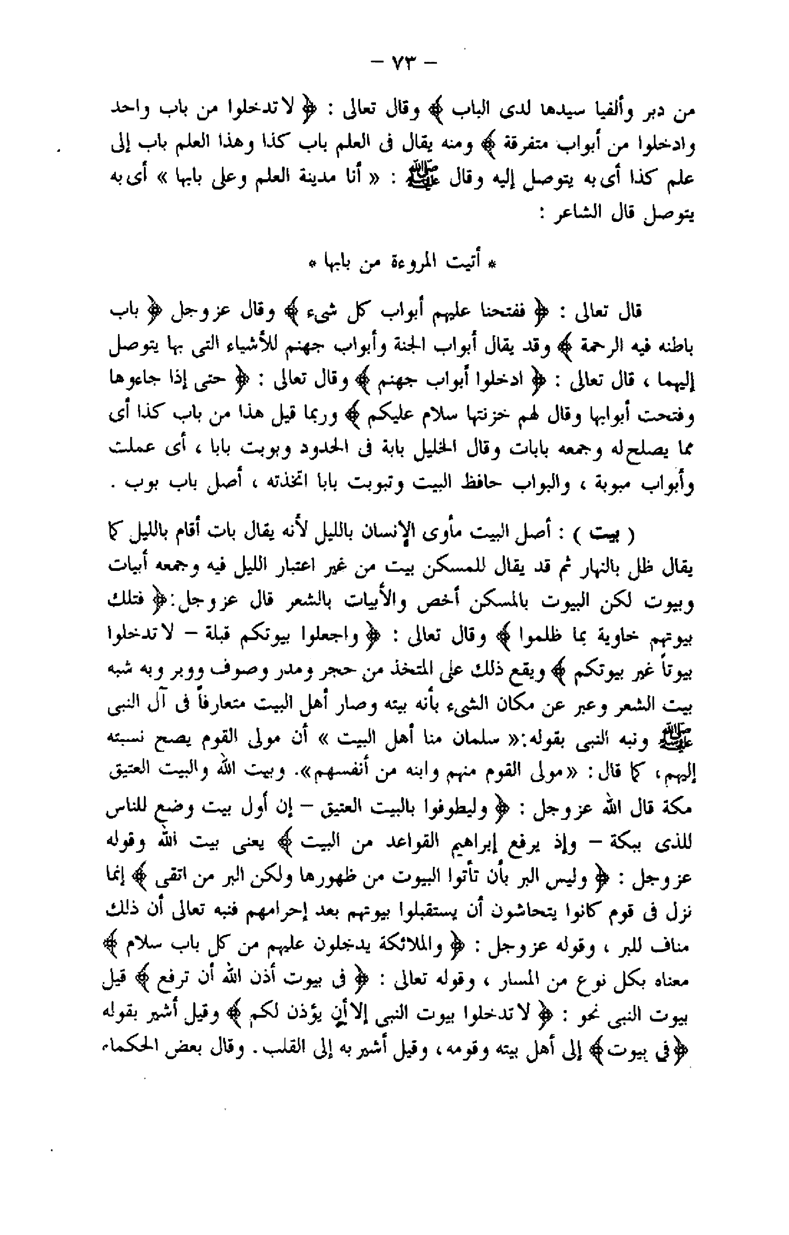 وبيت اللَّه والبيت العتيق مكة قال اللَّه عزّ وجلّ: وَلْيَطَّوَّفُوا بِالْبَيْتِ الْعَتِيقِ- إِنَّ أَوَّلَ بَيْتٍ وُضِعَ لِلنَّاسِ لَلَّذِي بِبَكَّةَ- وَإِذْ يَرْفَعُ إِبْراهِيمُ الْقَواعِدَ مِنَ الْبَيْتِ يعنى بيت اللَّه وقوله عزّ وجلّ: وَلَيْسَ الْبِرُّ بِأَنْ تَأْتُوا الْبُيُوتَ مِنْ ظُهُورِها وَلكِنَّ الْبِرَّ مَنِ اتَّقى إنما نزل فى قوم كانوا يتحاشون أن يستقبلوا بيوتهم بعد إحرامهم فنبه تعالى أن ذلك مناف للبر، وقوله عزّ وجلّ: وَالْمَلائِكَةُ يَدْخُلُونَ عَلَيْهِمْ مِنْ كُلِّ بابٍ سَلامٌ معناه بكل نوع من المسار، وقوله تعالى: فِي بُيُوتٍ أَذِنَ اللَّهُ أَنْ تُرْفَعَ قيل بيوت النبي نحو: لا تَدْخُلُوا بُيُوتَ النَّبِيِّ إِلَّا أَنْ يُؤْذَنَ لَكُمْ وقيل أشير بقوله فِي بُيُوتٍ إلى أهل بيته وقومه، وقيل أشير به إلى القلب. وقال بعض الحكماء