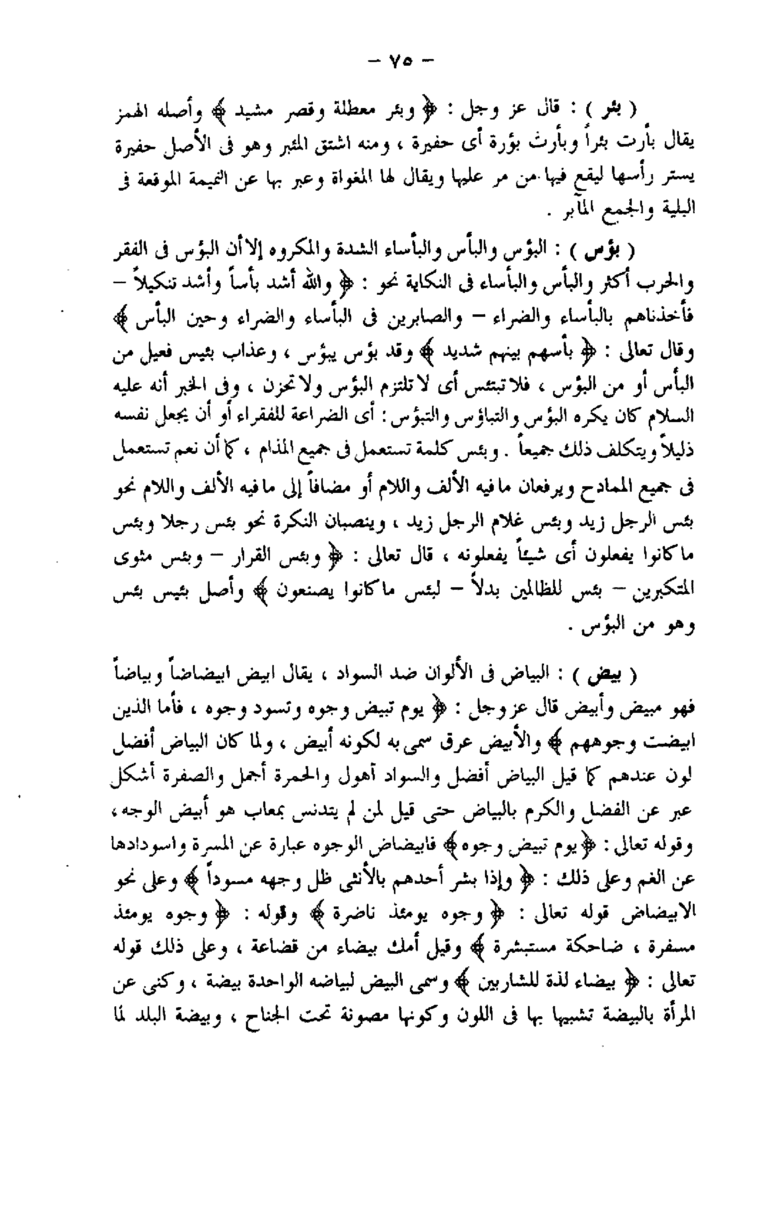 (بيض) : البياض فى الألوان ضد السواد، يقال ابيض ابيضاضا وبياضا فهو مبيض وأبيض قال عزّ وجلّ: يَوْمَ تَبْيَضُّ وُجُوهٌ وَتَسْوَدُّ وُجُوهٌ، وَأَمَّا الَّذِينَ ابْيَضَّتْ وُجُوهُهُمْ والأبيض عرق سمى به لكونه أبيض، ولما كان البياض أفضل لون عندهم كما قيل البياض أفضل والسواد أهول والحمرة أجمل والصفرة أشكل عبر عن الفضل والكرم بالبياض حتى قيل لمن لم يتدنس بمعاب هو أبيض الوجه، وقوله تعالى: يَوْمَ تَبْيَضُّ وُجُوهٌ فابيضاض الوجوه عبارة عن المسرة واسودادها عن الغم وعلى ذلك: وَإِذا بُشِّرَ أَحَدُهُمْ بِالْأُنْثى ظَلَّ وَجْهُهُ مُسْوَدًّا وعلى نحو الابيضاض قوله تعالى: وُجُوهٌ يَوْمَئِذٍ ناضِرَةٌ وقوله: وُجُوهٌ يَوْمَئِذٍ مُسْفِرَةٌ، ضاحِكَةٌ مُسْتَبْشِرَةٌ وقيل أمك بيضاء من قضاعة، وعلى ذلك قوله تعالى: بَيْضاءَ لَذَّةٍ لِلشَّارِبِينَ وسمى البيض لبياضه الواحدة بيضة، وكنى عن المرأة بالبيضة تشبيها بها فى اللون وكونها مصونة تحت الجناح، وبيضة البلد لما