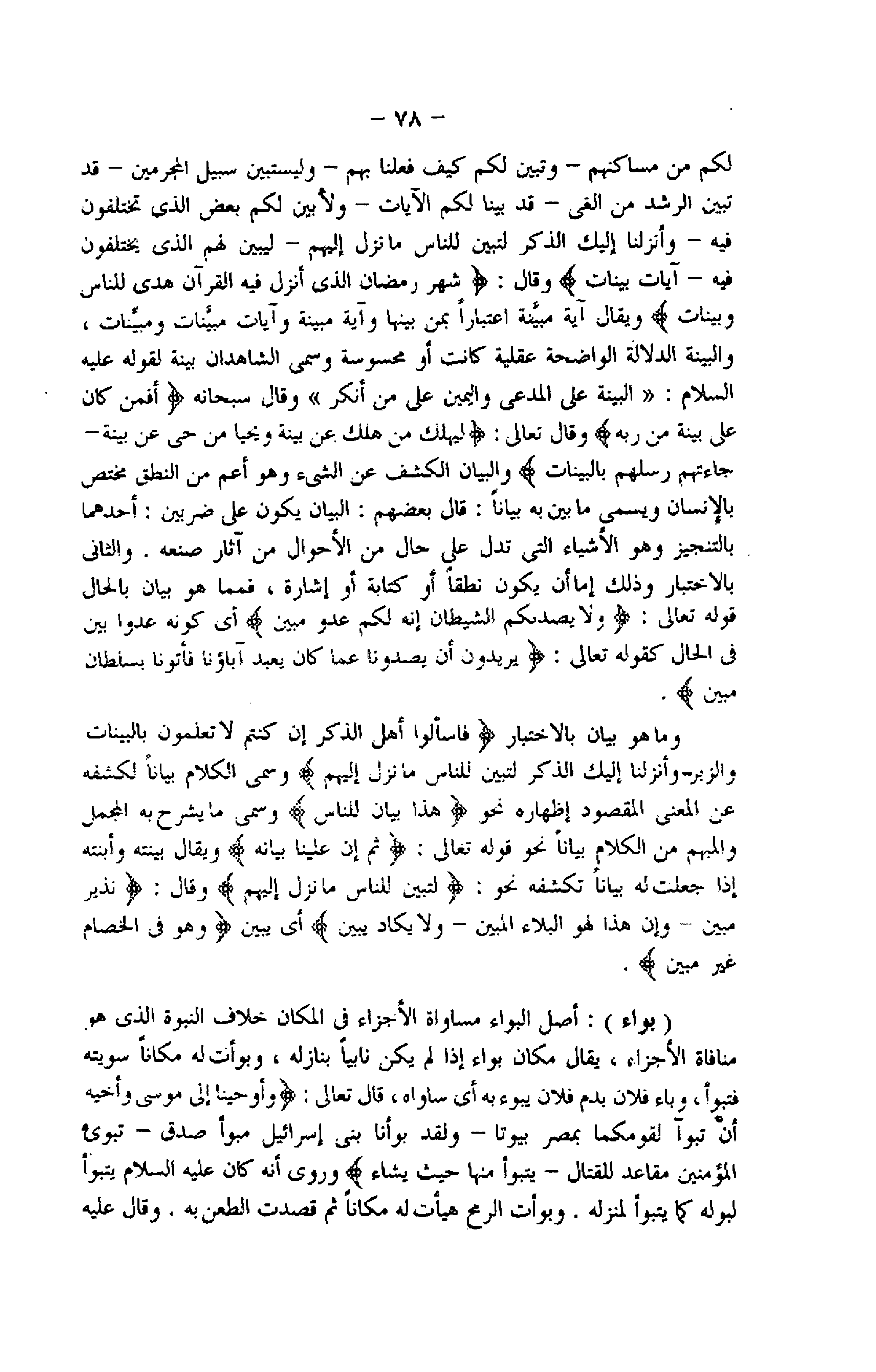 وما هو بيان بالاختبار فَسْئَلُوا أَهْلَ الذِّكْرِ إِنْ كُنْتُمْ لا تَعْلَمُونَ بِالْبَيِّناتِ وَالزُّبُرِ وَأَنْزَلْنا إِلَيْكَ الذِّكْرَ لِتُبَيِّنَ لِلنَّاسِ ما نُزِّلَ إِلَيْهِمْ وسمى الكلام بيانا لكشفه عن المعنى المقصود إظهاره نحو هذا بَيانٌ لِلنَّاسِ وسمى ما يشرح به المجمل والمبهم من الكلام بيانا نحو قوله تعالى: ثُمَّ إِنَّ عَلَيْنا بَيانَهُ ويقال بينته وأبنته إذا جعلت له بيانا تكشفه نحو لِتُبَيِّنَ لِلنَّاسِ ما نُزِّلَ إِلَيْهِمْ وقال: نَذِيرٌ مُبِينٌ- إِنَّ هذا لَهُوَ الْبَلاءُ الْمُبِينُ- وَلا يَكادُ يُبِينُ أي يبين وَهُوَ فِي الْخِصامِ غَيْرُ مُبِينٍ.