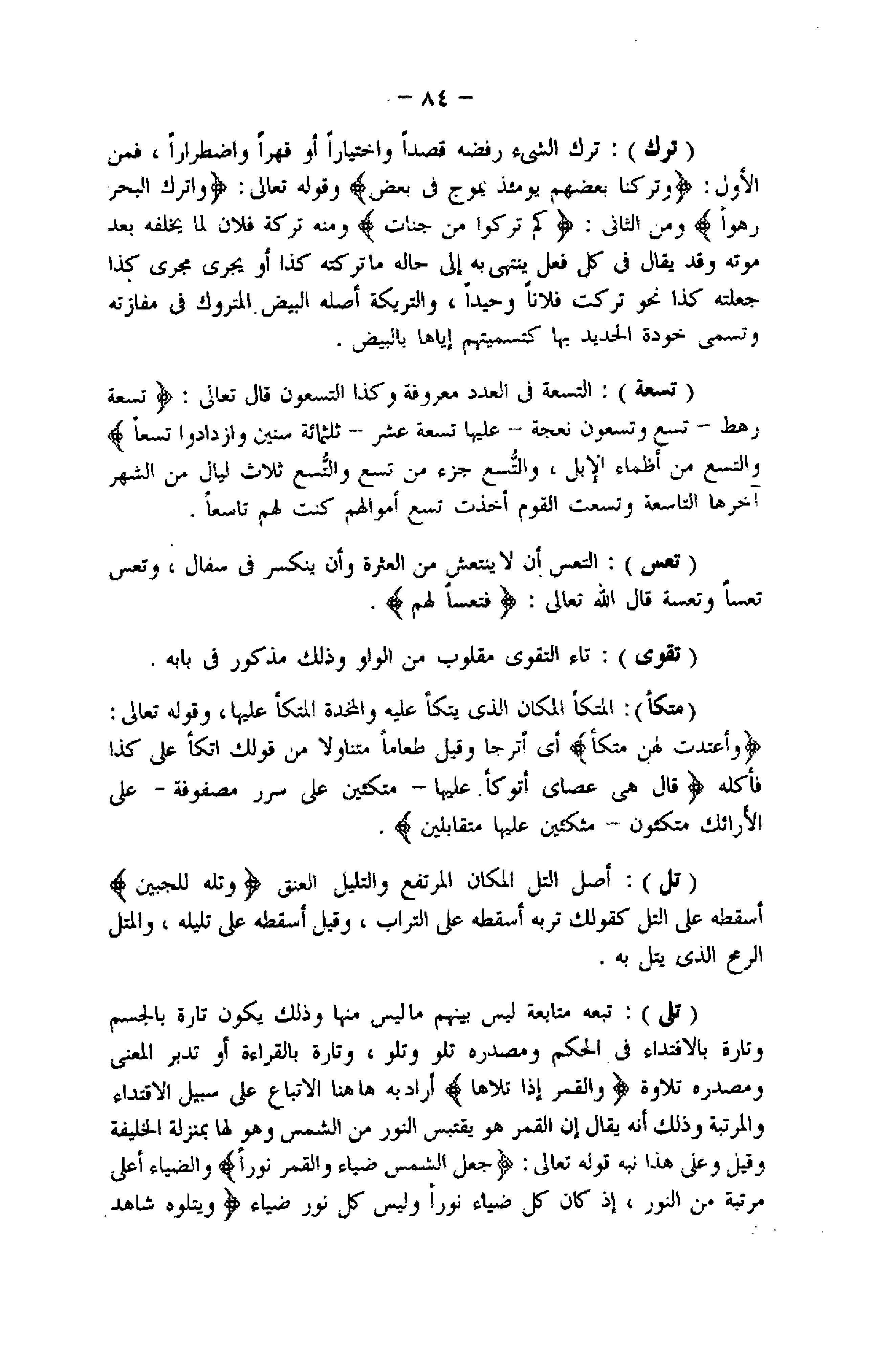 (ترك) : ترك الشيء رفضه قصدا واختيارا أو قهرا واضطرارا، فمن الأول: وَتَرَكْنا بَعْضَهُمْ يَوْمَئِذٍ يَمُوجُ فِي بَعْضٍ وقوله تعالى: وَاتْرُكِ الْبَحْرَ رَهْواً ومن الثاني: كَمْ تَرَكُوا مِنْ جَنَّاتٍ ومنه تركة فلان لما يخلفه بعد موته وقد يقال فى كل فعل ينتهى به إلى حاله ما تركته كذا أو يجرى مجرى كذا جعلته كذا نحو تركت فلانا وحيدا، والتركية أصله البيض المتروك فى مفازته وتسمى خودة الحديد بها كتسميتهم إياها بالبيض.