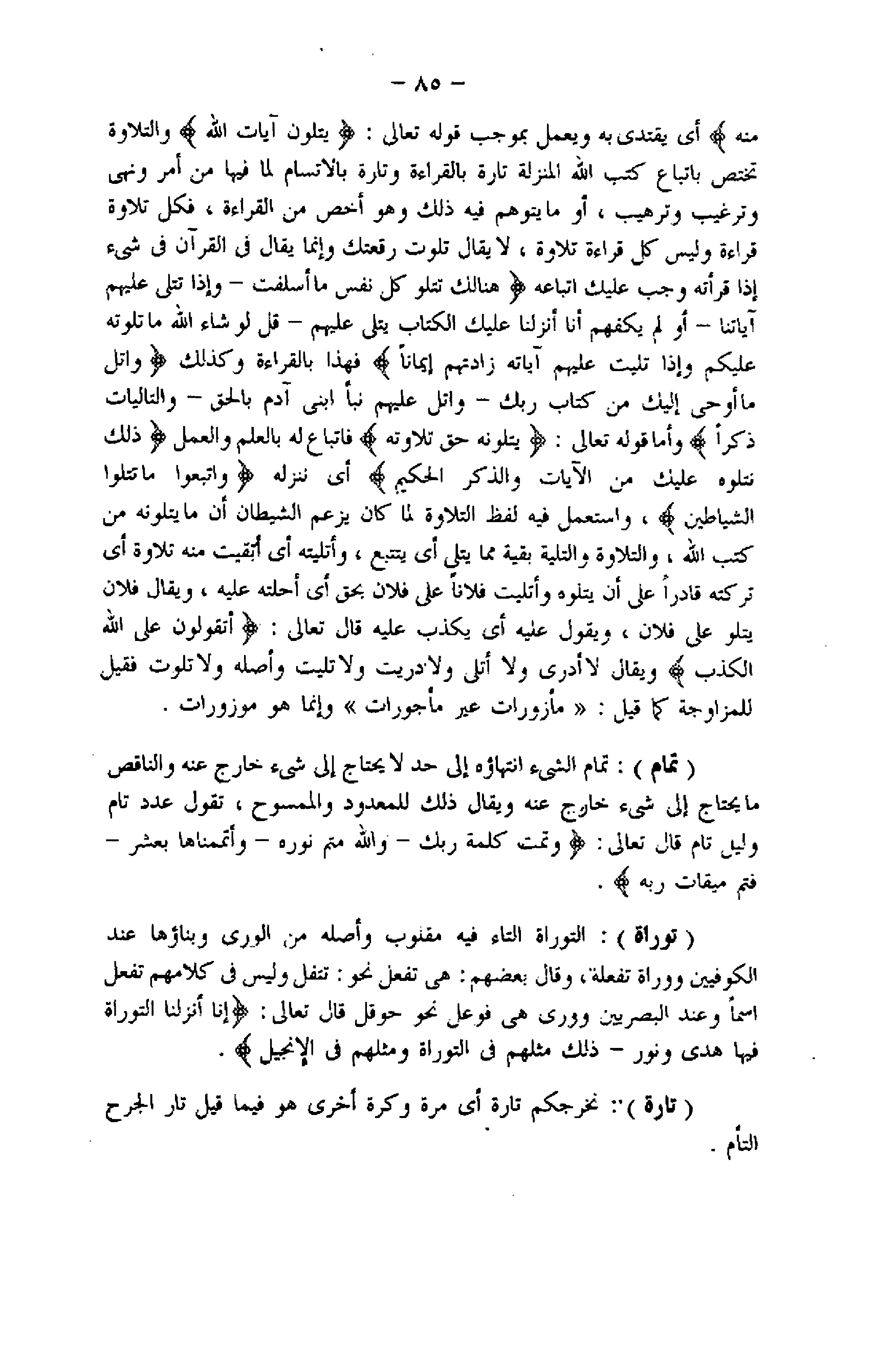 أي يقتدى به ويعمل بموجب قوله تعالى: يَتْلُونَ آياتِ اللَّهِ والتلاوة تختص باتباع كتب اللَّه المنزلة تارة بالقراءة وتارة بالاتسام لما فيها من أمر ونهى وترغيب وترهيب، أو ما يتوهم فيه ذلك وهو أخص من القراءة، فكل تلاوة قراءة وليس كل قرائة تلاوة، لا يقال تلوت رقعتك وإنما يقال فى القرآن فى شىء إذا قرأته وجب عليك اتباعه هُنالِكَ تَبْلُوا كُلُّ نَفْسٍ ما أَسْلَفَتْ- وَإِذا تُتْلى عَلَيْهِمْ آياتُنا- أَوَلَمْ يَكْفِهِمْ أَنَّا أَنْزَلْنا عَلَيْكَ الْكِتابَ يُتْلى عَلَيْهِمْ- قُلْ لَوْ شاءَ اللَّهُ ما تَلَوْتُهُ عَلَيْكُمْ وَإِذا تُلِيَتْ عَلَيْهِمْ آياتُهُ زادَتْهُمْ إِيماناً فهذا بالقراءة وكذلك وَاتْلُ ما أُوحِيَ إِلَيْكَ مِنْ كِتابِ رَبِّكَ- وَاتْلُ عَلَيْهِمْ نَبَأَ ابْنَيْ آدَمَ بِالْحَقِّ- فَالتَّالِياتِ ذِكْراً وأما قوله تعالى: يَتْلُونَهُ حَقَّ تِلاوَتِهِ فاتباع له بالعلم والعمل ذلِكَ نَتْلُوهُ عَلَيْكَ مِنَ الْآياتِ وَالذِّكْرِ الْحَكِيمِ أي ننزله وَاتَّبَعُوا ما تَتْلُوا الشَّياطِينُ، واستعمل فيه لفظ التلاوة لما كان يزعم الشيطان أن ما يتلونه من كتب اللَّه، والتلاوة والتلية بقية مما يتلى أي يتتبع، وأتليته أي أبقيت منه تلاوة أي تركته قادرا على أن يتلوه وأتليت فلانا على فلان بحق أي أحلته عليه، ويقال فلان يتلو على فلان، ويقول عليه أي يكذب عليه قال تعالى: وَيَقُولُونَ عَلَى اللَّهِ الْكَذِبَ ويقال لا أدرى ولا أتلى ولا دريت ولا تليت وأصله ولا تلوت فقيل للمزاوجة كما قيل: «مأزورات غير مأجورات» وإنما هو موزورات.