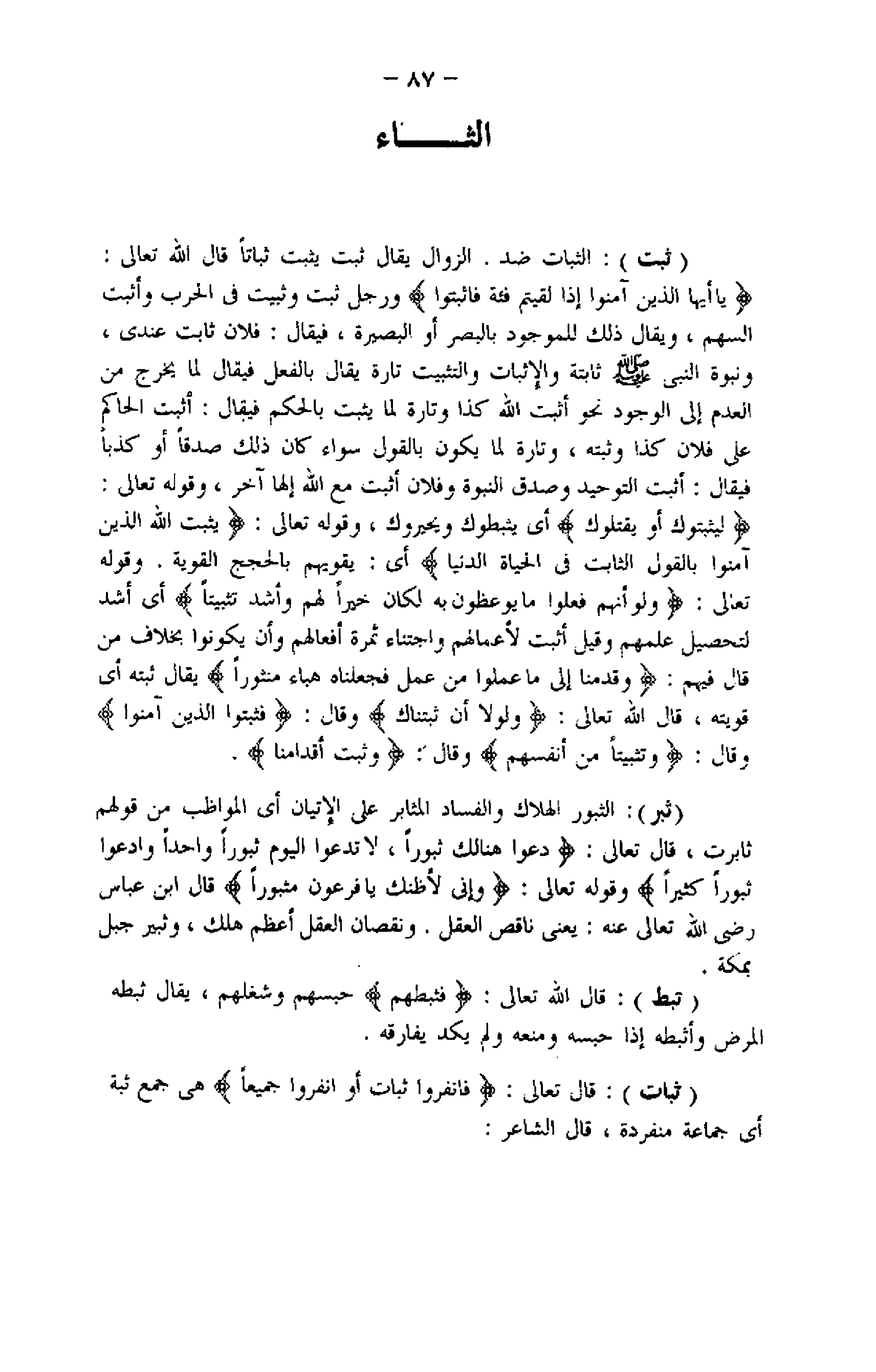 (ثبات) : قال تعالى: فَانْفِرُوا ثُباتٍ أَوِ انْفِرُوا جَمِيعاً هى جمع ثبة أي جماعة منفردة، قال الشاعر: