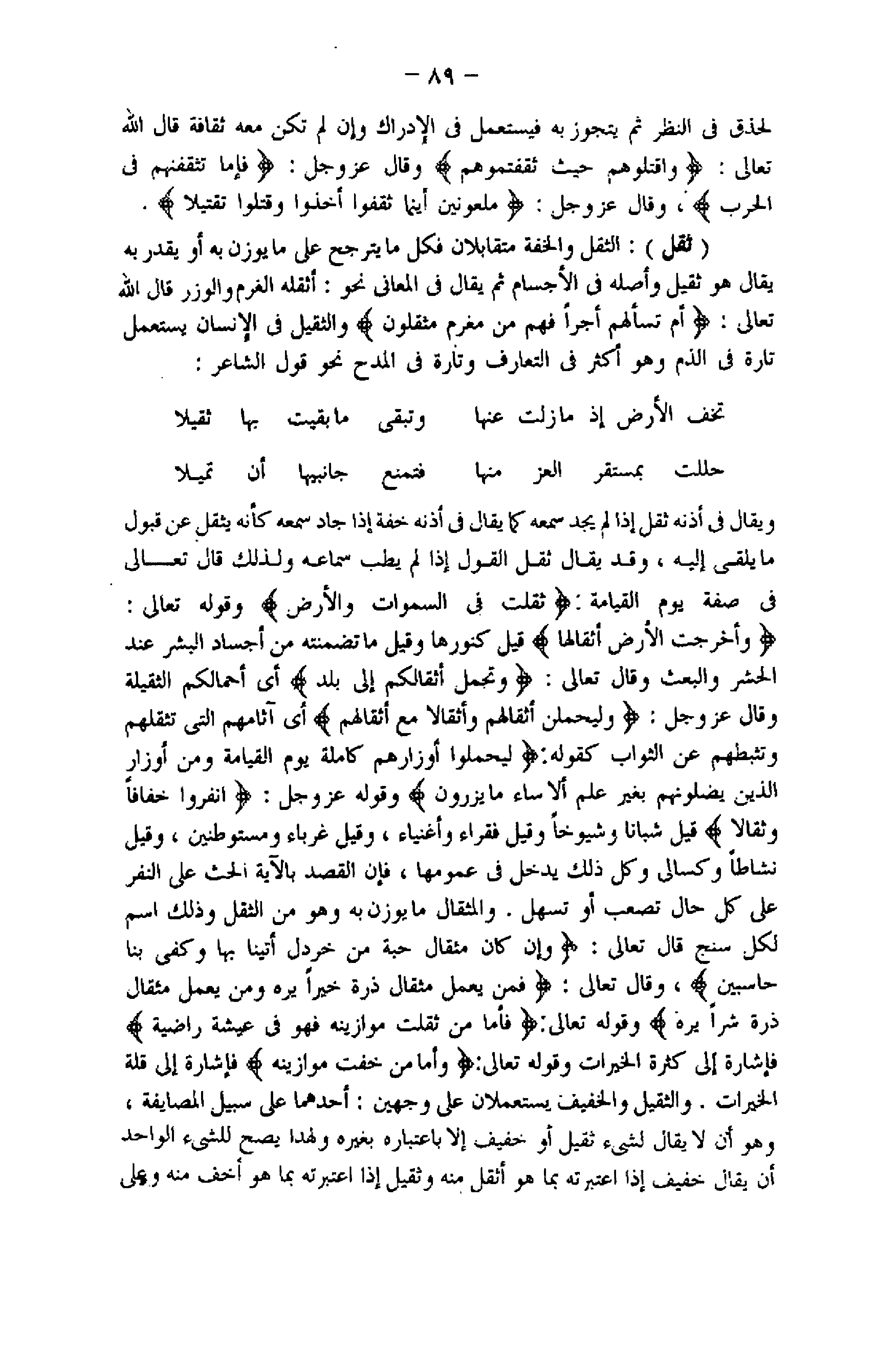 وَأَخْرَجَتِ الْأَرْضُ أَثْقالَها قيل كنورها وقيل ما تضمنته من أجساد البشر عند الحشر والبعث وقال تعالى: وَتَحْمِلُ أَثْقالَكُمْ إِلى بَلَدٍ أي أحمالكم الثقيلة وقال عزّ وجلّ: وَلَيَحْمِلُنَّ أَثْقالَهُمْ وَأَثْقالًا مَعَ أَثْقالِهِمْ أي آثامهم التي تثقلهم وتثبطهم عن الثواب كقوله: لِيَحْمِلُوا أَوْزارَهُمْ كامِلَةً يَوْمَ الْقِيامَةِ وَمِنْ أَوْزارِ الَّذِينَ يُضِلُّونَهُمْ بِغَيْرِ عِلْمٍ أَلا ساءَ ما يَزِرُونَ وقوله عزّ وجلّ: انْفِرُوا خِفافاً وَثِقالًا قيل شبانا وشيوخا وقيل فقراء وأغنياء، وقيل غرباء ومستوطنين، وقيل نشاطا وكسالى وكل ذلك يدخل فى عمومها، فإن القصد بالآية الحث على النفر على كل حال تصعب أو تسهل. والمثقال ما يوزن به وهو من الثقل وذلك اسم لكل سنج قال تعالى: وَإِنْ كانَ مِثْقالَ حَبَّةٍ مِنْ خَرْدَلٍ أَتَيْنا بِها وَكَفى بِنا حاسِبِينَ، وقال تعالى: فَمَنْ يَعْمَلْ مِثْقالَ ذَرَّةٍ خَيْراً يَرَهُ وَمَنْ يَعْمَلْ مِثْقالَ ذَرَّةٍ شَرًّا يَرَهُ وقوله تعالى: فَأَمَّا مَنْ ثَقُلَتْ مَوازِينُهُ فَهُوَ فِي عِيشَةٍ راضِيَةٍ فإشارة إلى كثرة الخيرات وقوله تعالى: وَأَمَّا مَنْ خَفَّتْ مَوازِينُهُ فإشارة إلى قلة الخيرات. والثقيل والخفيف يستعملان على وجهين: أحدهما على سبيل المصايفة، وهو أن لا يقال لشىء ثقيل أو خفيف إلا باعتباره بغيره ولهذا يصح للشىء الواحد أن يقال خفيف إذا اعتبرته بما هو أثقل منه وثقيل إذا اعتبرته بما هو أخف منه وعلى