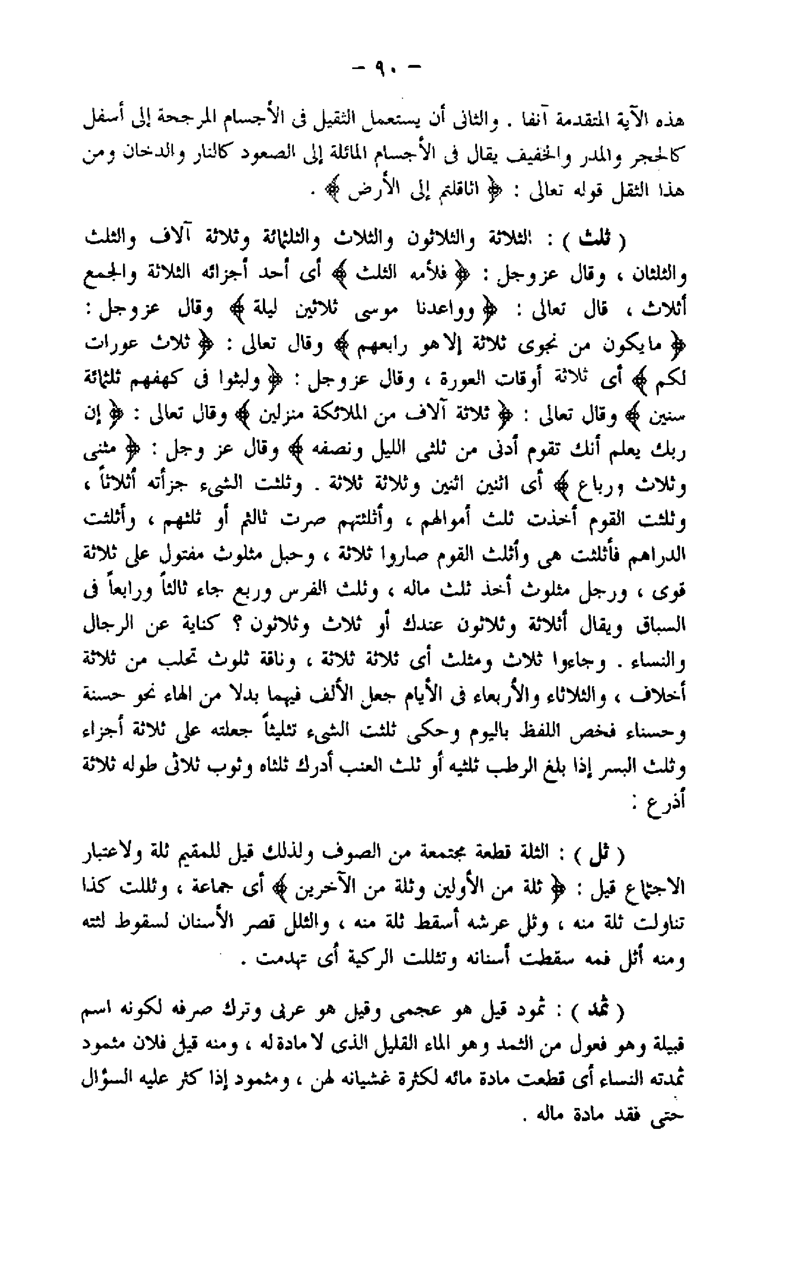 ما يَكُونُ مِنْ نَجْوى ثَلاثَةٍ إِلَّا هُوَ رابِعُهُمْ وقال تعالى: ثَلاثُ عَوْراتٍ لَكُمْ أي ثلاثة أوقات العورة، وقال عزّ وجلّ: وَلَبِثُوا فِي كَهْفِهِمْ ثَلاثَ مِائَةٍ سِنِينَ وقال تعالى: بِثَلاثَةِ آلافٍ مِنَ الْمَلائِكَةِ مُنْزَلِينَ وقال تعالى: إِنَّ رَبَّكَ يَعْلَمُ أَنَّكَ تَقُومُ أَدْنى مِنْ ثُلُثَيِ اللَّيْلِ وَنِصْفَهُ وقال عزّ وجلّ: مَثْنى وَثُلاثَ وَرُباعَ أي اثنين اثنين وثلاثة ثلاثة. وثلثت الشيء جزأته أثلاثا، وثلثت القوم أخذت ثلث أموالهم، وأثلثتهم صرت ثالثم أو ثلثهم، وأثلثت الدراهم فأثلثت هى وأثلث القوم صاروا ثلاثة، وحبل مثلوث مفتول على ثلاثة قوى، ورجل مثلوث أخذ ثلث ماله، وثلث الفرس وربع جاء ثالثا ورابعا فى السباق ويقال أثلاثة وثلاثون عندك أو ثلاث وثلاثون؟ كناية عن الرجال والنساء. وجاءوا ثلاث ومثلث أي ثلاثة ثلاثة، وناقة ثلوث تحلب من ثلاثة أخلاف، والثلاثاء والأربعاء فى الأيام جعل الألف فيهما بدلا من الهاء نحو حسنة وحسناء فخص اللفظ باليوم وحكى ثلثت الشيء تثليثا جعلته على ثلاثة أجزاء وثلث البسر إذا بلغ الرطب ثلثيه أو ثلث العنب أدرك ثلثاه وثوب ثلاثى طوله ثلاثة أذرع: