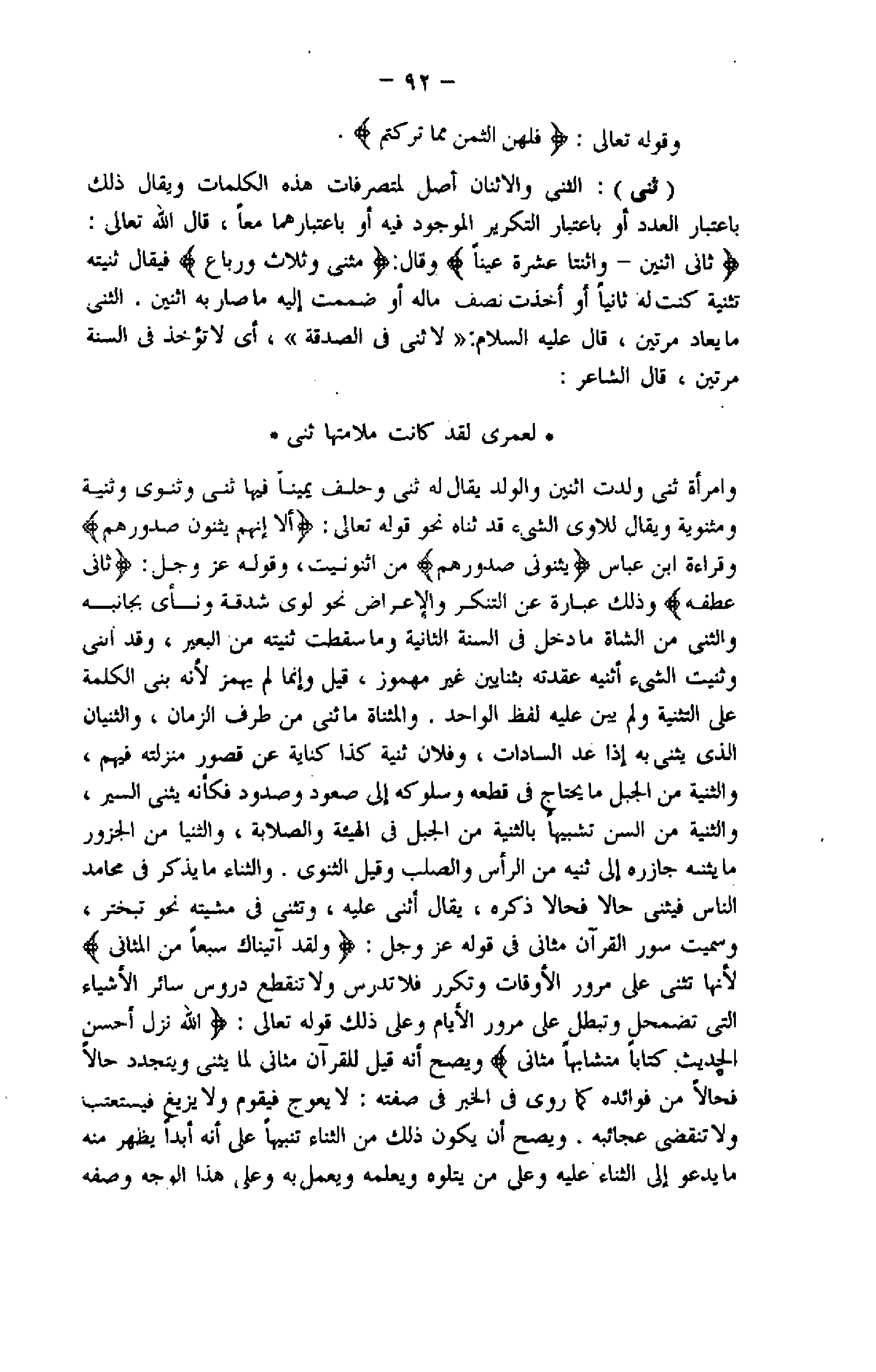 وامرأة ثنى ولدت اثنين والولد يقال له ثنى وحلف يمينا فيها ثنى وثنوى وثنية ومثنوية ويقال للاوى الشيء قد ثناه نحو قوله تعالى: أَلا إِنَّهُمْ يَثْنُونَ صُدُورَهُمْ وقراءة ابن عباس يَثْنُونَ صُدُورَهُمْ من اثنونيت، وقوله عزّ وجلّ: ثانِيَ عِطْفِهِ وذلك عبارة عن التنكر والإعراض نحو لوى شدقة ونأى بجانبه والثنى من الشاة ما دخل فى السنة الثانية وما سقطت ثنيته من البعير، وقد اثنى وثنيت الشيء أثنيه عقدته بثنايين غير مهموز، قيل وإنما لم يهمز لأنه بنى الكلمة على التثنية ولم يبن عليه لفظ الواحد. والمثناة ما ثنى من طرف الزمان، والثنيان الذي يثنى به إذا عد السادات، وفلان ثنية كذا كناية عن قصور منزلته فيهم، والثنية من الجبل ما يحتاج فى قطعه وسلوكه إلى صعود وصدود فكأنه يثنى السير، والثنية من السن تشبيها بالثنية من الجبل فى الهيئة والصلابة، والثنيا من الجزور ما يثنه جازره إلى ثنيه من الرأس والصلب وقيل الثنوى. والثناء ما يذكر فى محامد الناس فيثنى حالا فحالا ذكره، يقال أثنى عليه، وتثنى فى مشيته نحو تبختر، وسميت سور القرآن مثانى فى قوله عزّ وجلّ: وَلَقَدْ آتَيْناكَ سَبْعاً مِنَ الْمَثانِي لأنها تثنى على مرور الأوقات وتكرر فلا تدرس ولا تنقطع دروس سائر الأشياء التي تضمحل وتبطل على مرور الأيام وعلى ذلك قوله تعالى: اللَّهُ نَزَّلَ أَحْسَنَ الْحَدِيثِ كِتاباً مُتَشابِهاً مَثانِيَ ويصح أنه قيل للقرآن مثانى لما يثنى ويتجدد حالا فحالا من فوائده كما