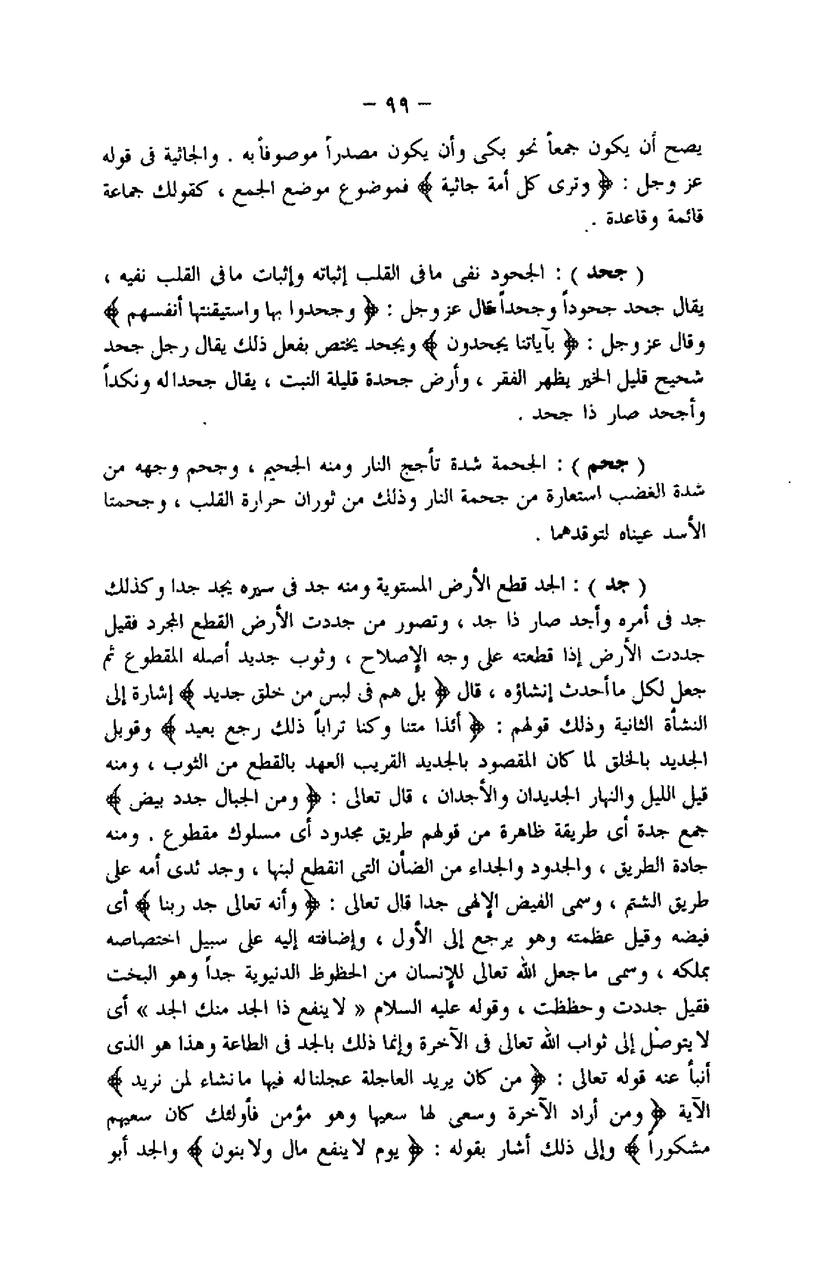 (جد) : الجد قطع الأرض المستوية ومنه جد فى سيره يجد جدا وكذلك جد فى أمره وأجد صار ذا جد، وتصور من جددت الأرض القطع المجرد فقيل جددت الأرض إذا قطعته على وجه الإصلاح، وثوب جديد أصله المقطوع ثم جعل لكل ما أحدث إنشاؤه، قال بَلْ هُمْ فِي لَبْسٍ مِنْ خَلْقٍ جَدِيدٍ إشارة إلى النشأة الثانية وذلك قولهم: أَإِذا مِتْنا وَكُنَّا تُراباً ذلِكَ رَجْعٌ بَعِيدٌ وقوبل الجديد بالخلق لما كان المقصود بالجديد القريب العهد بالقطع من الثوب، ومنه قيل الليل والنهار الجديدان والأجدان، قال تعالى: وَمِنَ الْجِبالِ جُدَدٌ بِيضٌ جمع جدة أي طريقة ظاهرة من قولهم طريق مجدود أي مسلوك مقطوع. ومنه جادة الطريق، والجدود والجداء من الضأن التي انقطع لبنها، وجد ثدى أمه على طريق الشتم، وسمى الفيض الإلهى جدا قال تعالى: وَأَنَّهُ تَعالى جَدُّ رَبِّنا أي فيضه وقيل عظمته وهو يرجع إلى الأول، وإضافته إليه على سبيل اختصاصه بملكه، وسمى ما جعل الله تعالى للإنسان من الحظوظ الدنيوية جدا وهو البخت فقيل جددت وحظظت،