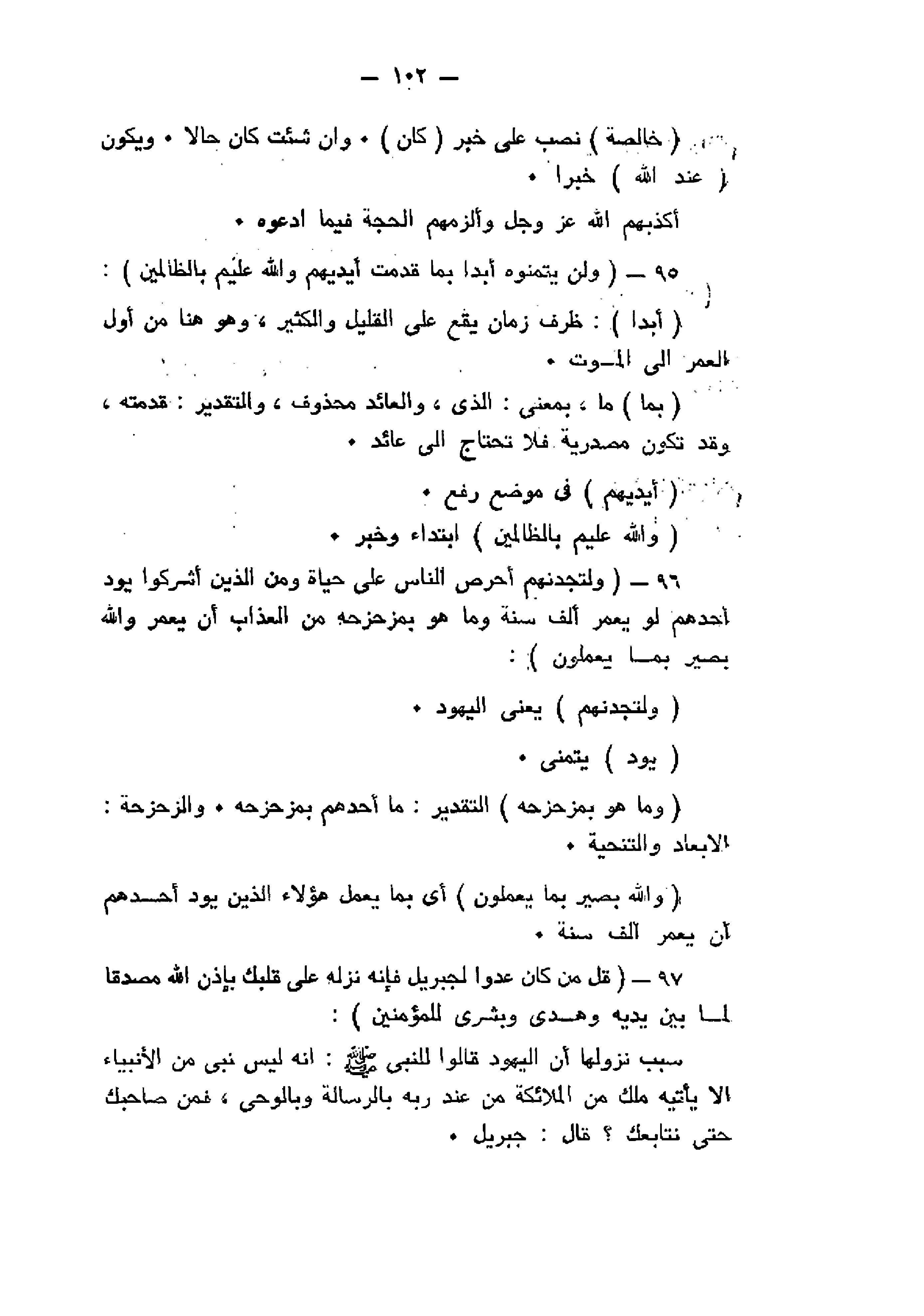 وَلَنْ يَتَمَنَّوْهُ أَبَداً بِما قَدَّمَتْ أَيْدِيهِمْ وَاللَّهُ عَلِيمٌ بِالظَّالِمِينَ (95) وَلَتَجِدَنَّهُمْ أَحْرَصَ النَّاسِ عَلى حَياةٍ وَمِنَ الَّذِينَ أَشْرَكُوا يَوَدُّ أَحَدُهُمْ لَوْ يُعَمَّرُ أَلْفَ سَنَةٍ وَما هُوَ بِمُزَحْزِحِهِ مِنَ الْعَذابِ أَنْ يُعَمَّرَ وَاللَّهُ بَصِيرٌ بِما يَعْمَلُونَ (96) قُلْ مَنْ كانَ عَدُوًّا لِجِبْرِيلَ فَإِنَّهُ نَزَّلَهُ عَلى قَلْبِكَ بِإِذْنِ اللَّهِ مُصَدِّقاً لِما بَيْنَ يَدَيْهِ وَهُدىً وَبُشْرى لِلْمُؤْمِنِينَ (97)