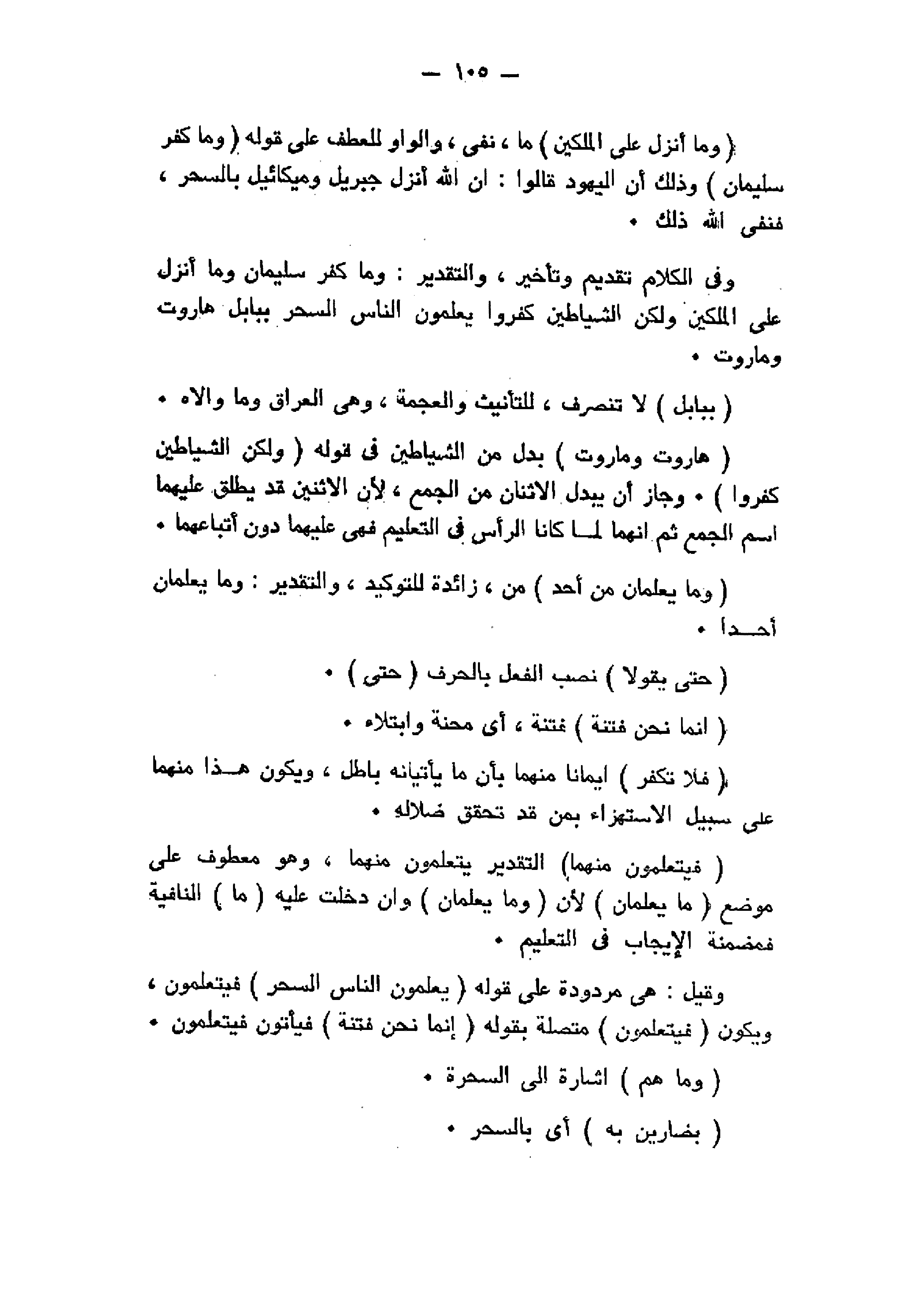 وفى الكلام تقديم وتأخير، والتقدير: وما كفر سليمان وما أنزل على الملكين ولكن الشياطين كفروا يعلمون الناس السحر ببابل هاروت وماروت.