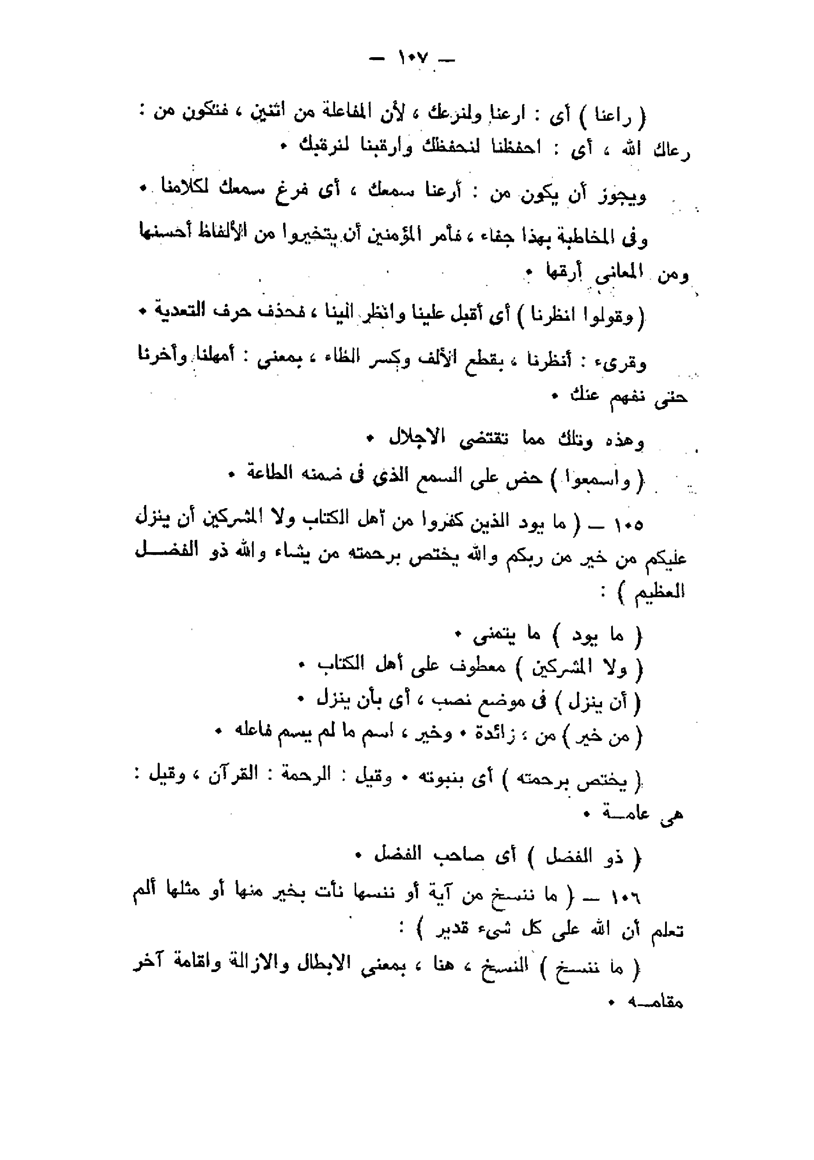 ما يَوَدُّ الَّذِينَ كَفَرُوا مِنْ أَهْلِ الْكِتابِ وَلا الْمُشْرِكِينَ أَنْ يُنَزَّلَ عَلَيْكُمْ مِنْ خَيْرٍ مِنْ رَبِّكُمْ وَاللَّهُ يَخْتَصُّ بِرَحْمَتِهِ مَنْ يَشاءُ وَاللَّهُ ذُو الْفَضْلِ الْعَظِيمِ (105) ما نَنْسَخْ مِنْ آيَةٍ أَوْ نُنْسِها نَأْتِ بِخَيْرٍ مِنْها أَوْ مِثْلِها أَلَمْ تَعْلَمْ أَنَّ اللَّهَ عَلى كُلِّ شَيْءٍ قَدِيرٌ (106)