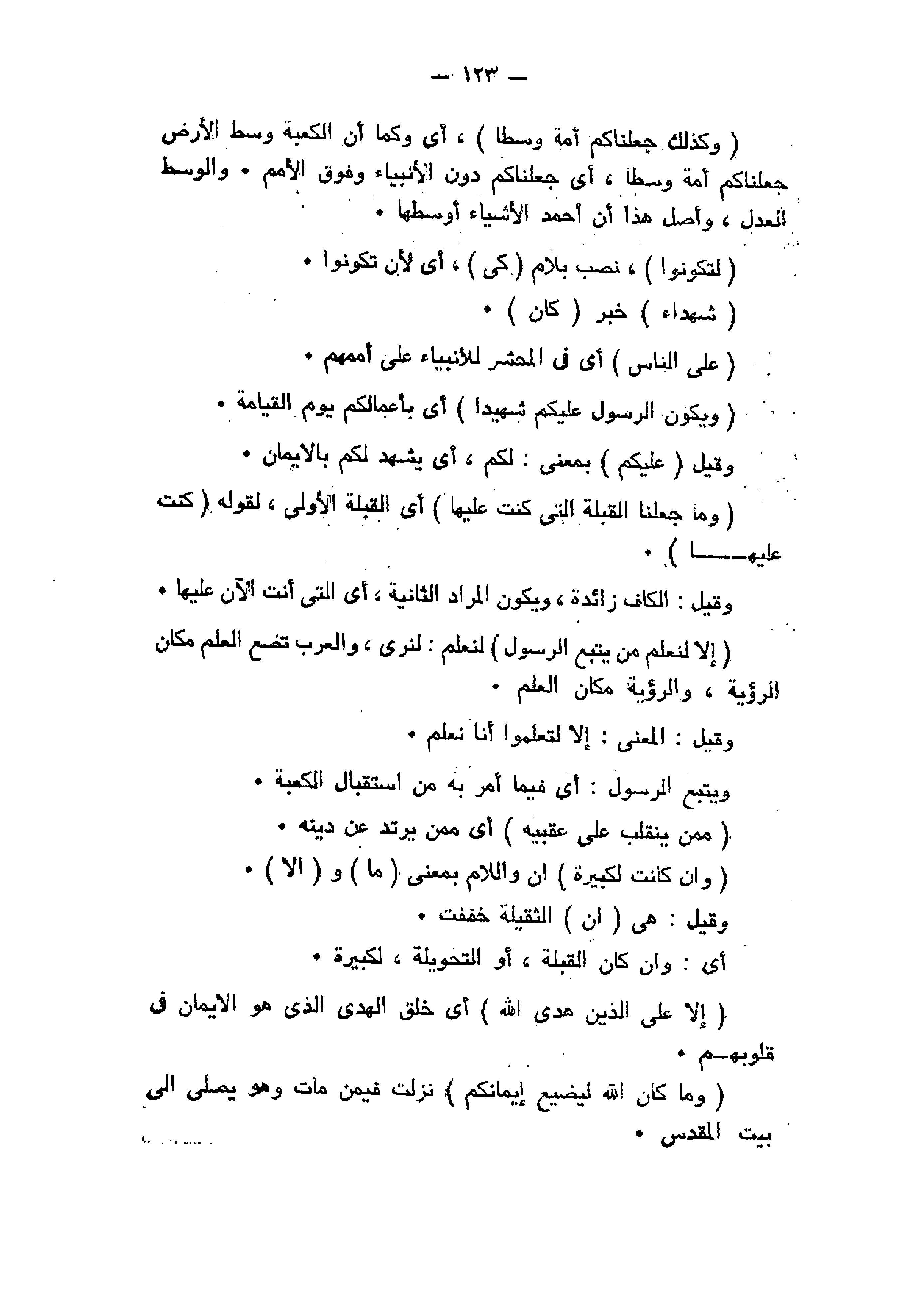 وَكَذلِكَ جَعَلْناكُمْ أُمَّةً وَسَطاً، أي وكما أن الكعبة وسط الأرض جعلناكم أمة وسطا، أي جعلناكم دون الأنبياء وفوق الأمم. والوسط العدل، وأصل هذا أن أحمد الأشياء أوسطها.