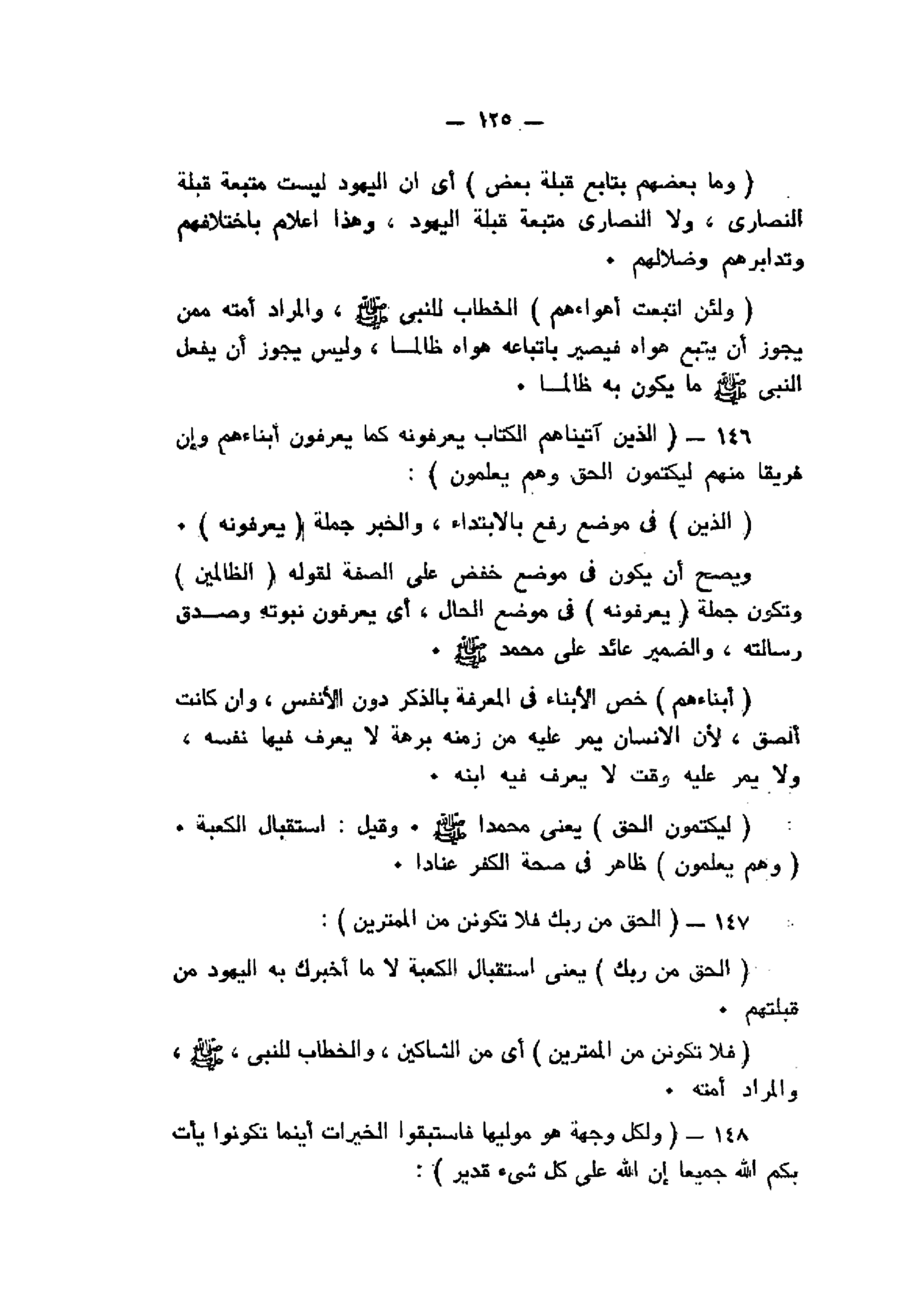 الَّذِينَ آتَيْناهُمُ الْكِتابَ يَعْرِفُونَهُ كَما يَعْرِفُونَ أَبْناءَهُمْ وَإِنَّ فَرِيقاً مِنْهُمْ لَيَكْتُمُونَ الْحَقَّ وَهُمْ يَعْلَمُونَ (146) الْحَقُّ مِنْ رَبِّكَ فَلا تَكُونَنَّ مِنَ الْمُمْتَرِينَ (147) وَلِكُلٍّ وِجْهَةٌ هُوَ مُوَلِّيها فَاسْتَبِقُوا الْخَيْراتِ أَيْنَ ما تَكُونُوا يَأْتِ بِكُمُ اللَّهُ جَمِيعاً إِنَّ اللَّهَ عَلى كُلِّ شَيْءٍ قَدِيرٌ (148)
