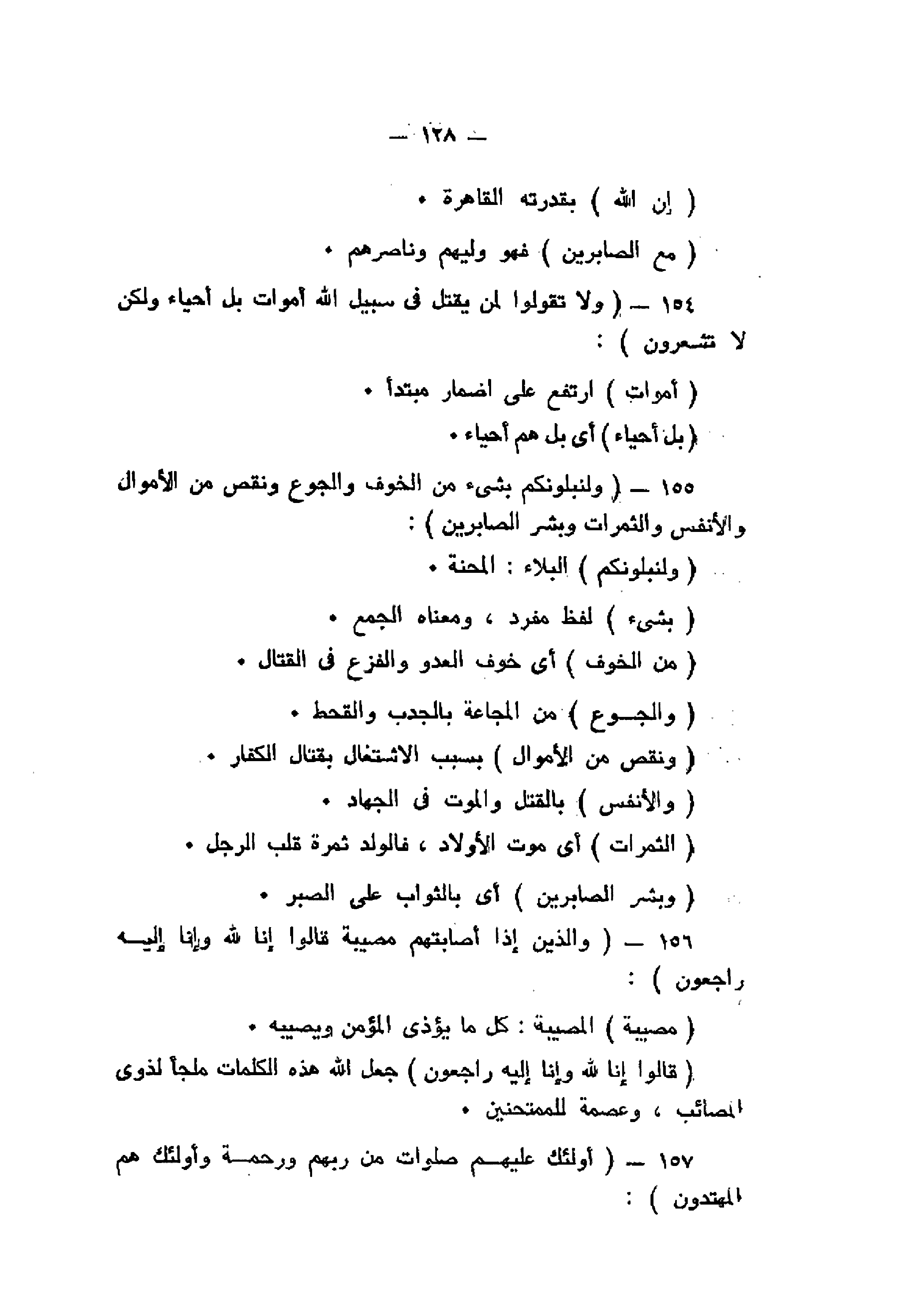 وَلا تَقُولُوا لِمَنْ يُقْتَلُ فِي سَبِيلِ اللَّهِ أَمْواتٌ بَلْ أَحْياءٌ وَلكِنْ لا تَشْعُرُونَ (154) وَلَنَبْلُوَنَّكُمْ بِشَيْءٍ مِنَ الْخَوْفِ وَالْجُوعِ وَنَقْصٍ مِنَ الْأَمْوالِ وَالْأَنْفُسِ وَالثَّمَراتِ وَبَشِّرِ الصَّابِرِينَ (155) الَّذِينَ إِذا أَصابَتْهُمْ مُصِيبَةٌ قالُوا إِنَّا لِلَّهِ وَإِنَّا إِلَيْهِ راجِعُونَ (156) أُولئِكَ عَلَيْهِمْ صَلَواتٌ مِنْ رَبِّهِمْ وَرَحْمَةٌ وَأُولئِكَ هُمُ الْمُهْتَدُونَ (157)
