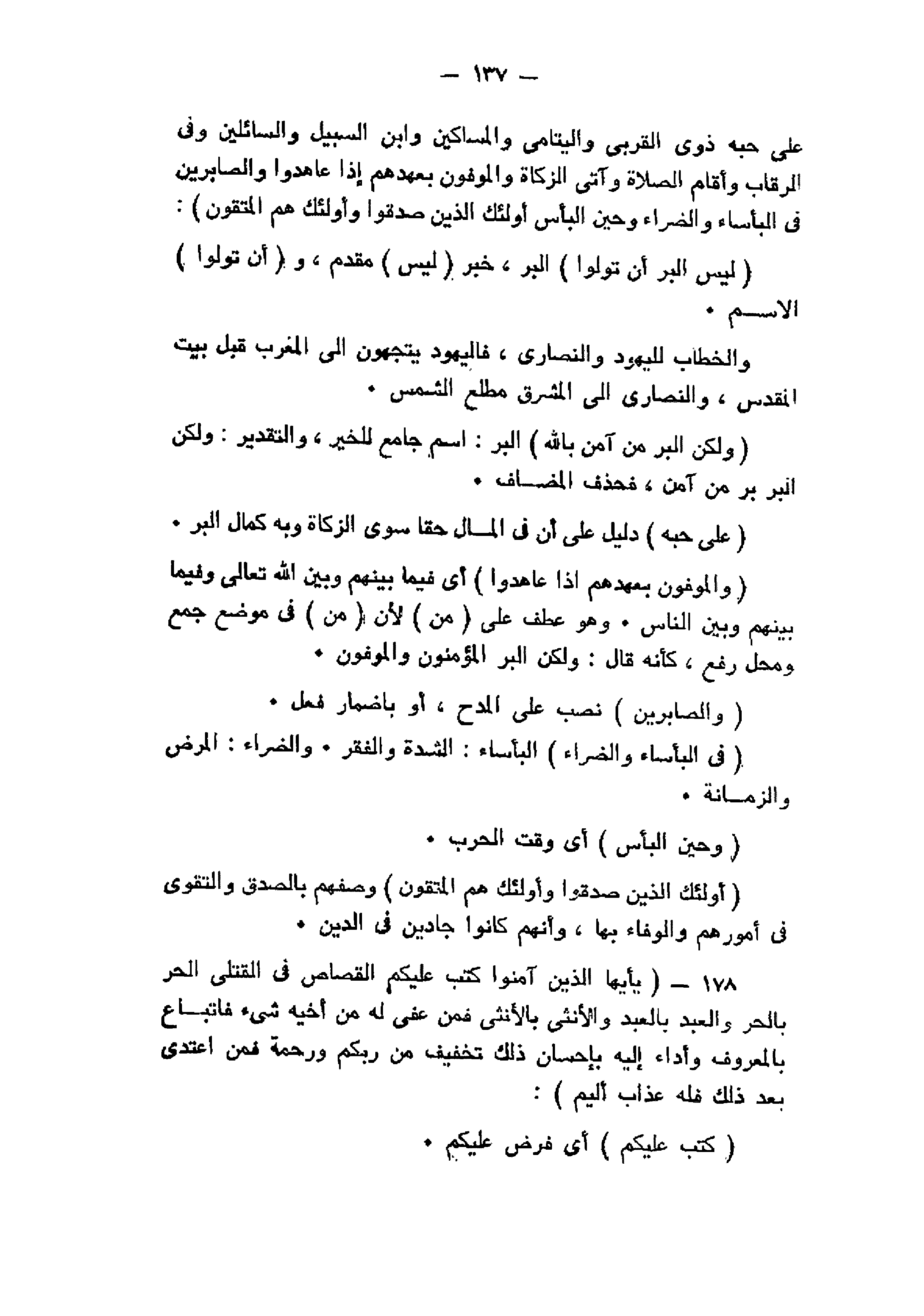 عَلى حُبِّهِ ذَوِي الْقُرْبى وَالْيَتامى وَالْمَساكِينَ وَابْنَ السَّبِيلِ وَالسَّائِلِينَ وَفِي الرِّقابِ وَأَقامَ الصَّلاةَ وَآتَى الزَّكاةَ وَالْمُوفُونَ بِعَهْدِهِمْ إِذا عاهَدُوا وَالصَّابِرِينَ فِي الْبَأْساءِ وَالضَّرَّاءِ وَحِينَ الْبَأْسِ أُولئِكَ الَّذِينَ صَدَقُوا وَأُولئِكَ هُمُ الْمُتَّقُونَ