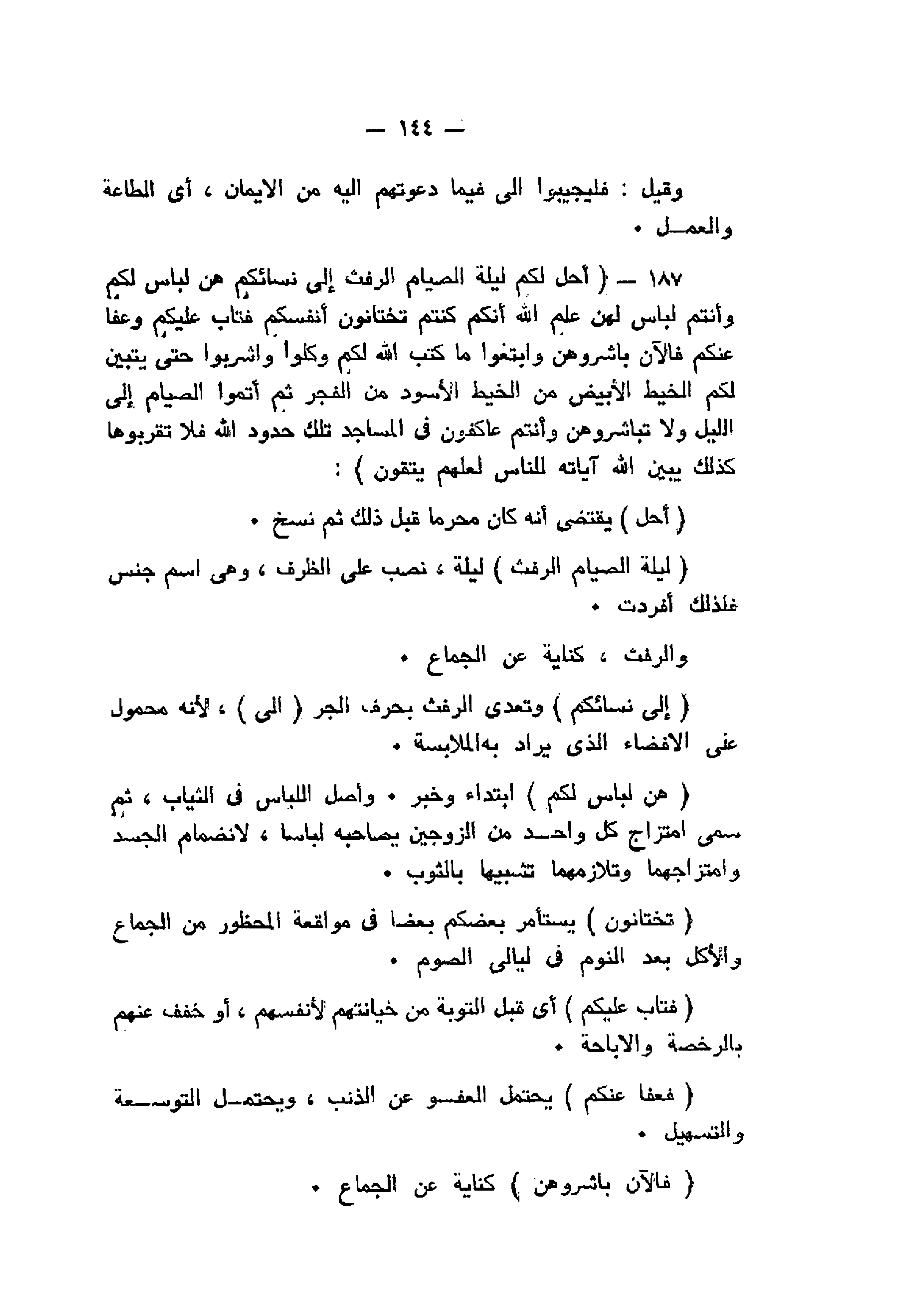 187- أُحِلَّ لَكُمْ لَيْلَةَ الصِّيامِ الرَّفَثُ إِلى نِسائِكُمْ هُنَّ لِباسٌ لَكُمْ وَأَنْتُمْ لِباسٌ لَهُنَّ عَلِمَ اللَّهُ أَنَّكُمْ كُنْتُمْ تَخْتانُونَ أَنْفُسَكُمْ فَتابَ عَلَيْكُمْ وَعَفا عَنْكُمْ فَالْآنَ بَاشِرُوهُنَّ وَابْتَغُوا ما كَتَبَ اللَّهُ لَكُمْ وَكُلُوا وَاشْرَبُوا حَتَّى يَتَبَيَّنَ لَكُمُ الْخَيْطُ الْأَبْيَضُ مِنَ الْخَيْطِ الْأَسْوَدِ مِنَ الْفَجْرِ ثُمَّ أَتِمُّوا الصِّيامَ إِلَى اللَّيْلِ وَلا تُبَاشِرُوهُنَّ وَأَنْتُمْ عاكِفُونَ فِي الْمَساجِدِ تِلْكَ حُدُودُ اللَّهِ فَلا تَقْرَبُوها كَذلِكَ يُبَيِّنُ اللَّهُ آياتِهِ لِلنَّاسِ لَعَلَّهُمْ يَتَّقُونَ: