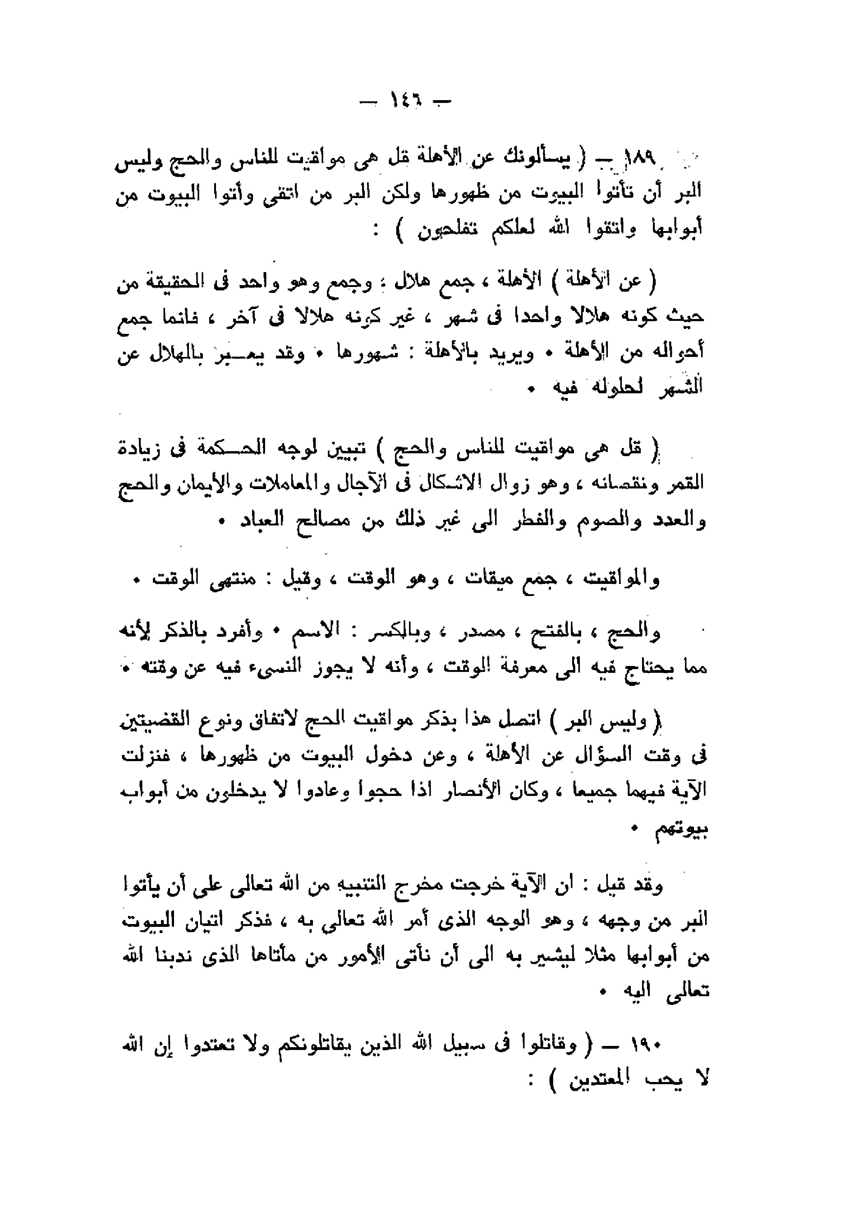 يَسْئَلُونَكَ عَنِ الْأَهِلَّةِ قُلْ هِيَ مَواقِيتُ لِلنَّاسِ وَالْحَجِّ وَلَيْسَ الْبِرُّ بِأَنْ تَأْتُوا الْبُيُوتَ مِنْ ظُهُورِها وَلكِنَّ الْبِرَّ مَنِ اتَّقى وَأْتُوا الْبُيُوتَ مِنْ أَبْوابِها وَاتَّقُوا اللَّهَ لَعَلَّكُمْ تُفْلِحُونَ (189) وَقاتِلُوا فِي سَبِيلِ اللَّهِ الَّذِينَ يُقاتِلُونَكُمْ وَلا تَعْتَدُوا إِنَّ اللَّهَ لا يُحِبُّ الْمُعْتَدِينَ (190)
