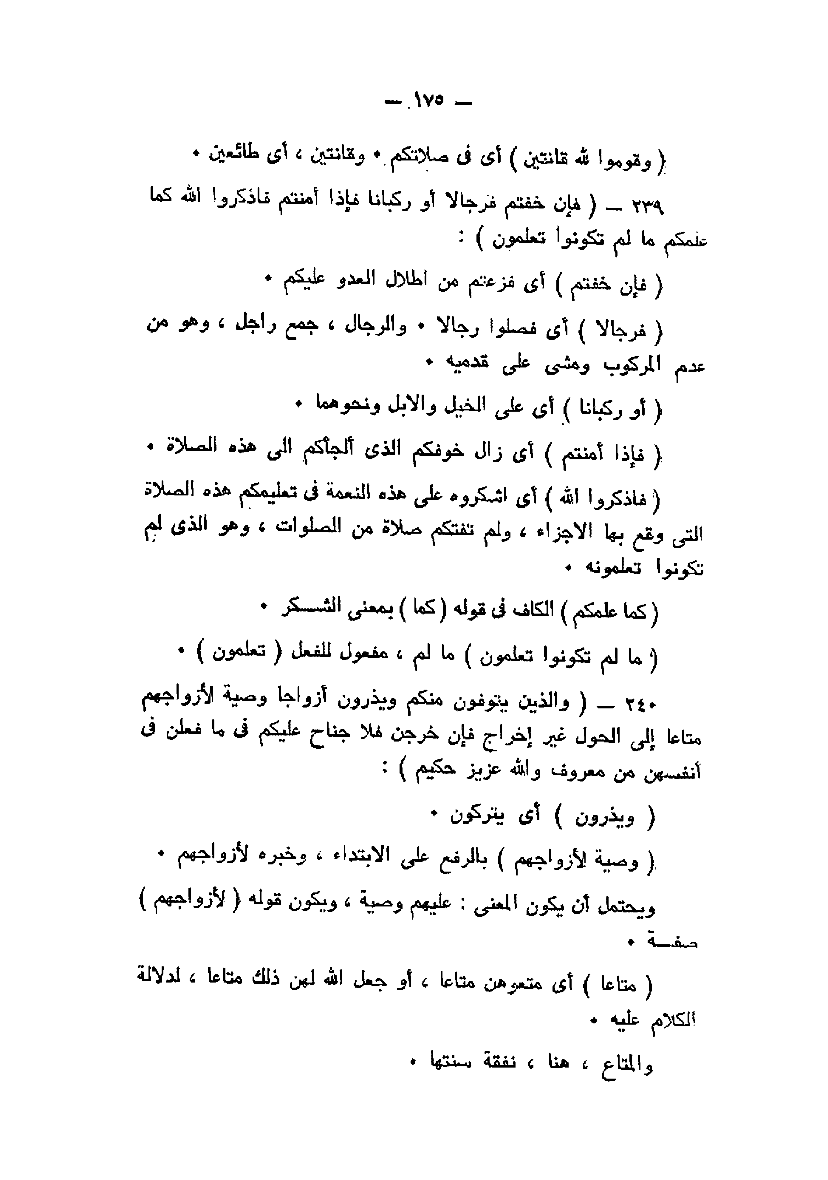 فَإِنْ خِفْتُمْ فَرِجالاً أَوْ رُكْباناً فَإِذا أَمِنْتُمْ فَاذْكُرُوا اللَّهَ كَما عَلَّمَكُمْ ما لَمْ تَكُونُوا تَعْلَمُونَ (239) وَالَّذِينَ يُتَوَفَّوْنَ مِنْكُمْ وَيَذَرُونَ أَزْواجاً وَصِيَّةً لِأَزْواجِهِمْ مَتاعاً إِلَى الْحَوْلِ غَيْرَ إِخْراجٍ فَإِنْ خَرَجْنَ فَلا جُناحَ عَلَيْكُمْ فِي ما فَعَلْنَ فِي أَنْفُسِهِنَّ مِنْ مَعْرُوفٍ وَاللَّهُ عَزِيزٌ حَكِيمٌ (240)
