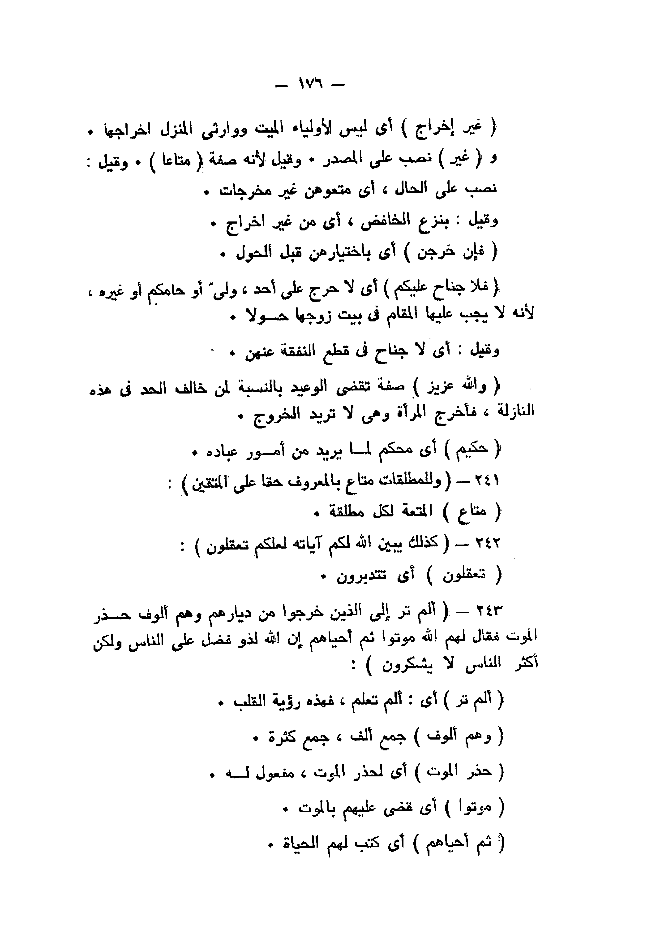 وَلِلْمُطَلَّقاتِ مَتاعٌ بِالْمَعْرُوفِ حَقًّا عَلَى الْمُتَّقِينَ (241) كَذلِكَ يُبَيِّنُ اللَّهُ لَكُمْ آياتِهِ لَعَلَّكُمْ تَعْقِلُونَ (242) أَلَمْ تَرَ إِلَى الَّذِينَ خَرَجُوا مِنْ دِيارِهِمْ وَهُمْ أُلُوفٌ حَذَرَ الْمَوْتِ فَقالَ لَهُمُ اللَّهُ مُوتُوا ثُمَّ أَحْياهُمْ إِنَّ اللَّهَ لَذُو فَضْلٍ عَلَى النَّاسِ وَلكِنَّ أَكْثَرَ النَّاسِ لا يَشْكُرُونَ (243)