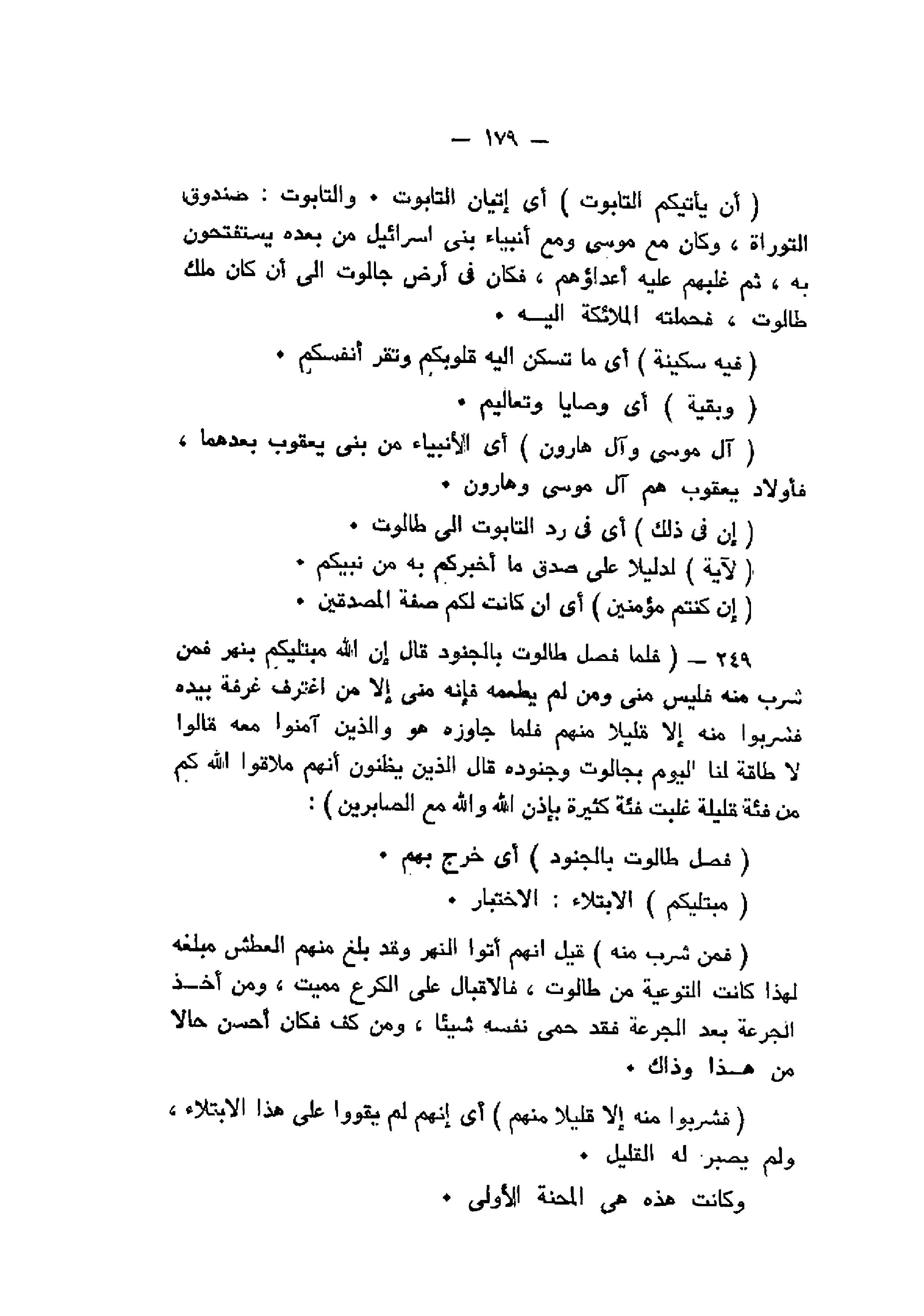 فَلَمَّا فَصَلَ طالُوتُ بِالْجُنُودِ قالَ إِنَّ اللَّهَ مُبْتَلِيكُمْ بِنَهَرٍ فَمَنْ شَرِبَ مِنْهُ فَلَيْسَ مِنِّي وَمَنْ لَمْ يَطْعَمْهُ فَإِنَّهُ مِنِّي إِلاَّ مَنِ اغْتَرَفَ غُرْفَةً بِيَدِهِ فَشَرِبُوا مِنْهُ إِلاَّ قَلِيلاً مِنْهُمْ فَلَمَّا جاوَزَهُ هُوَ وَالَّذِينَ آمَنُوا مَعَهُ قالُوا لا طاقَةَ لَنَا الْيَوْمَ بِجالُوتَ وَجُنُودِهِ قالَ الَّذِينَ يَظُنُّونَ أَنَّهُمْ مُلاقُوا اللَّهِ كَمْ مِنْ فِئَةٍ قَلِيلَةٍ غَلَبَتْ فِئَةً كَثِيرَةً بِإِذْنِ اللَّهِ وَاللَّهُ مَعَ الصَّابِرِينَ (249)