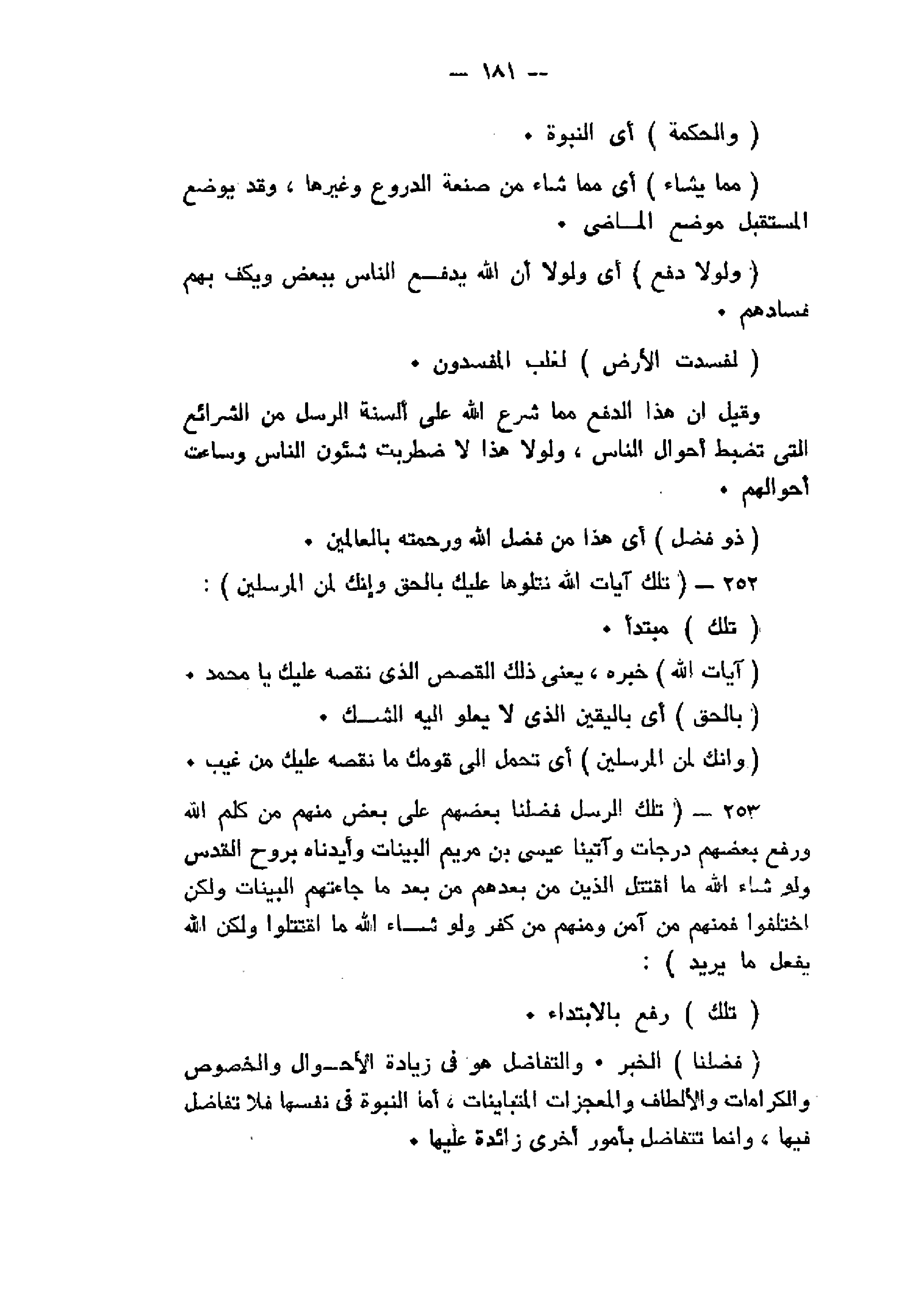 253- تِلْكَ الرُّسُلُ فَضَّلْنا بَعْضَهُمْ عَلى بَعْضٍ مِنْهُمْ مَنْ كَلَّمَ اللَّهُ وَرَفَعَ بَعْضَهُمْ دَرَجاتٍ وَآتَيْنا عِيسَى ابْنَ مَرْيَمَ الْبَيِّناتِ وَأَيَّدْناهُ بِرُوحِ الْقُدُسِ وَلَوْ شاءَ اللَّهُ مَا اقْتَتَلَ الَّذِينَ مِنْ بَعْدِهِمْ مِنْ بَعْدِ ما جاءَتْهُمُ الْبَيِّناتُ وَلكِنِ اخْتَلَفُوا فَمِنْهُمْ مَنْ آمَنَ وَمِنْهُمْ مَنْ كَفَرَ وَلَوْ شاءَ اللَّهُ مَا اقْتَتَلُوا وَلكِنَّ اللَّهَ يَفْعَلُ ما يُرِيدُ: