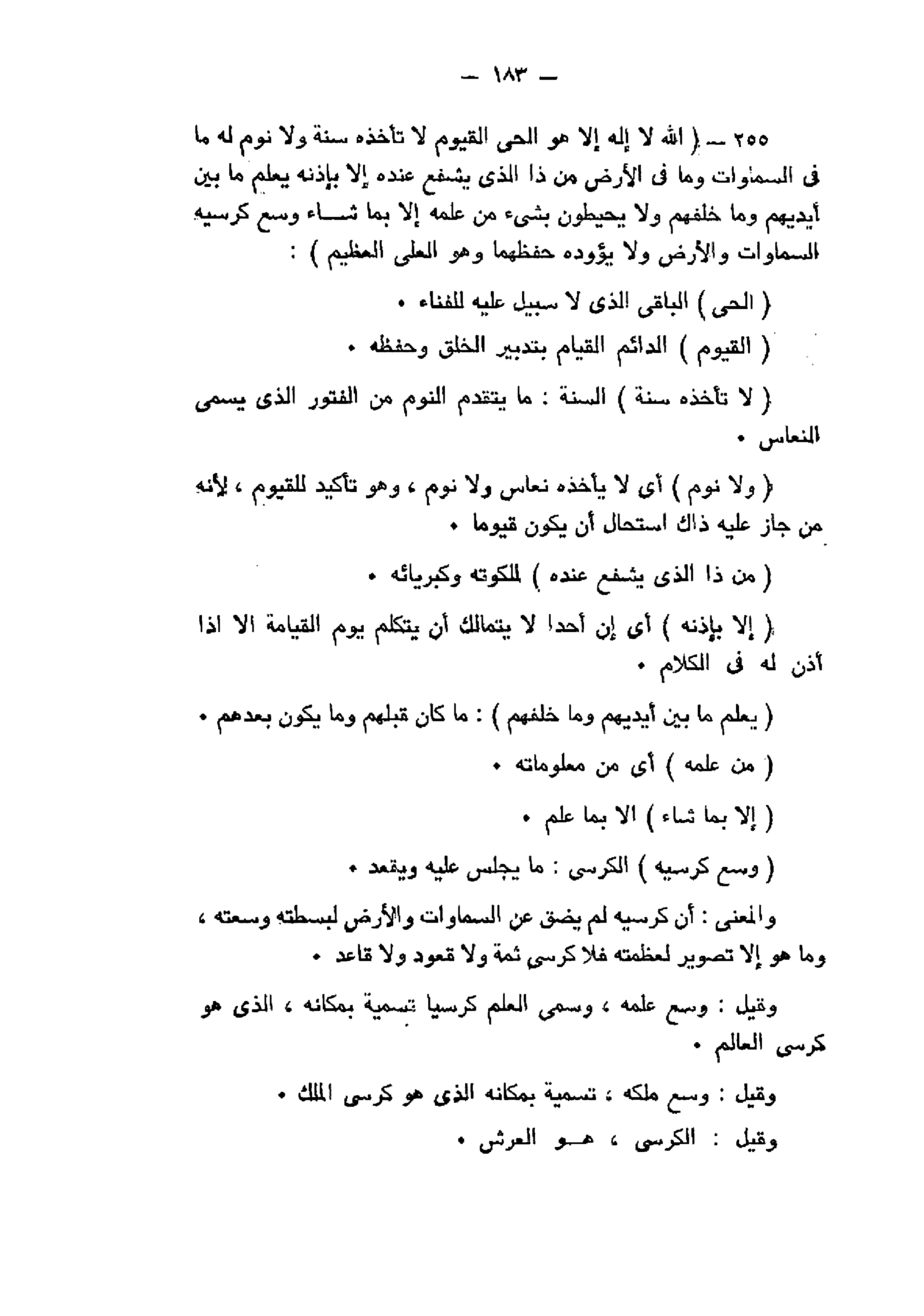255- اللَّهُ لا إِلهَ إِلَّا هُوَ الْحَيُّ الْقَيُّومُ لا تَأْخُذُهُ سِنَةٌ وَلا نَوْمٌ لَهُ ما فِي السَّماواتِ وَما فِي الْأَرْضِ مَنْ ذَا الَّذِي يَشْفَعُ عِنْدَهُ إِلَّا بِإِذْنِهِ يَعْلَمُ ما بَيْنَ أَيْدِيهِمْ وَما خَلْفَهُمْ وَلا يُحِيطُونَ بِشَيْءٍ مِنْ عِلْمِهِ إِلَّا بِما شاءَ وَسِعَ كُرْسِيُّهُ السَّماواتِ وَالْأَرْضَ وَلا يَؤُدُهُ حِفْظُهُما وَهُوَ الْعَلِيُّ الْعَظِيمُ: