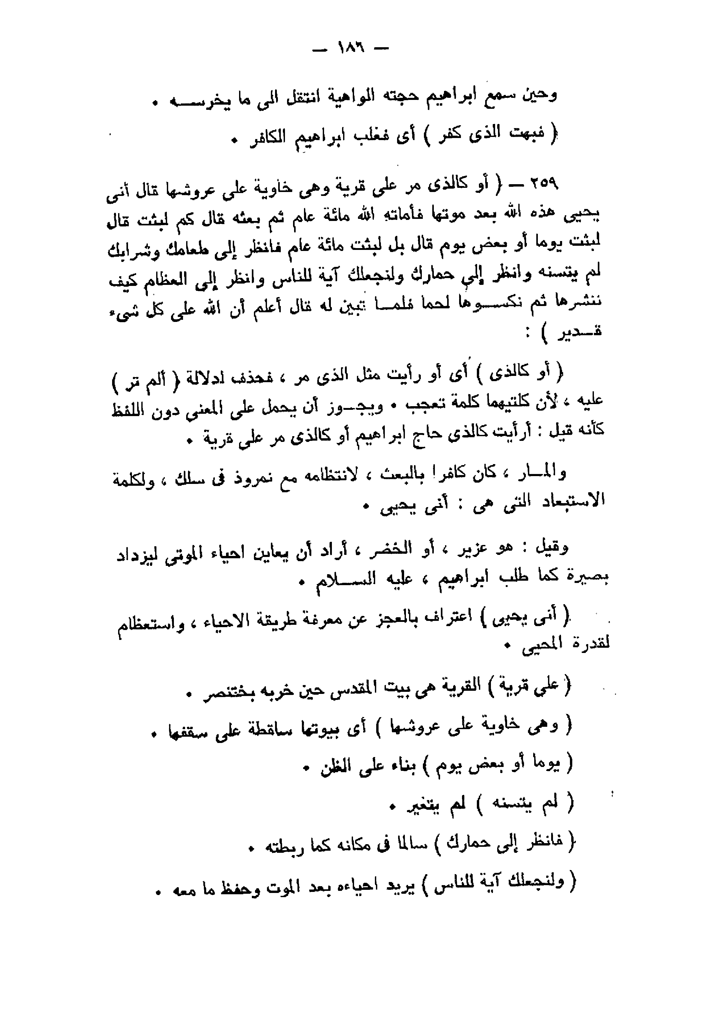 259- أَوْ كَالَّذِي مَرَّ عَلى قَرْيَةٍ وَهِيَ خاوِيَةٌ عَلى عُرُوشِها قالَ أَنَّى يُحْيِي هذِهِ اللَّهُ بَعْدَ مَوْتِها فَأَماتَهُ اللَّهُ مِائَةَ عامٍ ثُمَّ بَعَثَهُ قالَ كَمْ لَبِثْتَ قالَ لَبِثْتُ يَوْماً أَوْ بَعْضَ يَوْمٍ قالَ بَلْ لَبِثْتَ مِائَةَ عامٍ فَانْظُرْ إِلى طَعامِكَ وَشَرابِكَ لَمْ يَتَسَنَّهْ وَانْظُرْ إِلى حِمارِكَ وَلِنَجْعَلَكَ آيَةً لِلنَّاسِ وَانْظُرْ إِلَى الْعِظامِ كَيْفَ نُنْشِزُها ثُمَّ نَكْسُوها لَحْماً فَلَمَّا تَبَيَّنَ لَهُ قالَ أَعْلَمُ أَنَّ اللَّهَ عَلى كُلِّ شَيْءٍ قَدِيرٌ: