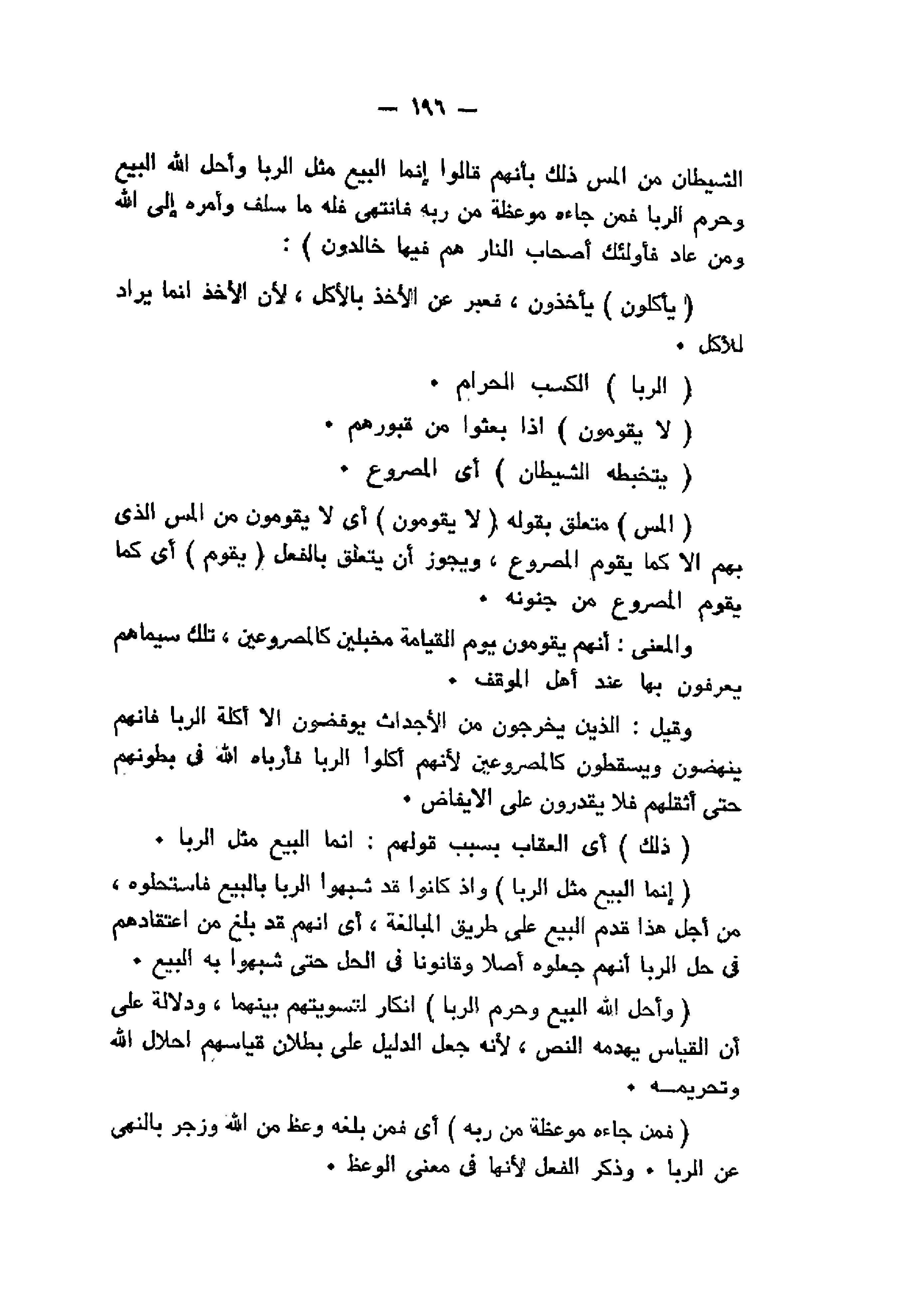 الشَّيْطانُ مِنَ الْمَسِّ ذلِكَ بِأَنَّهُمْ قالُوا إِنَّمَا الْبَيْعُ مِثْلُ الرِّبا وَأَحَلَّ اللَّهُ الْبَيْعَ وَحَرَّمَ الرِّبا فَمَنْ جاءَهُ مَوْعِظَةٌ مِنْ رَبِّهِ فَانْتَهى فَلَهُ ما سَلَفَ وَأَمْرُهُ إِلَى اللَّهِ وَمَنْ عادَ فَأُولئِكَ أَصْحابُ النَّارِ هُمْ فِيها خالِدُونَ
