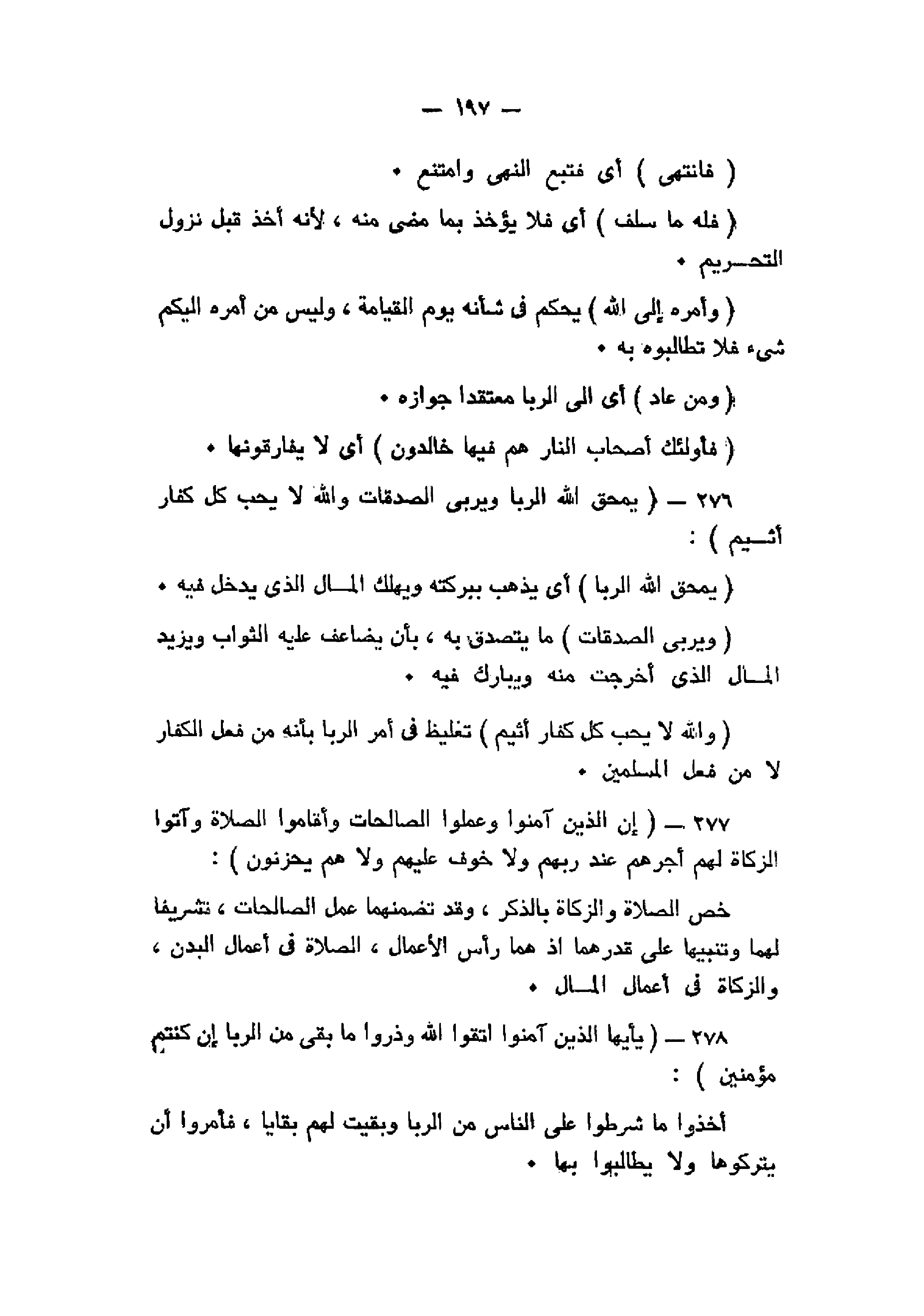 يَمْحَقُ اللَّهُ الرِّبا وَيُرْبِي الصَّدَقاتِ وَاللَّهُ لا يُحِبُّ كُلَّ كَفَّارٍ أَثِيمٍ (276) إِنَّ الَّذِينَ آمَنُوا وَعَمِلُوا الصَّالِحاتِ وَأَقامُوا الصَّلاةَ وَآتَوُا الزَّكاةَ لَهُمْ أَجْرُهُمْ عِنْدَ رَبِّهِمْ وَلا خَوْفٌ عَلَيْهِمْ وَلا هُمْ يَحْزَنُونَ (277) يا أَيُّهَا الَّذِينَ آمَنُوا اتَّقُوا اللَّهَ وَذَرُوا ما بَقِيَ مِنَ الرِّبا إِنْ كُنْتُمْ مُؤْمِنِينَ (278)