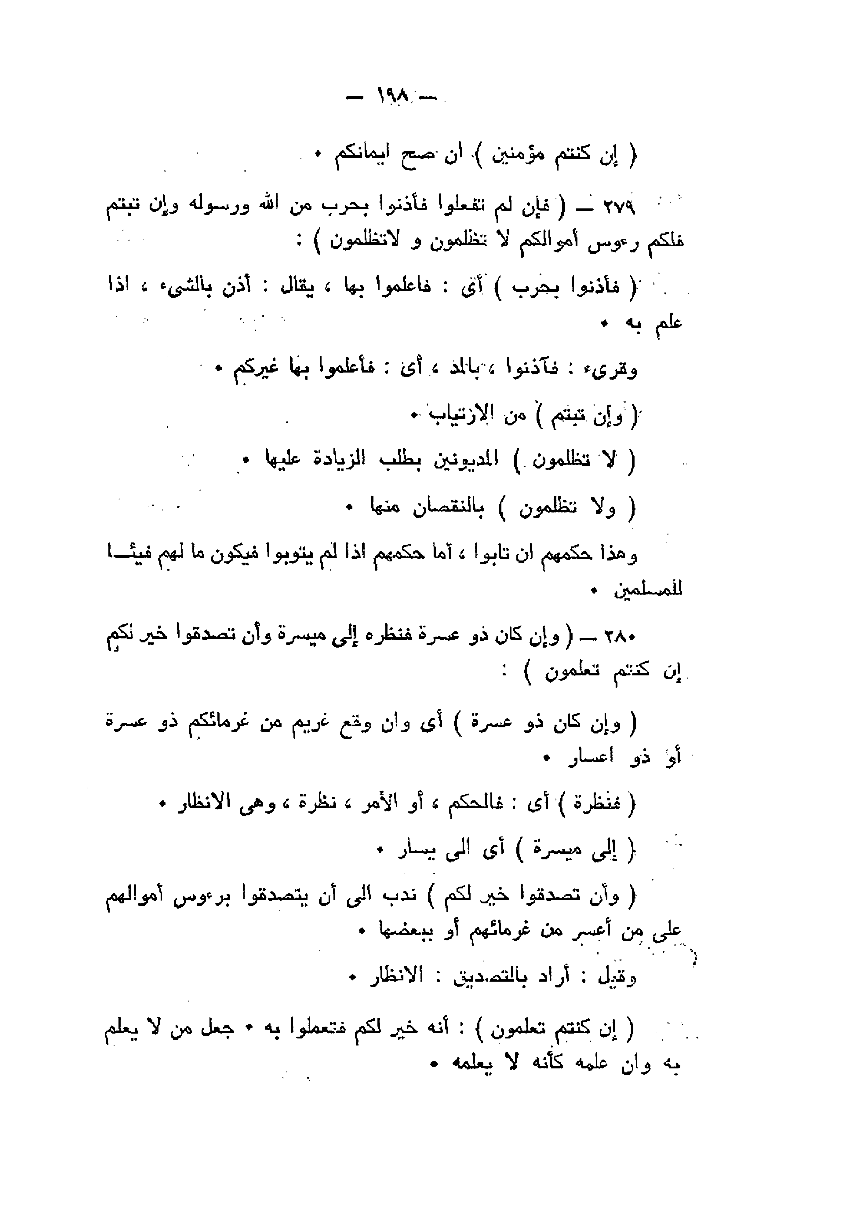 فَإِنْ لَمْ تَفْعَلُوا فَأْذَنُوا بِحَرْبٍ مِنَ اللَّهِ وَرَسُولِهِ وَإِنْ تُبْتُمْ فَلَكُمْ رُؤُسُ أَمْوالِكُمْ لا تَظْلِمُونَ وَلا تُظْلَمُونَ (279) وَإِنْ كانَ ذُو عُسْرَةٍ فَنَظِرَةٌ إِلى مَيْسَرَةٍ وَأَنْ تَصَدَّقُوا خَيْرٌ لَكُمْ إِنْ كُنْتُمْ تَعْلَمُونَ (280)
