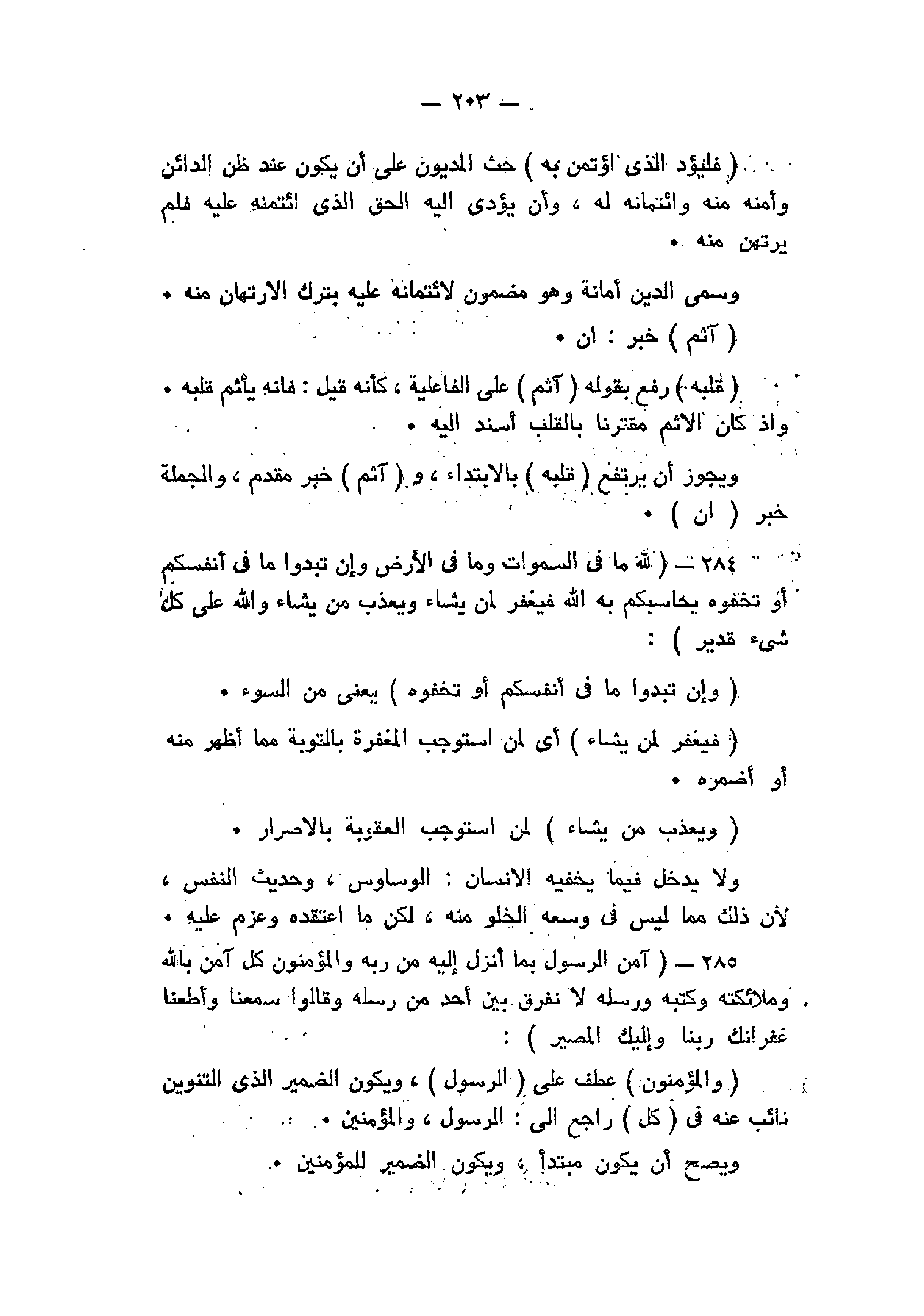 لِلَّهِ ما فِي السَّماواتِ وَما فِي الْأَرْضِ وَإِنْ تُبْدُوا ما فِي أَنْفُسِكُمْ أَوْ تُخْفُوهُ يُحاسِبْكُمْ بِهِ اللَّهُ فَيَغْفِرُ لِمَنْ يَشاءُ وَيُعَذِّبُ مَنْ يَشاءُ وَاللَّهُ عَلى كُلِّ شَيْءٍ قَدِيرٌ (284) آمَنَ الرَّسُولُ بِما أُنْزِلَ إِلَيْهِ مِنْ رَبِّهِ وَالْمُؤْمِنُونَ كُلٌّ آمَنَ بِاللَّهِ وَمَلائِكَتِهِ وَكُتُبِهِ وَرُسُلِهِ لا نُفَرِّقُ بَيْنَ أَحَدٍ مِنْ رُسُلِهِ وَقالُوا سَمِعْنا وَأَطَعْنا غُفْرانَكَ رَبَّنا وَإِلَيْكَ الْمَصِيرُ (285)