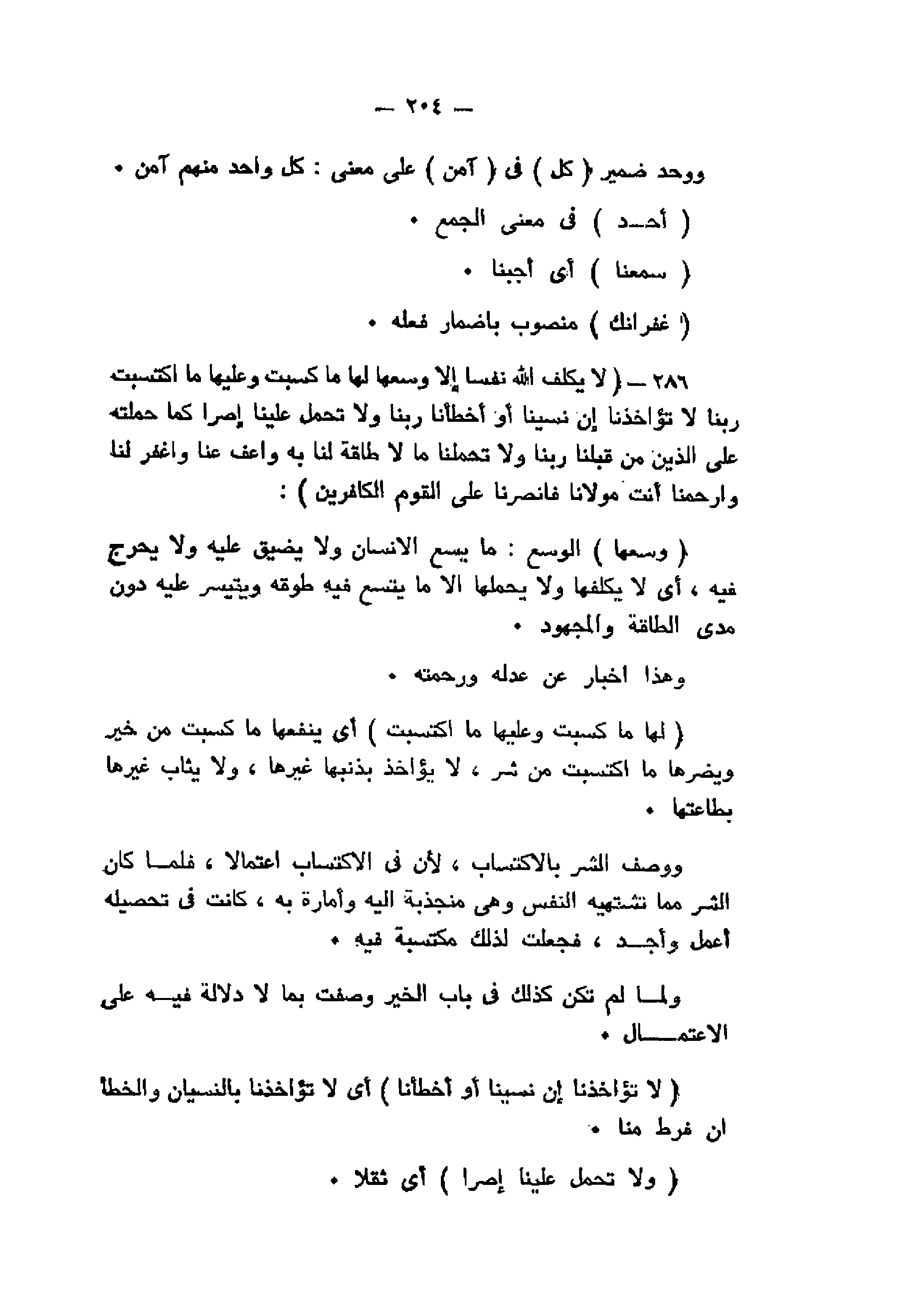 لا يُكَلِّفُ اللَّهُ نَفْساً إِلاَّ وُسْعَها لَها ما كَسَبَتْ وَعَلَيْها مَا اكْتَسَبَتْ رَبَّنا لا تُؤاخِذْنا إِنْ نَسِينا أَوْ أَخْطَأْنا رَبَّنا وَلا تَحْمِلْ عَلَيْنا إِصْراً كَما حَمَلْتَهُ عَلَى الَّذِينَ مِنْ قَبْلِنا رَبَّنا وَلا تُحَمِّلْنا ما لا طاقَةَ لَنا بِهِ وَاعْفُ عَنَّا وَاغْفِرْ لَنا وَارْحَمْنا أَنْتَ مَوْلانا فَانْصُرْنا عَلَى الْقَوْمِ الْكافِرِينَ (286)