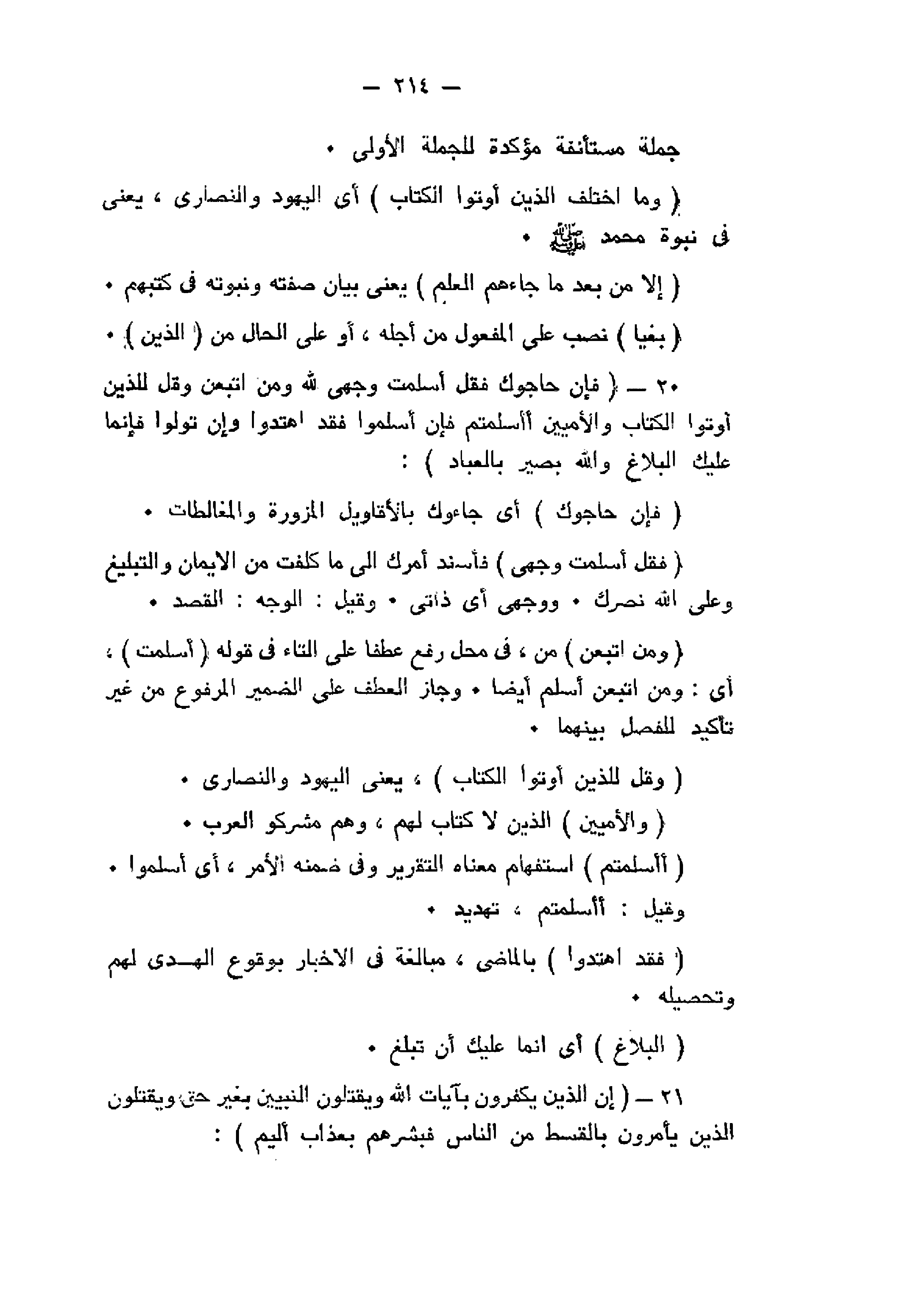 فَإِنْ حَاجُّوكَ فَقُلْ أَسْلَمْتُ وَجْهِيَ لِلَّهِ وَمَنِ اتَّبَعَنِ وَقُلْ لِلَّذِينَ أُوتُوا الْكِتابَ وَالْأُمِّيِّينَ أَأَسْلَمْتُمْ فَإِنْ أَسْلَمُوا فَقَدِ اهْتَدَوْا وَإِنْ تَوَلَّوْا فَإِنَّما عَلَيْكَ الْبَلاغُ وَاللَّهُ بَصِيرٌ بِالْعِبادِ (20) إِنَّ الَّذِينَ يَكْفُرُونَ بِآياتِ اللَّهِ وَيَقْتُلُونَ النَّبِيِّينَ بِغَيْرِ حَقٍّ وَيَقْتُلُونَ الَّذِينَ يَأْمُرُونَ بِالْقِسْطِ مِنَ النَّاسِ فَبَشِّرْهُمْ بِعَذابٍ أَلِيمٍ (21)