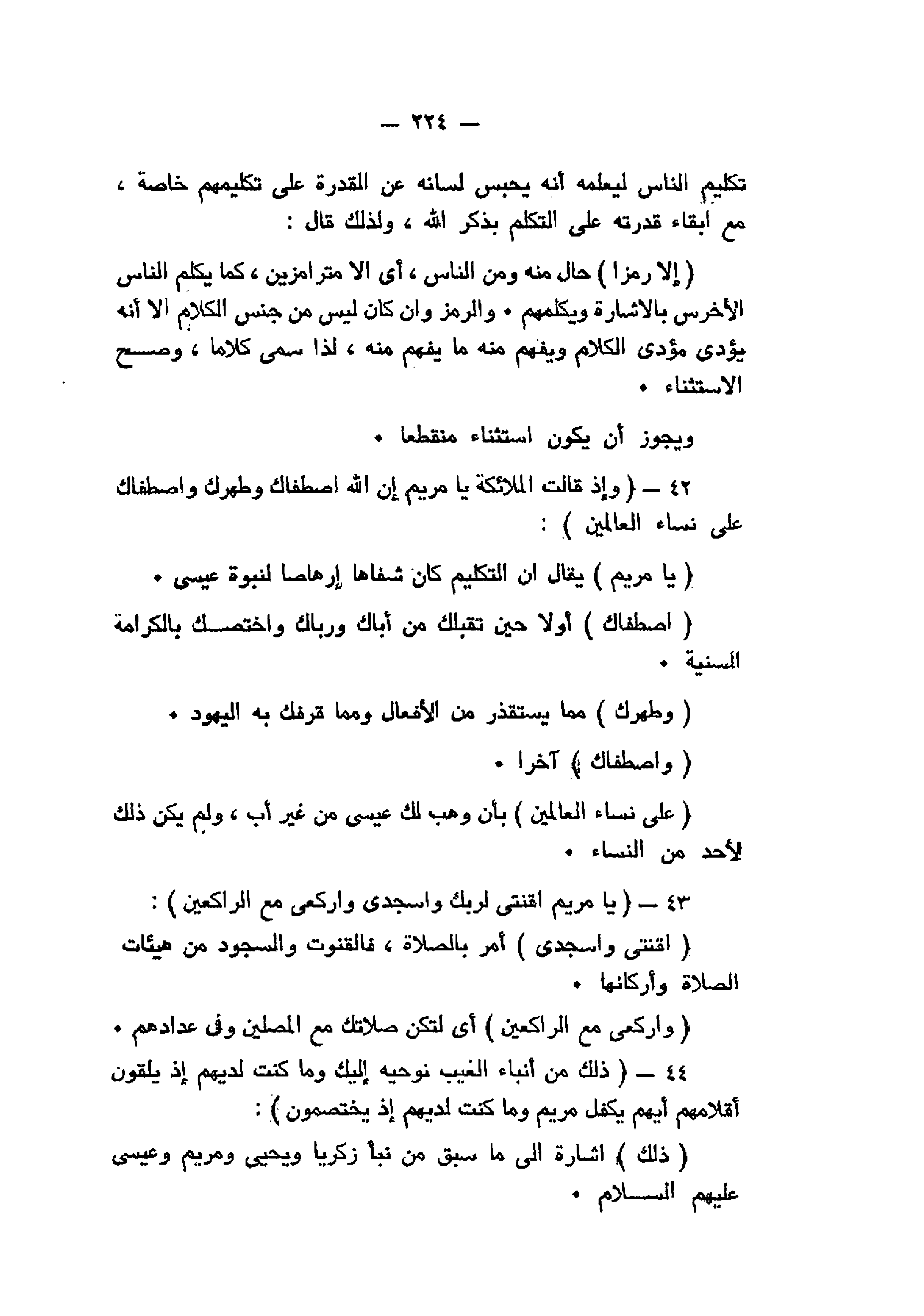 وَإِذْ قالَتِ الْمَلائِكَةُ يا مَرْيَمُ إِنَّ اللَّهَ اصْطَفاكِ وَطَهَّرَكِ وَاصْطَفاكِ عَلى نِساءِ الْعالَمِينَ (42) يا مَرْيَمُ اقْنُتِي لِرَبِّكِ وَاسْجُدِي وَارْكَعِي مَعَ الرَّاكِعِينَ (43) ذلِكَ مِنْ أَنْباءِ الْغَيْبِ نُوحِيهِ إِلَيْكَ وَما كُنْتَ لَدَيْهِمْ إِذْ يُلْقُونَ أَقْلامَهُمْ أَيُّهُمْ يَكْفُلُ مَرْيَمَ وَما كُنْتَ لَدَيْهِمْ إِذْ يَخْتَصِمُونَ (44)