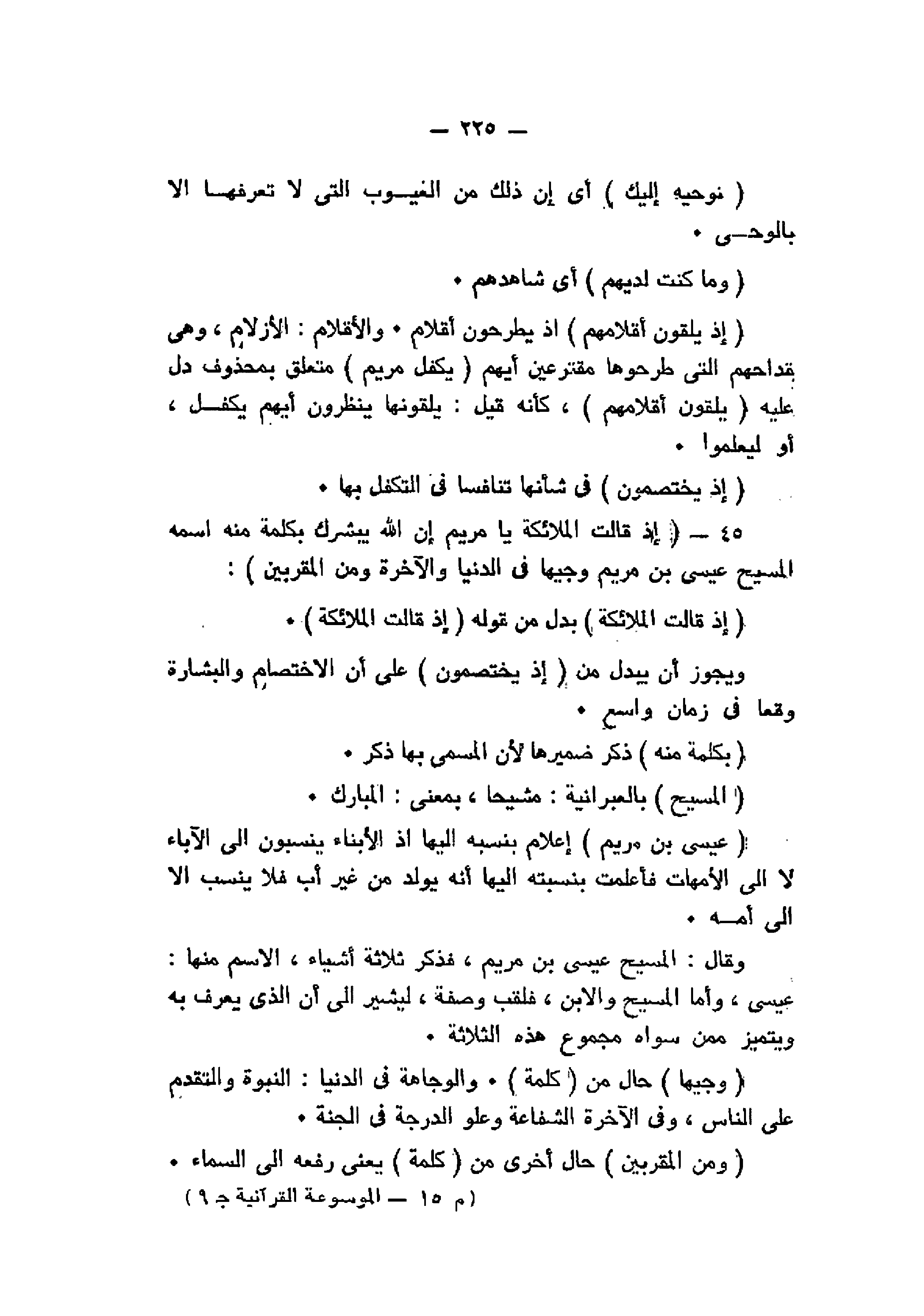 عِيسَى ابْنُ مَرْيَمَ إعلام بنسبه إليها إذ الأبناء ينسبون الى الآباء لا الى الأمهات فأعلمت بنسبته إليها أنه يولد من غير أب فلا ينسب الا الى أمه.