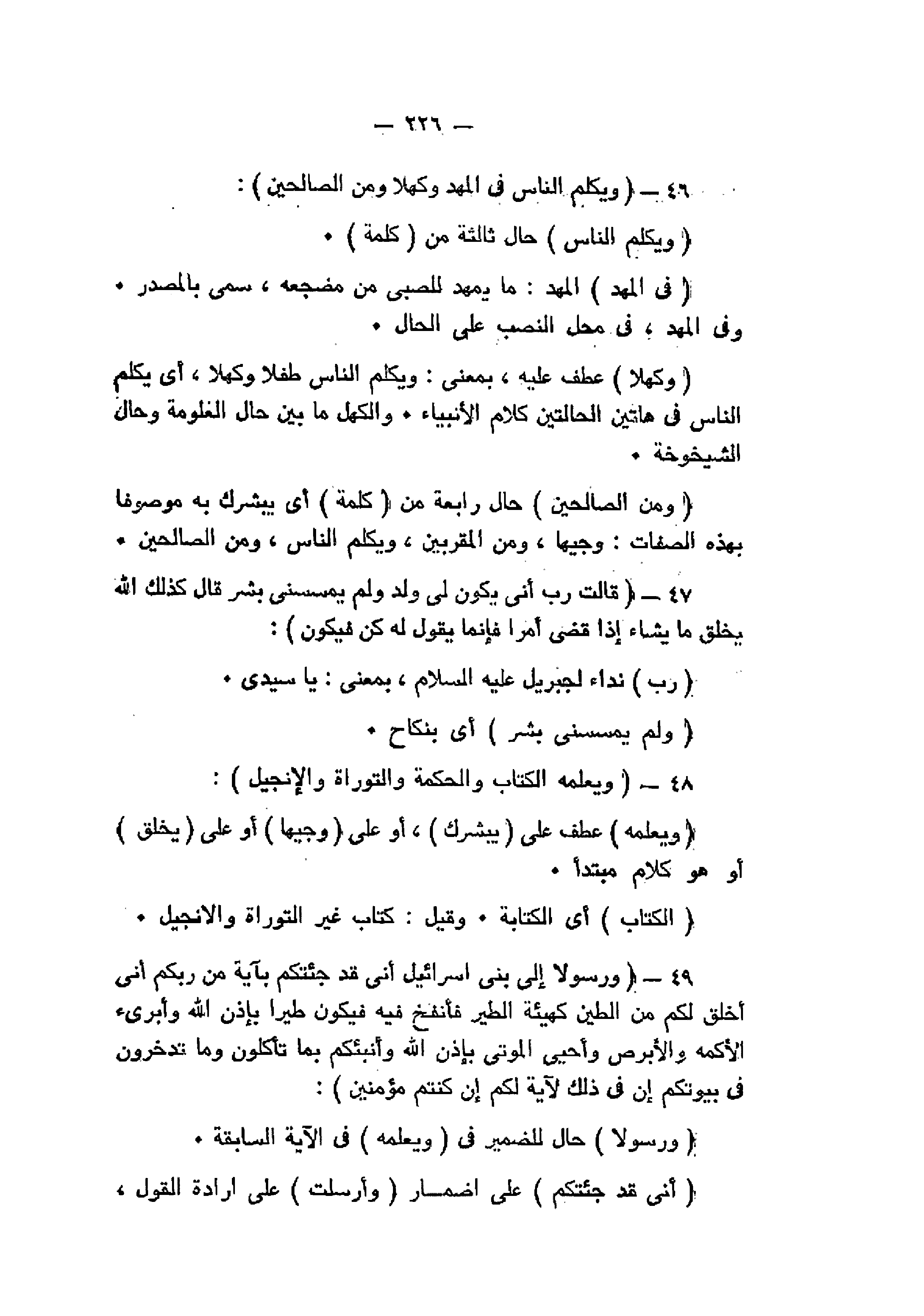 وَيُكَلِّمُ النَّاسَ فِي الْمَهْدِ وَكَهْلاً وَمِنَ الصَّالِحِينَ (46) قالَتْ رَبِّ أَنَّى يَكُونُ لِي وَلَدٌ وَلَمْ يَمْسَسْنِي بَشَرٌ قالَ كَذلِكِ اللَّهُ يَخْلُقُ ما يَشاءُ إِذا قَضى أَمْراً فَإِنَّما يَقُولُ لَهُ كُنْ فَيَكُونُ (47) وَيُعَلِّمُهُ الْكِتابَ وَالْحِكْمَةَ وَالتَّوْراةَ وَالْإِنْجِيلَ (48) وَرَسُولاً إِلى بَنِي إِسْرائِيلَ أَنِّي قَدْ جِئْتُكُمْ بِآيَةٍ مِنْ رَبِّكُمْ أَنِّي أَخْلُقُ لَكُمْ مِنَ الطِّينِ كَهَيْئَةِ الطَّيْرِ فَأَنْفُخُ فِيهِ فَيَكُونُ طَيْراً بِإِذْنِ اللَّهِ وَأُبْرِئُ الْأَكْمَهَ وَالْأَبْرَصَ وَأُحْيِ الْمَوْتى بِإِذْنِ اللَّهِ وَأُنَبِّئُكُمْ بِما تَأْكُلُونَ وَما تَدَّخِرُونَ فِي بُيُوتِكُمْ إِنَّ فِي ذلِكَ لَآيَةً لَكُمْ إِنْ كُنْتُمْ مُؤْمِنِينَ (49)