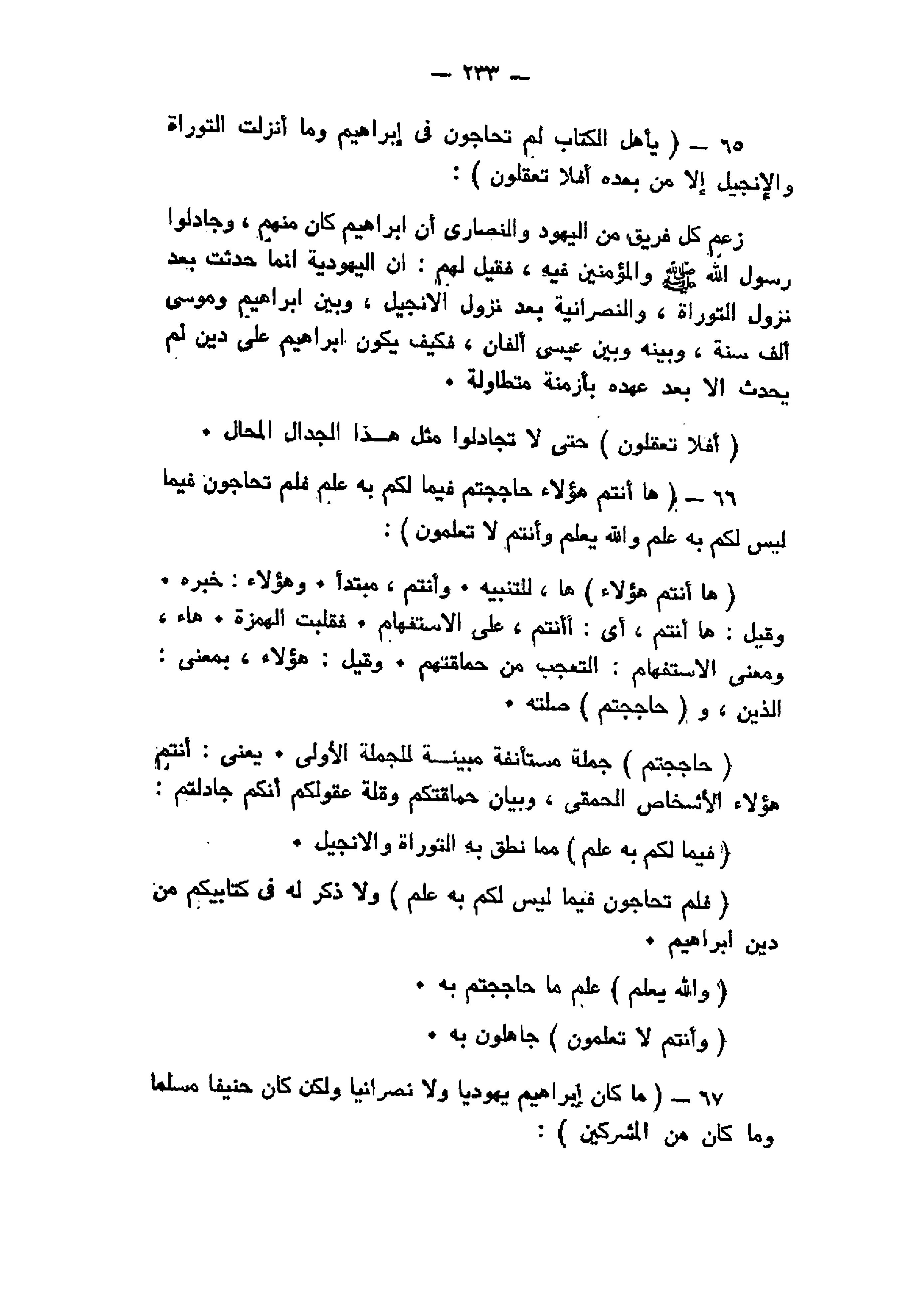 يا أَهْلَ الْكِتابِ لِمَ تُحَاجُّونَ فِي إِبْراهِيمَ وَما أُنْزِلَتِ التَّوْراةُ وَالْإِنْجِيلُ إِلاَّ مِنْ بَعْدِهِ أَفَلا تَعْقِلُونَ (65) ها أَنْتُمْ هؤُلاءِ حاجَجْتُمْ فِيما لَكُمْ بِهِ عِلْمٌ فَلِمَ تُحَاجُّونَ فِيما لَيْسَ لَكُمْ بِهِ عِلْمٌ وَاللَّهُ يَعْلَمُ وَأَنْتُمْ لا تَعْلَمُونَ (66) ما كانَ إِبْراهِيمُ يَهُودِيًّا وَلا نَصْرانِيًّا وَلكِنْ كانَ حَنِيفاً مُسْلِماً وَما كانَ مِنَ الْمُشْرِكِينَ (67)