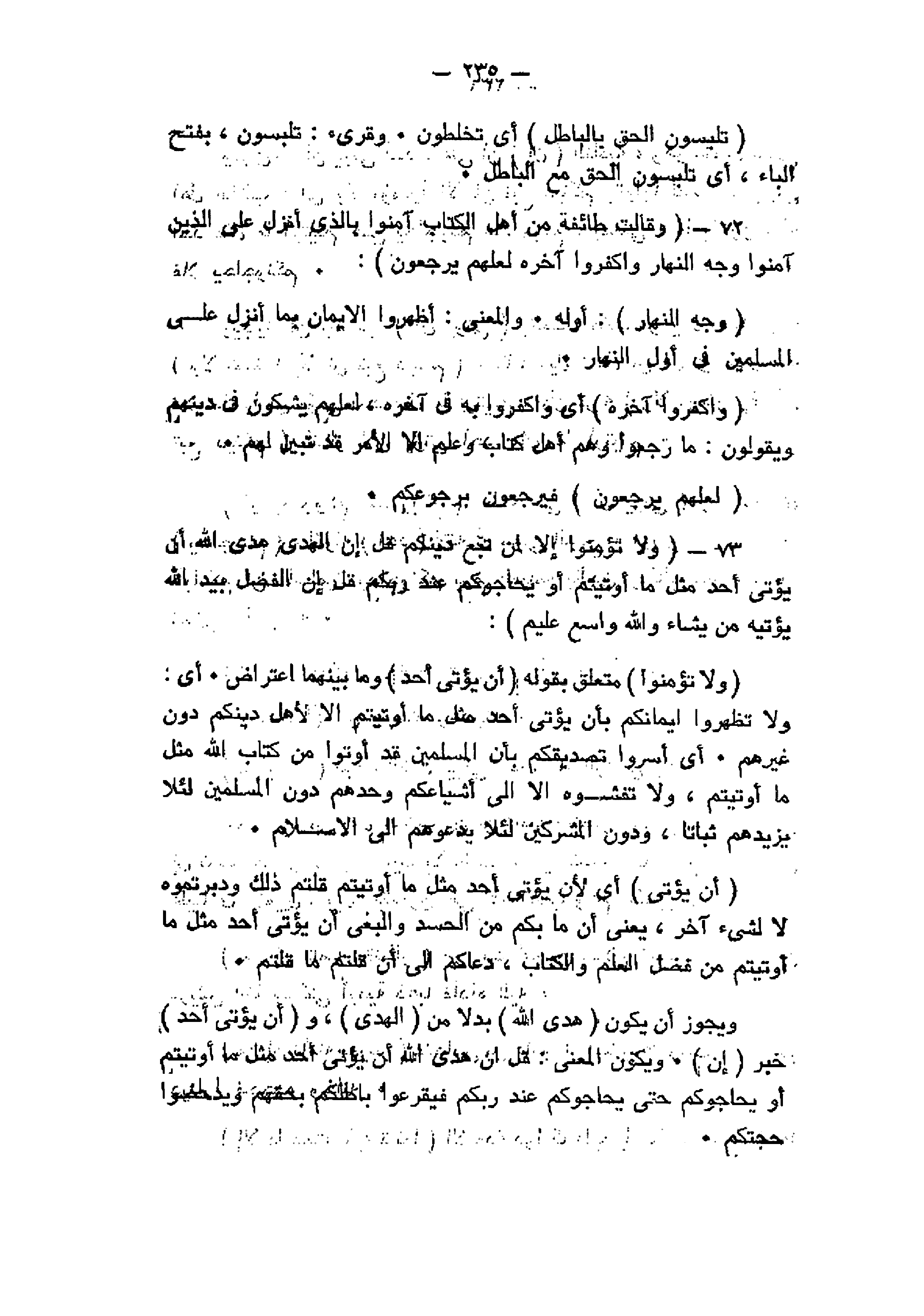 وَقالَتْ طائِفَةٌ مِنْ أَهْلِ الْكِتابِ آمِنُوا بِالَّذِي أُنْزِلَ عَلَى الَّذِينَ آمَنُوا وَجْهَ النَّهارِ وَاكْفُرُوا آخِرَهُ لَعَلَّهُمْ يَرْجِعُونَ (72) وَلا تُؤْمِنُوا إِلاَّ لِمَنْ تَبِعَ دِينَكُمْ قُلْ إِنَّ الْهُدى هُدَى اللَّهِ أَنْ يُؤْتى أَحَدٌ مِثْلَ ما أُوتِيتُمْ أَوْ يُحاجُّوكُمْ عِنْدَ رَبِّكُمْ قُلْ إِنَّ الْفَضْلَ بِيَدِ اللَّهِ يُؤْتِيهِ مَنْ يَشاءُ وَاللَّهُ واسِعٌ عَلِيمٌ (73)